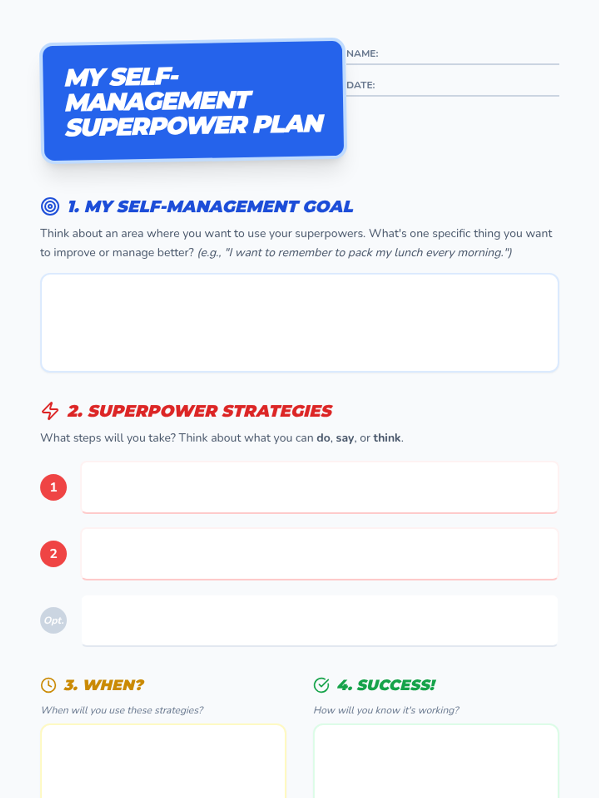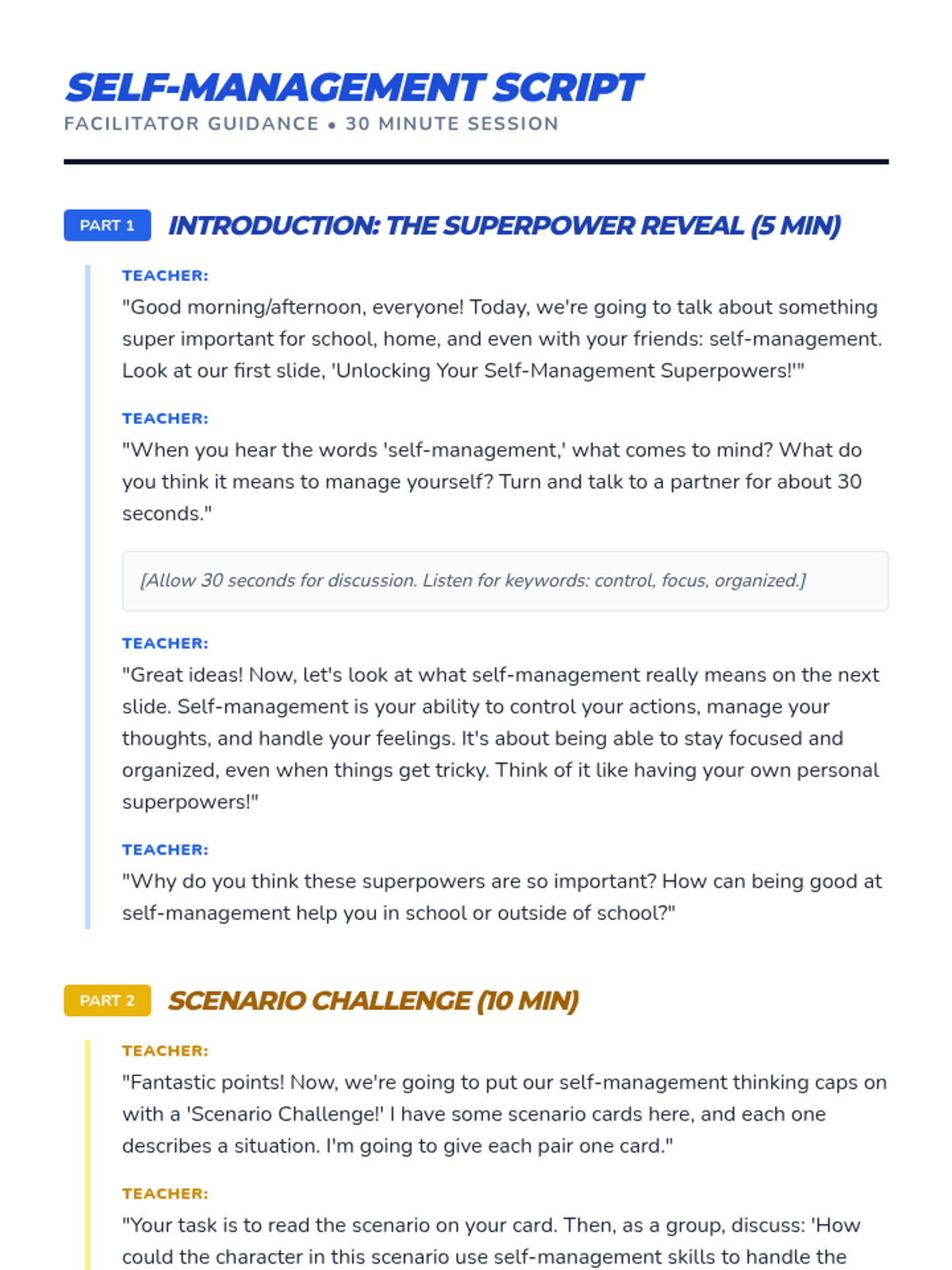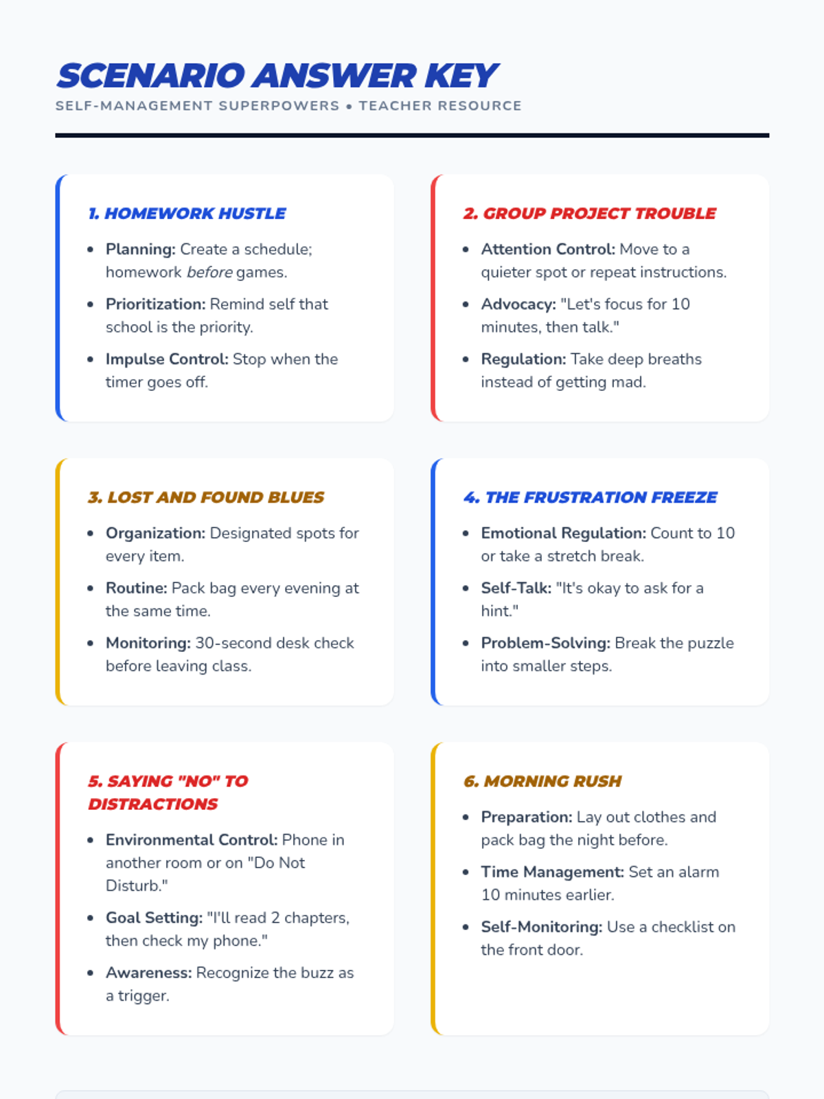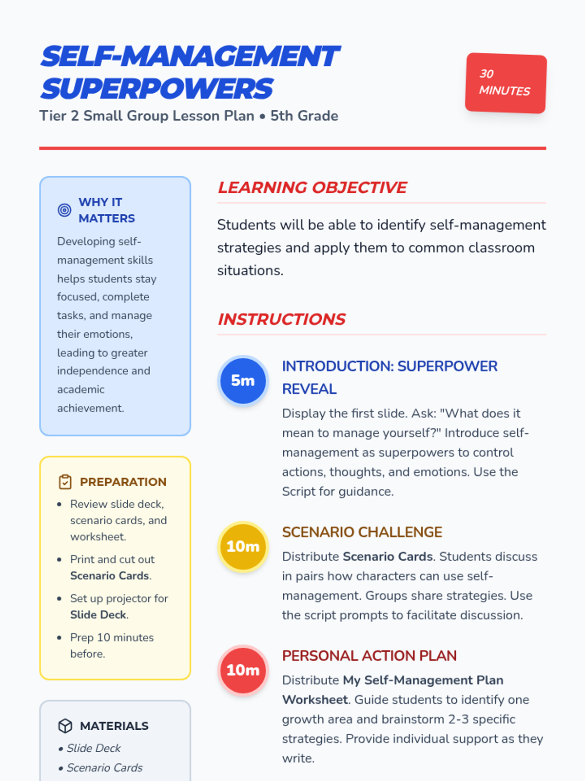 A 30-minute Tier 2 small group lesson for 5th graders to identify and practice self-management strategies using a superhero theme. Students explore scenarios and create a personal action plan.