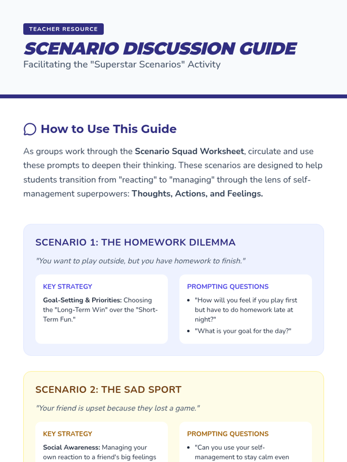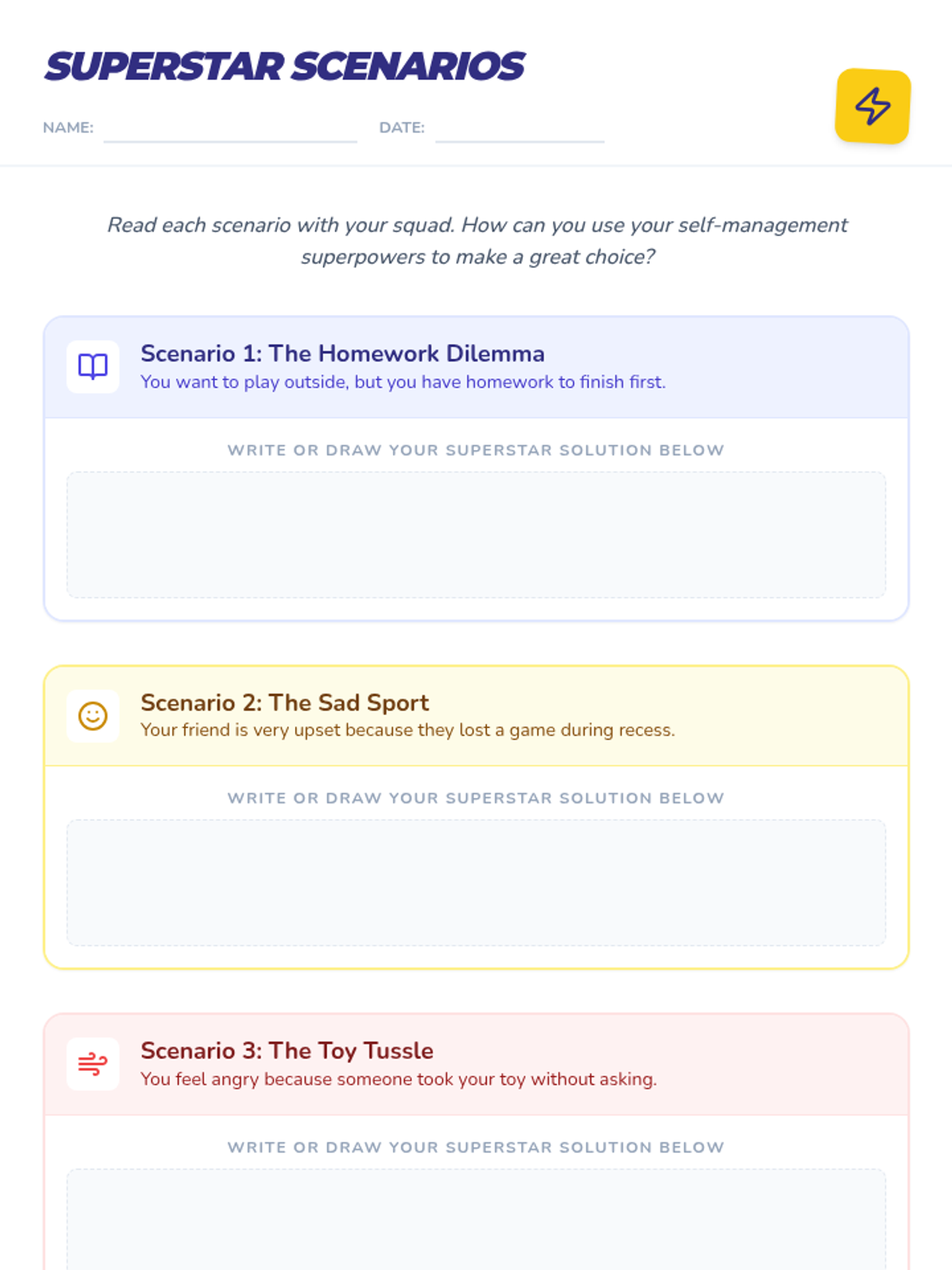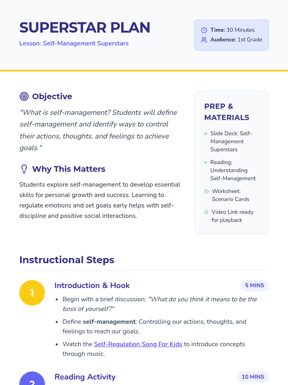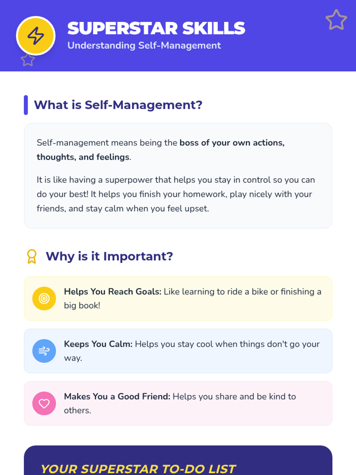 Students will explore the concept of self-management through engaging activities and discussions. They will learn what self-management means and how it can be applied in their daily lives to develop skills like self-discipline, goal-setting, and emotional regulation.