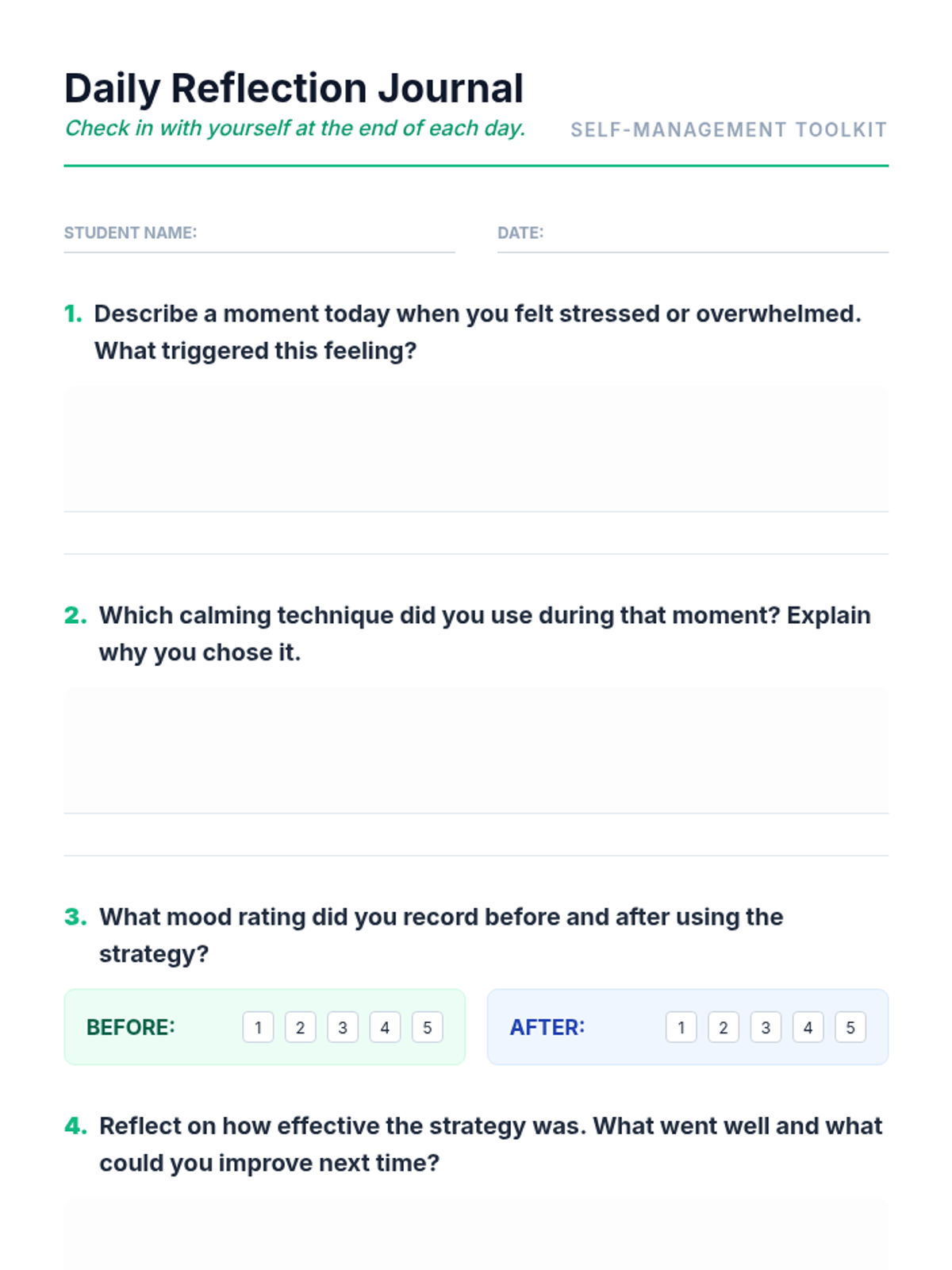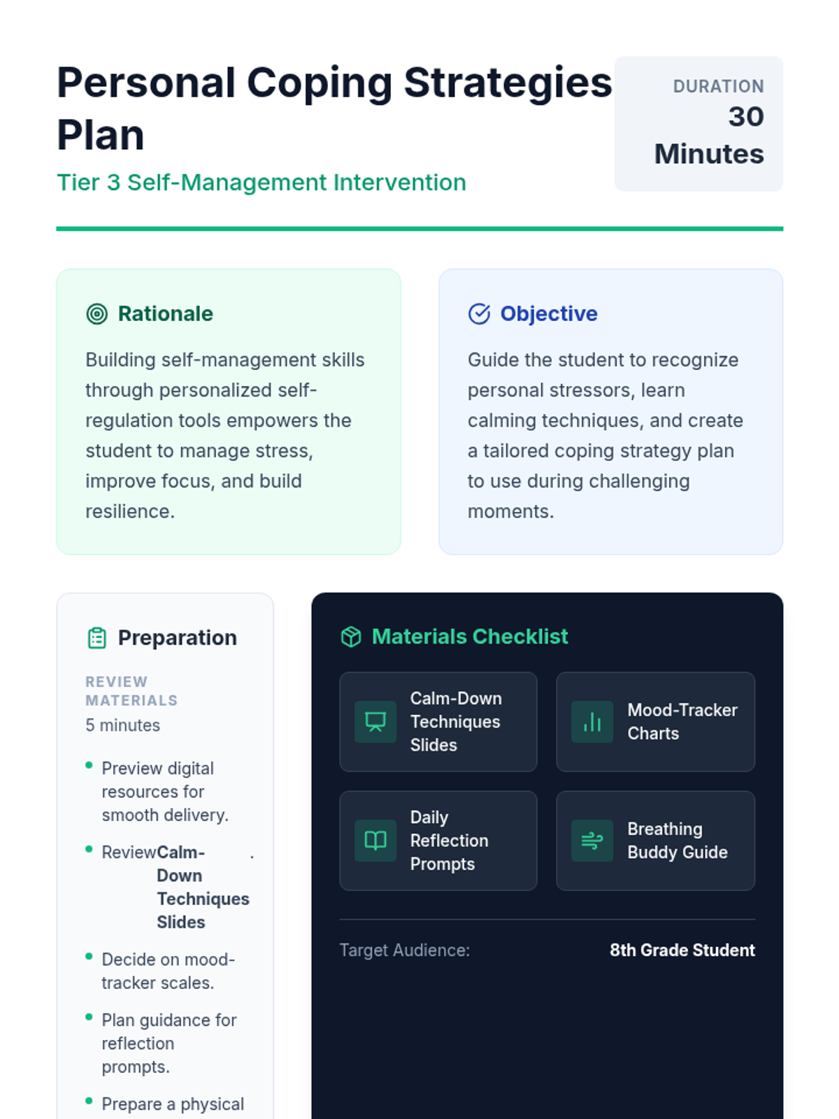 An individualized Tier 3 intervention for 8th-grade students to develop self-regulation strategies through personalized tools and practices.