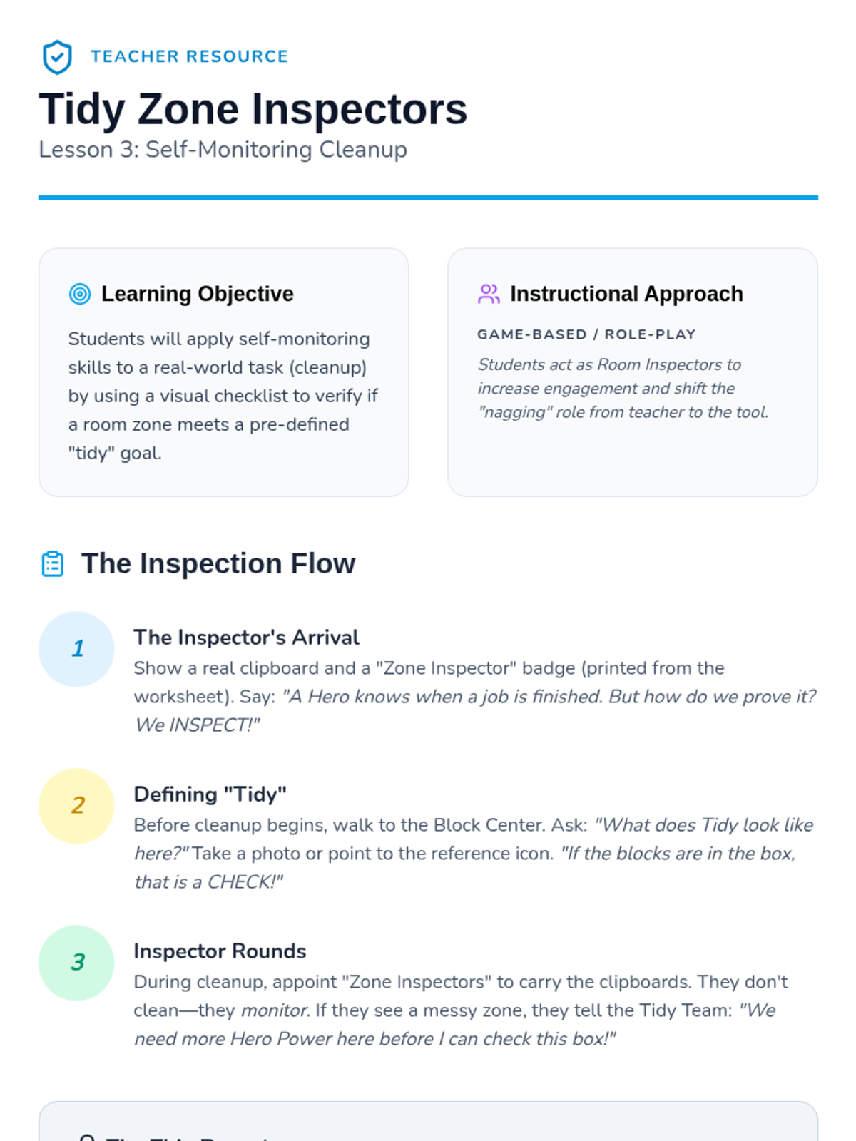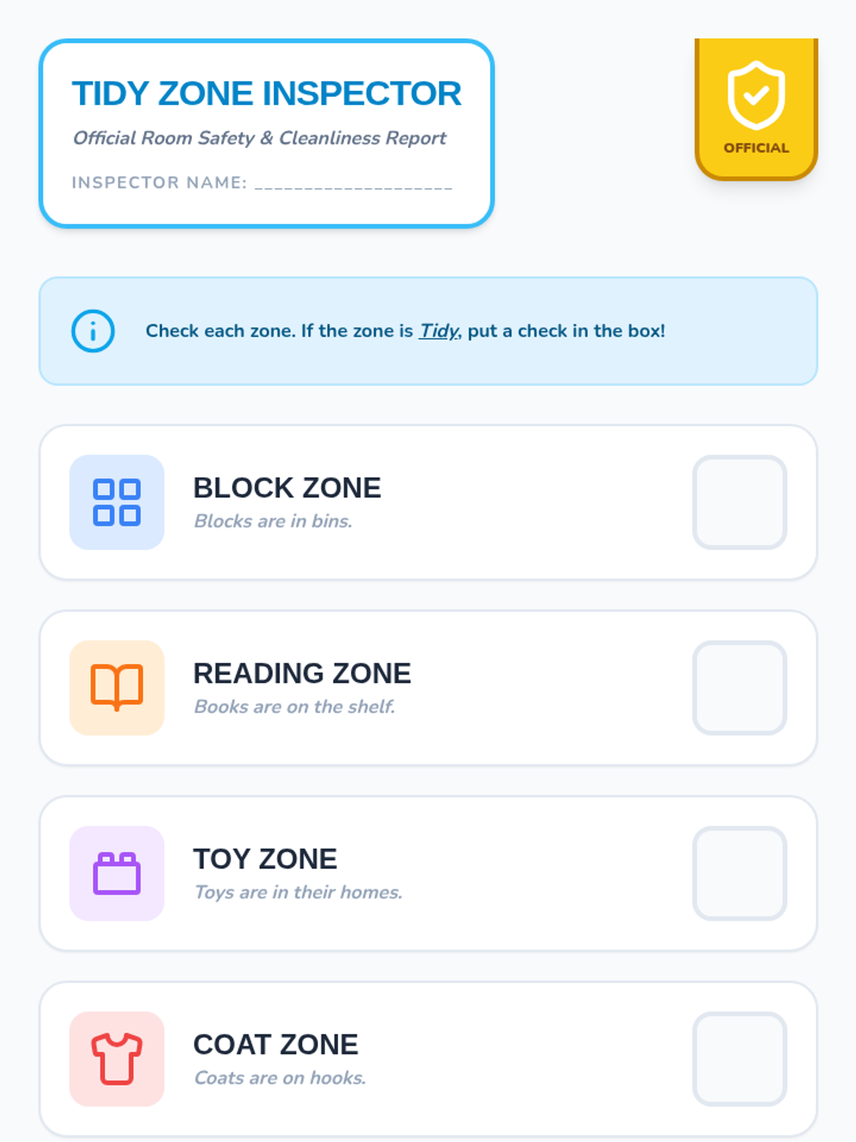 Students use a visual checklist during cleanup time to verify if different room zones meet the 'tidy' goal, acting as room inspectors.