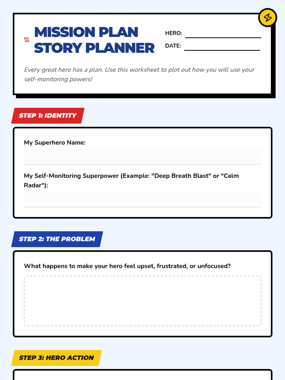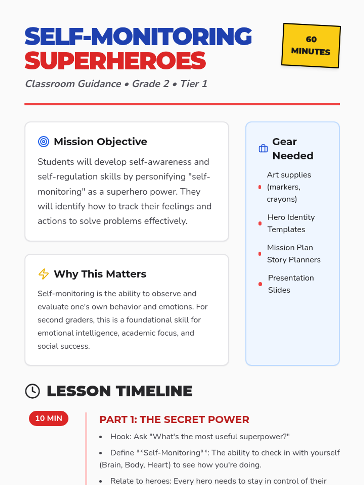 A lesson where students explore self-monitoring and self-regulation by creating their own superhero characters and stories, fostering emotional intelligence through creative expression.