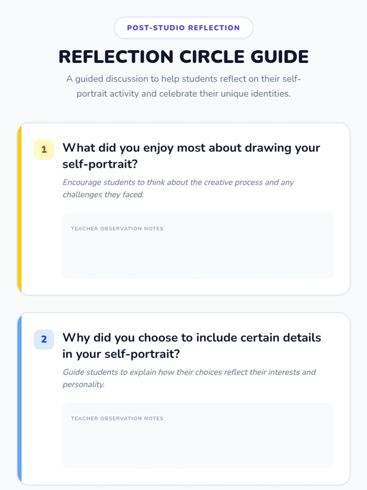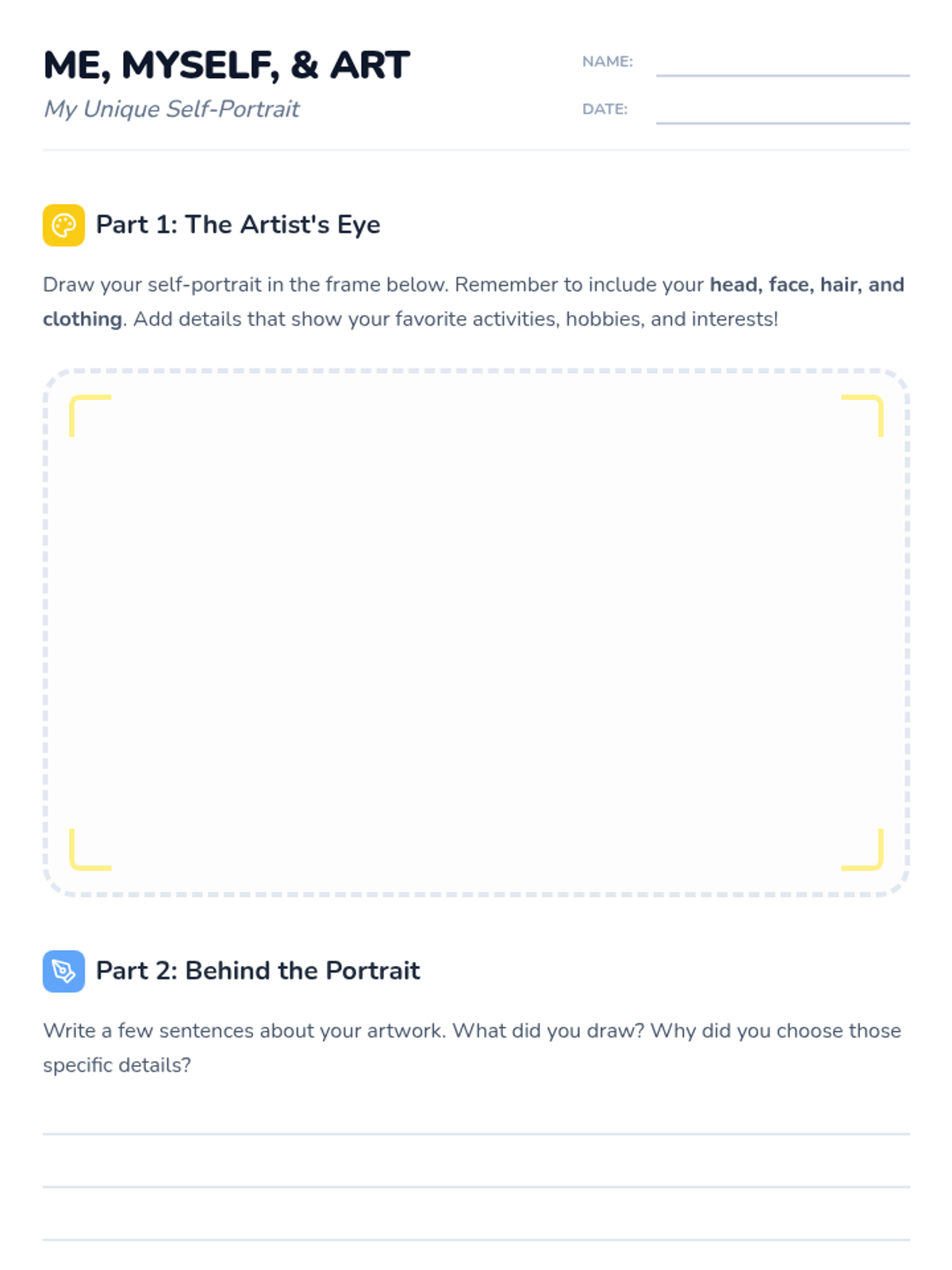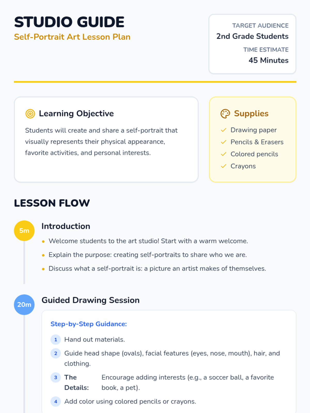 A creative art lesson for 2nd graders to express their identity through self-portraits and sharing. Students learn basic portrait drawing techniques and explore how to visually represent their interests.