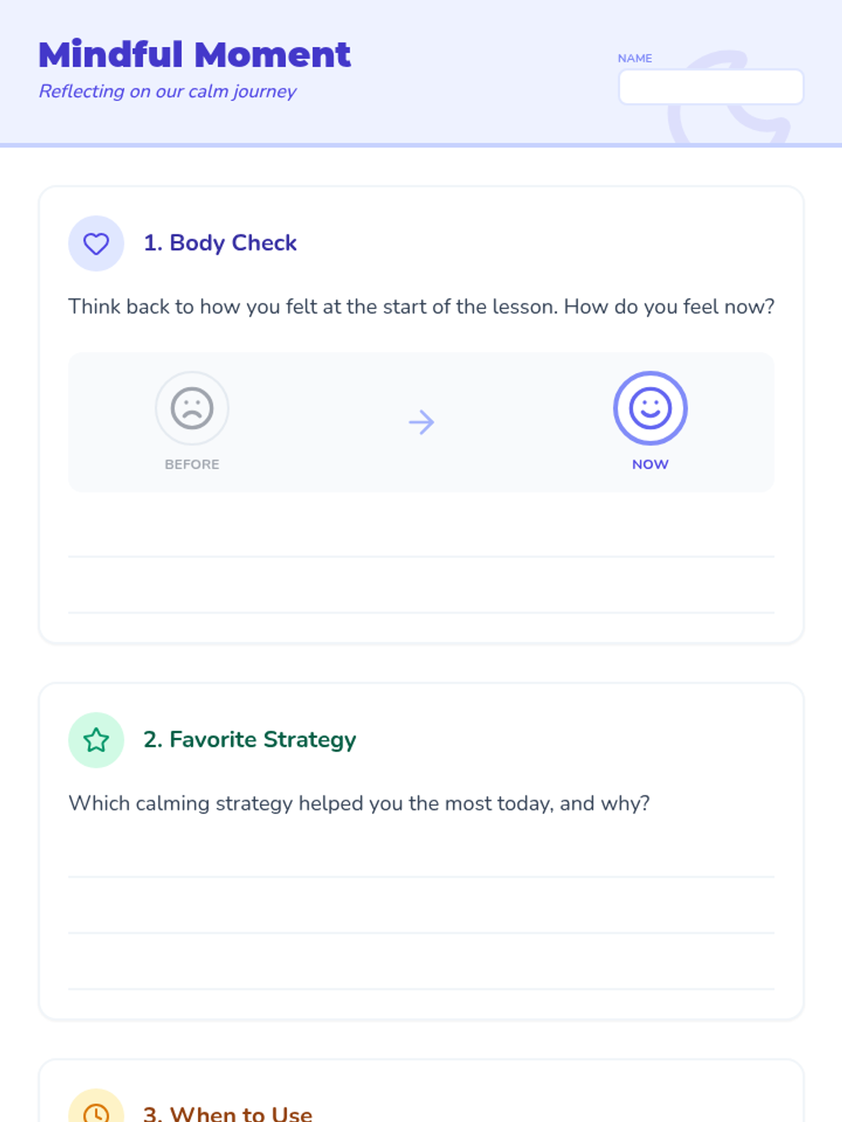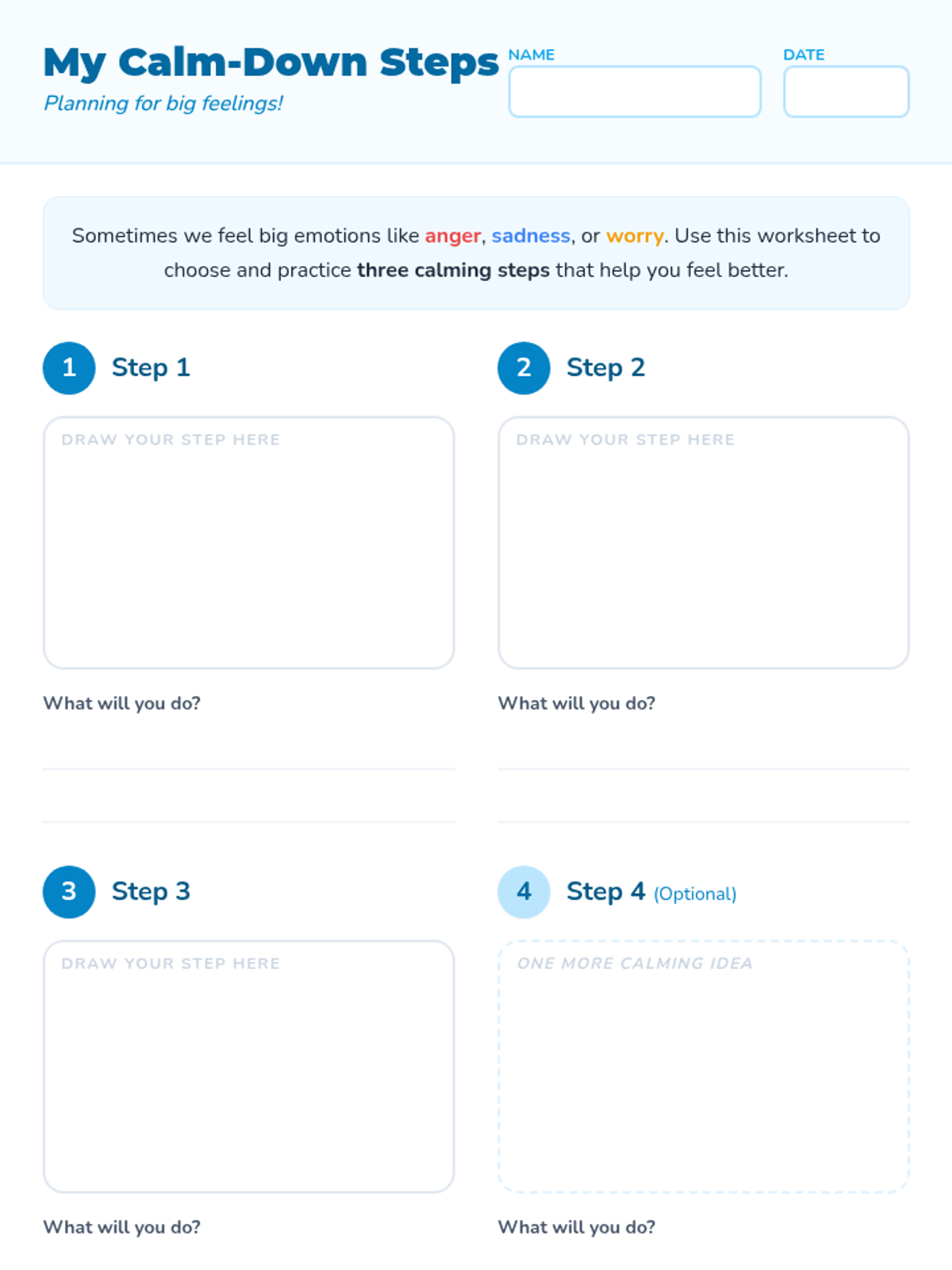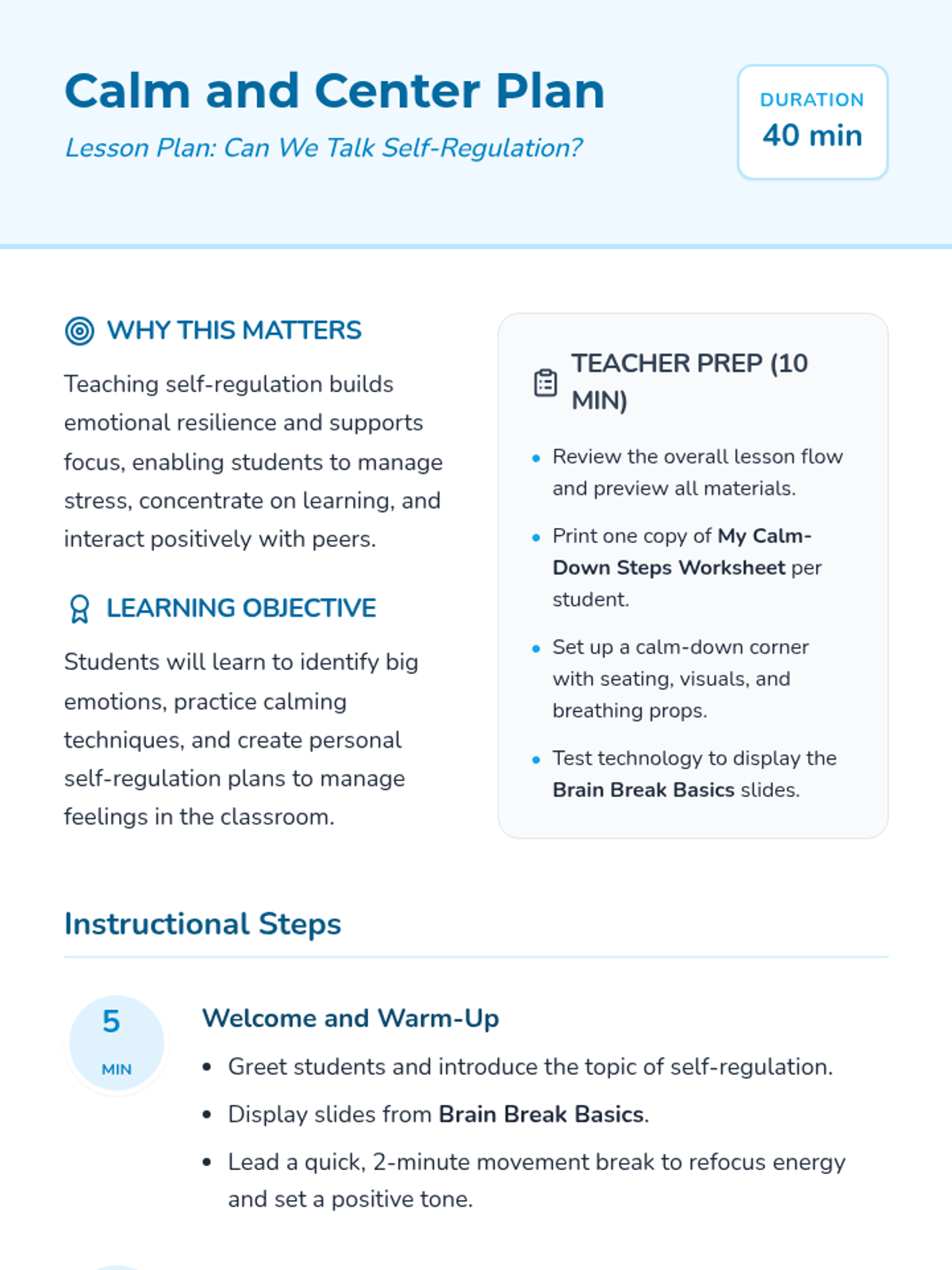 A 40-minute Tier 1 SEL lesson for 2nd graders focused on identifying big emotions, practicing calming techniques like deep breathing, and creating personal action plans for self-regulation.