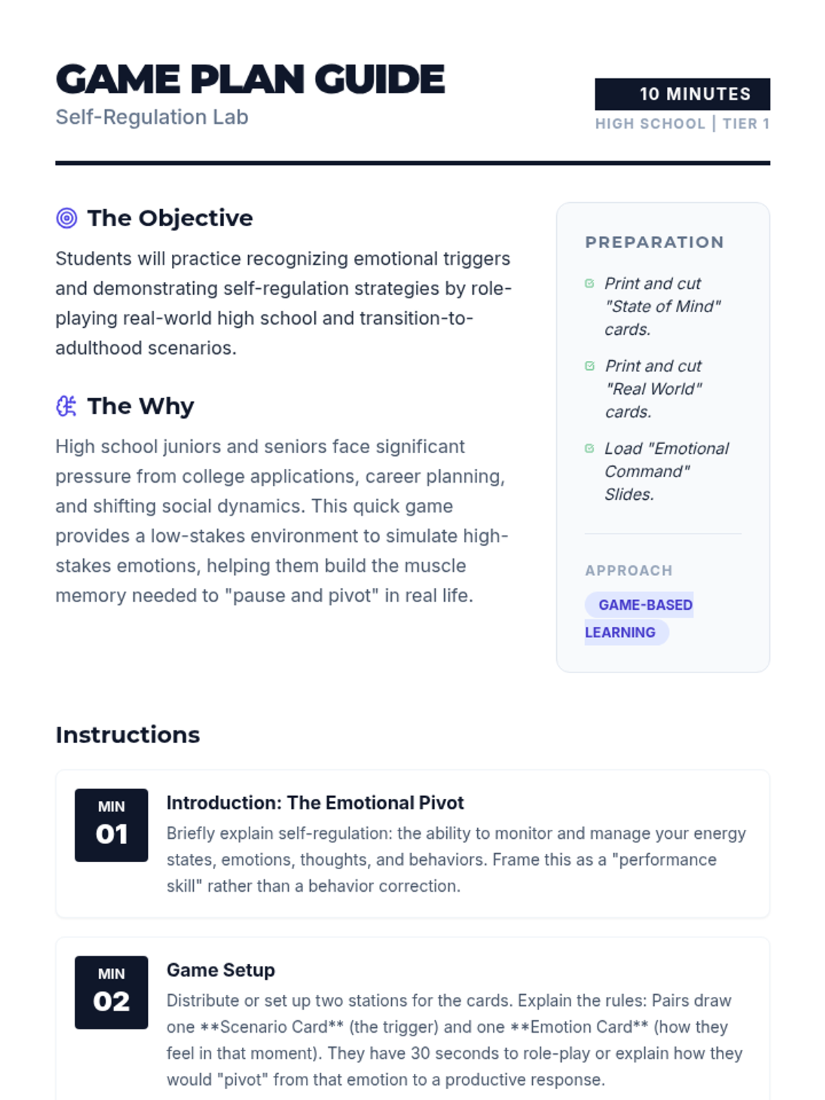 An interactive lesson that helps high schoolers recognize and manage emotions through a role-playing game, building critical self-regulation skills for personal and academic success.