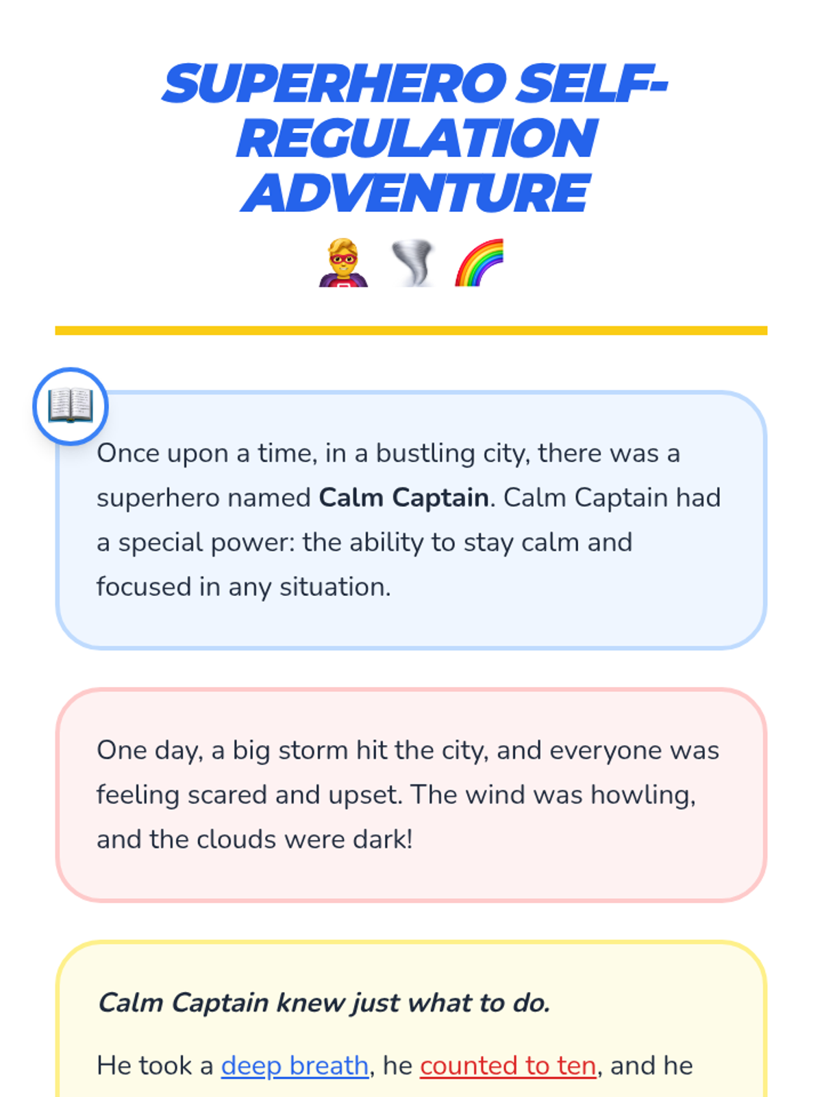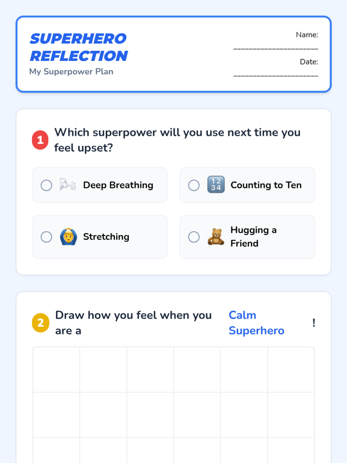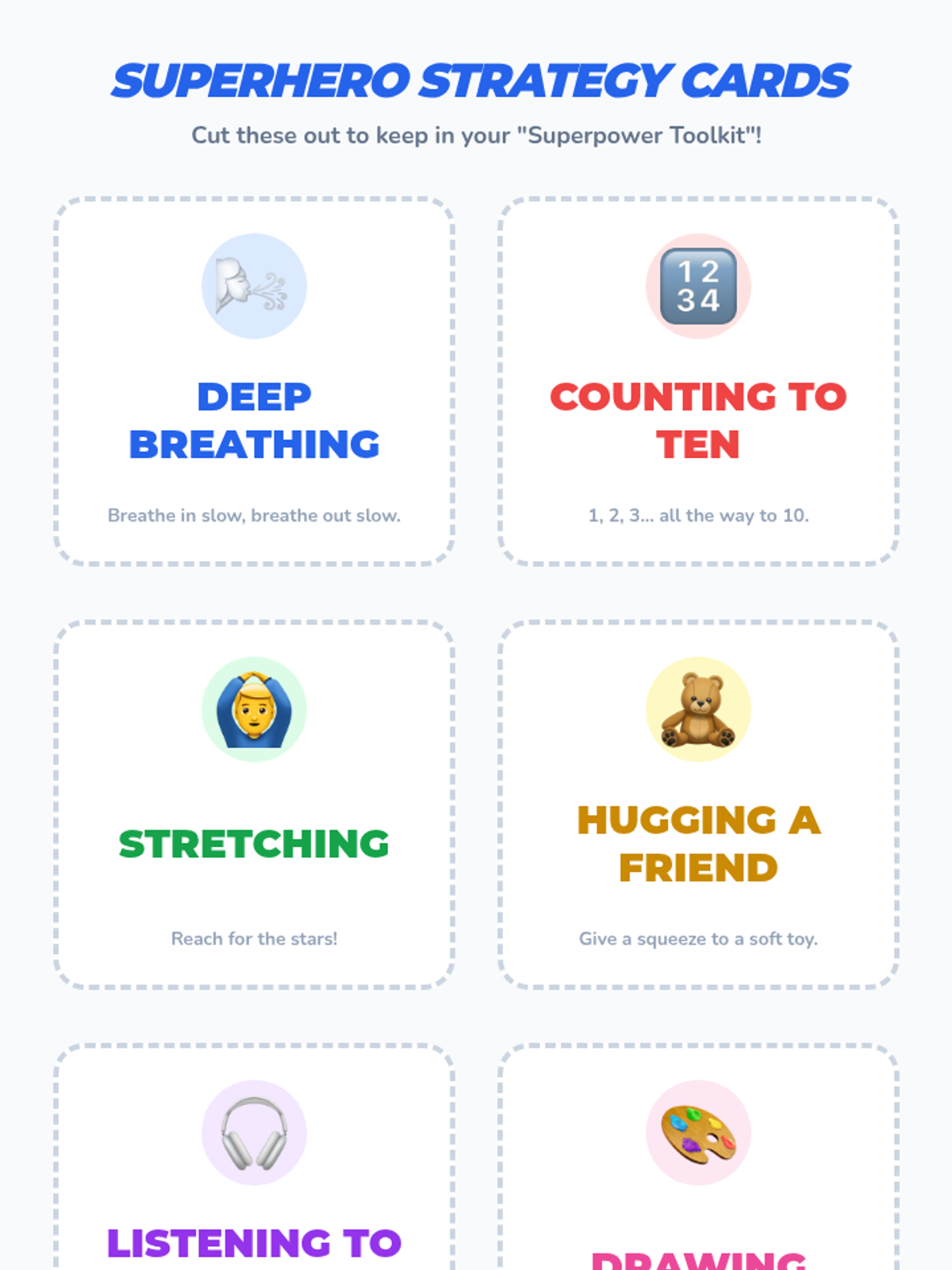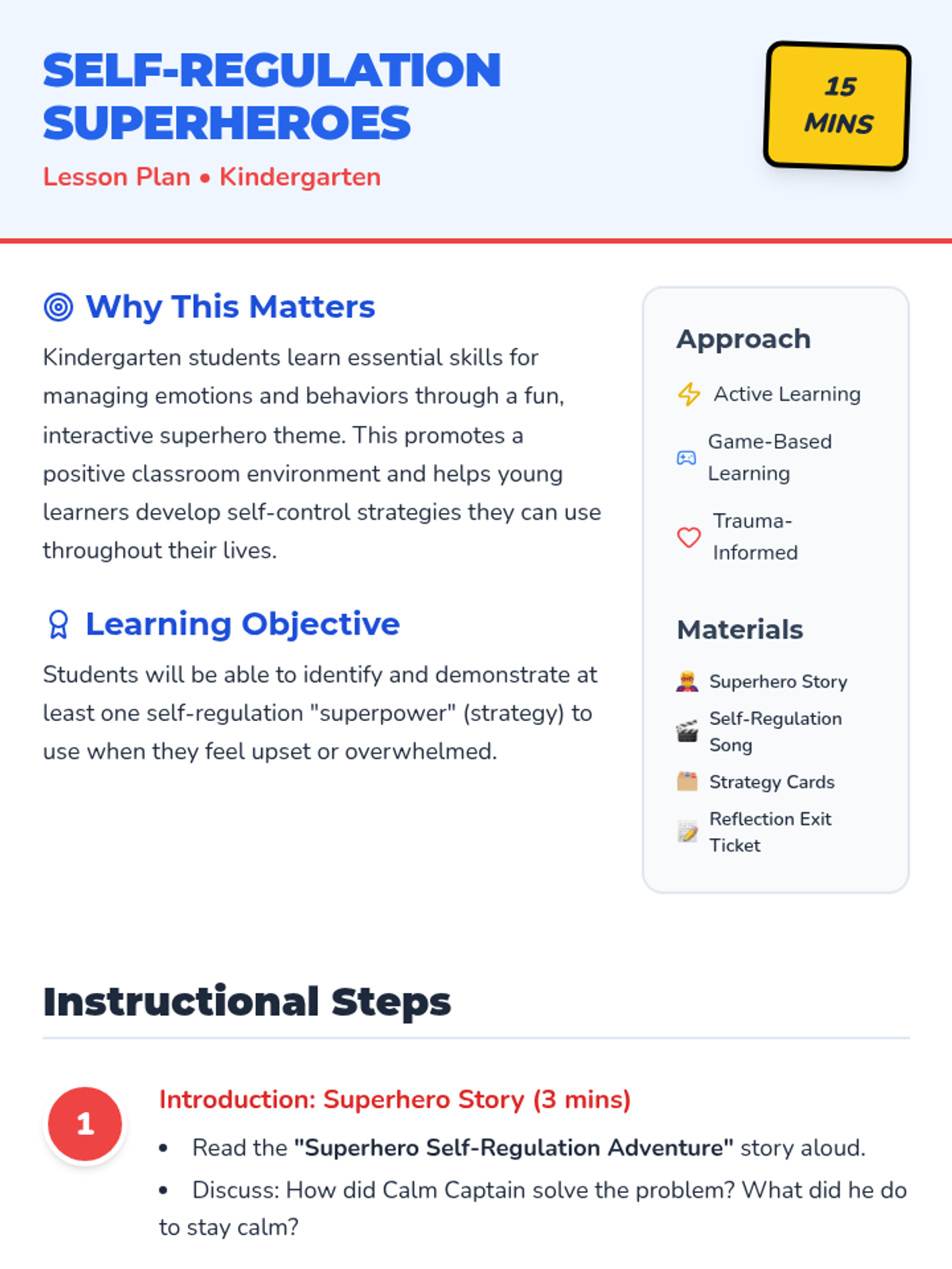 A kindergarten lesson using a superhero theme to teach self-regulation strategies like deep breathing and counting to ten through story, song, and interactive play.