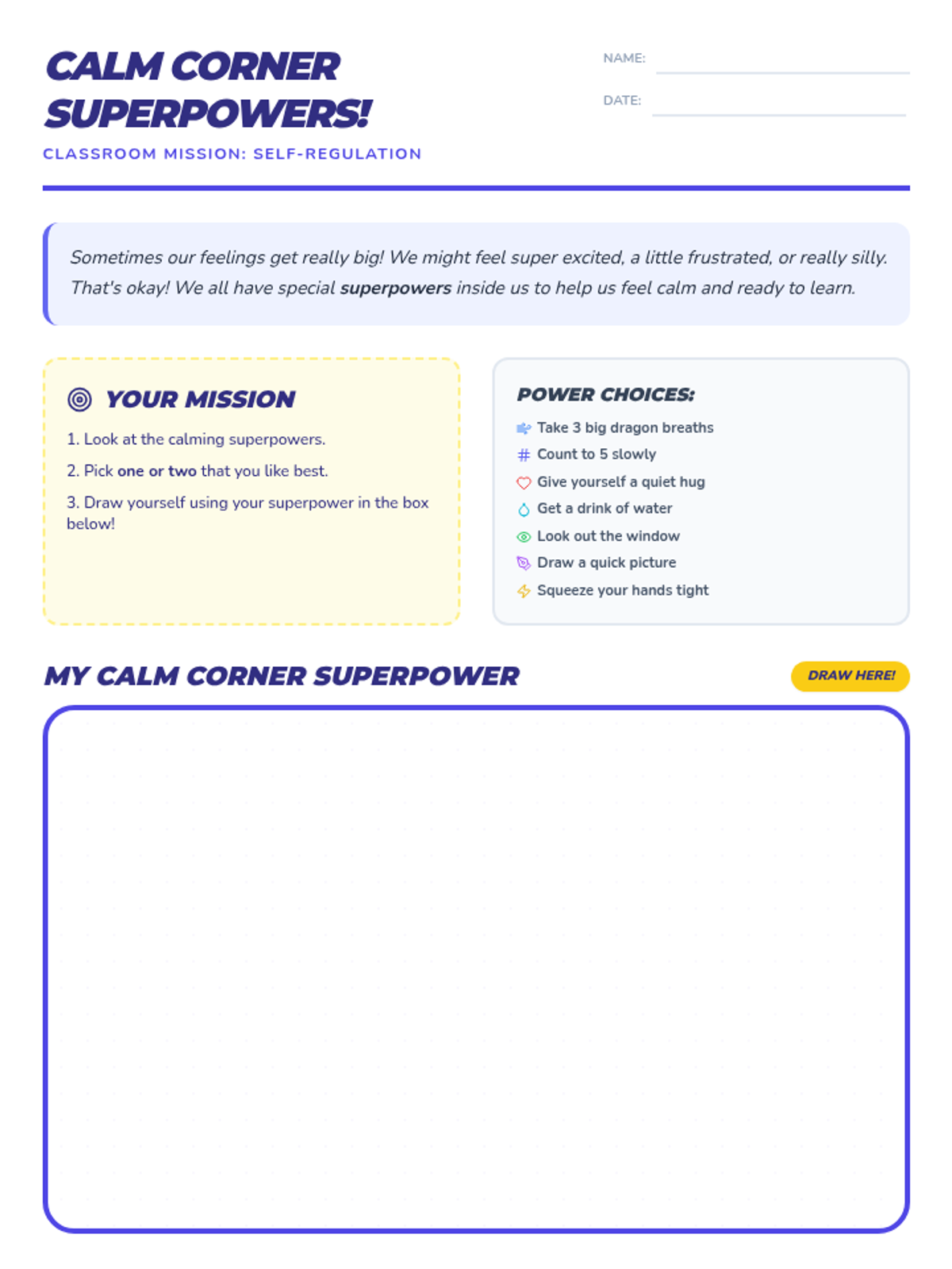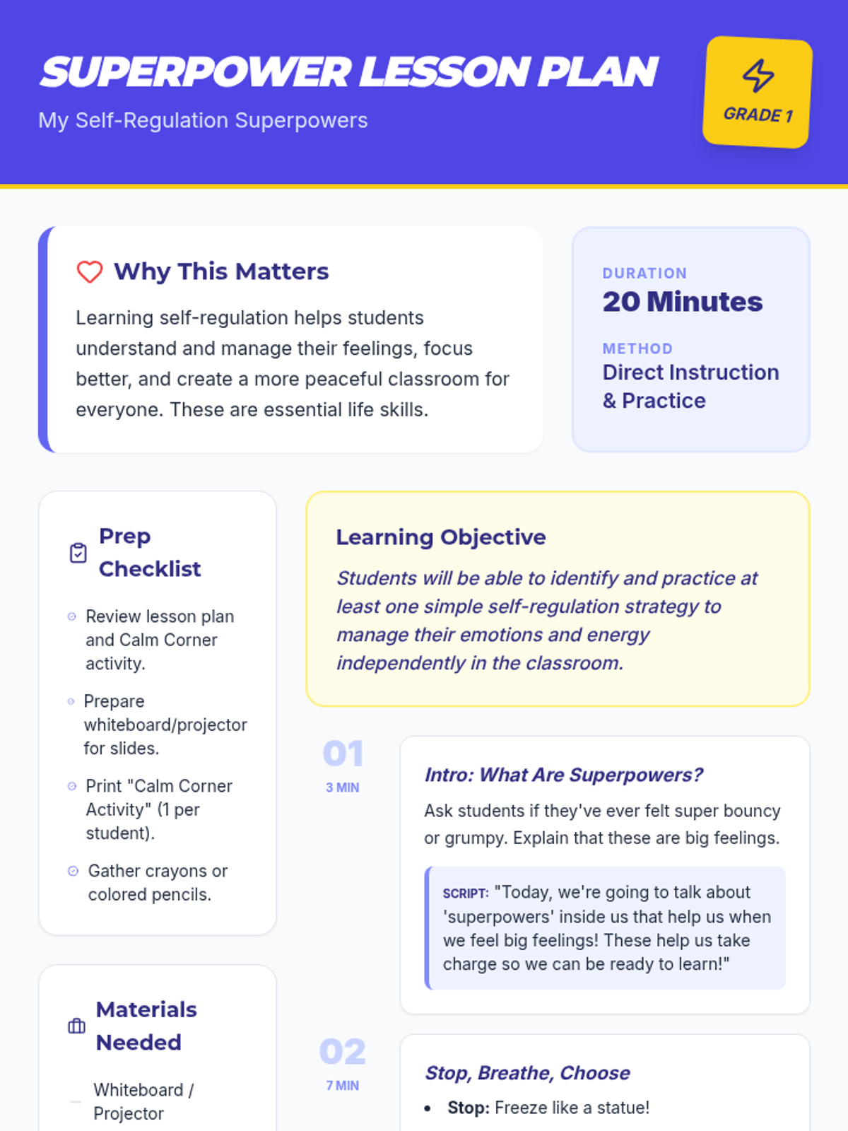 A 20-minute lesson for first graders that teaches self-regulation strategies using a superhero theme. Students learn the 'Stop, Breathe, Choose' method and identify personal 'Calm Corner' tools.