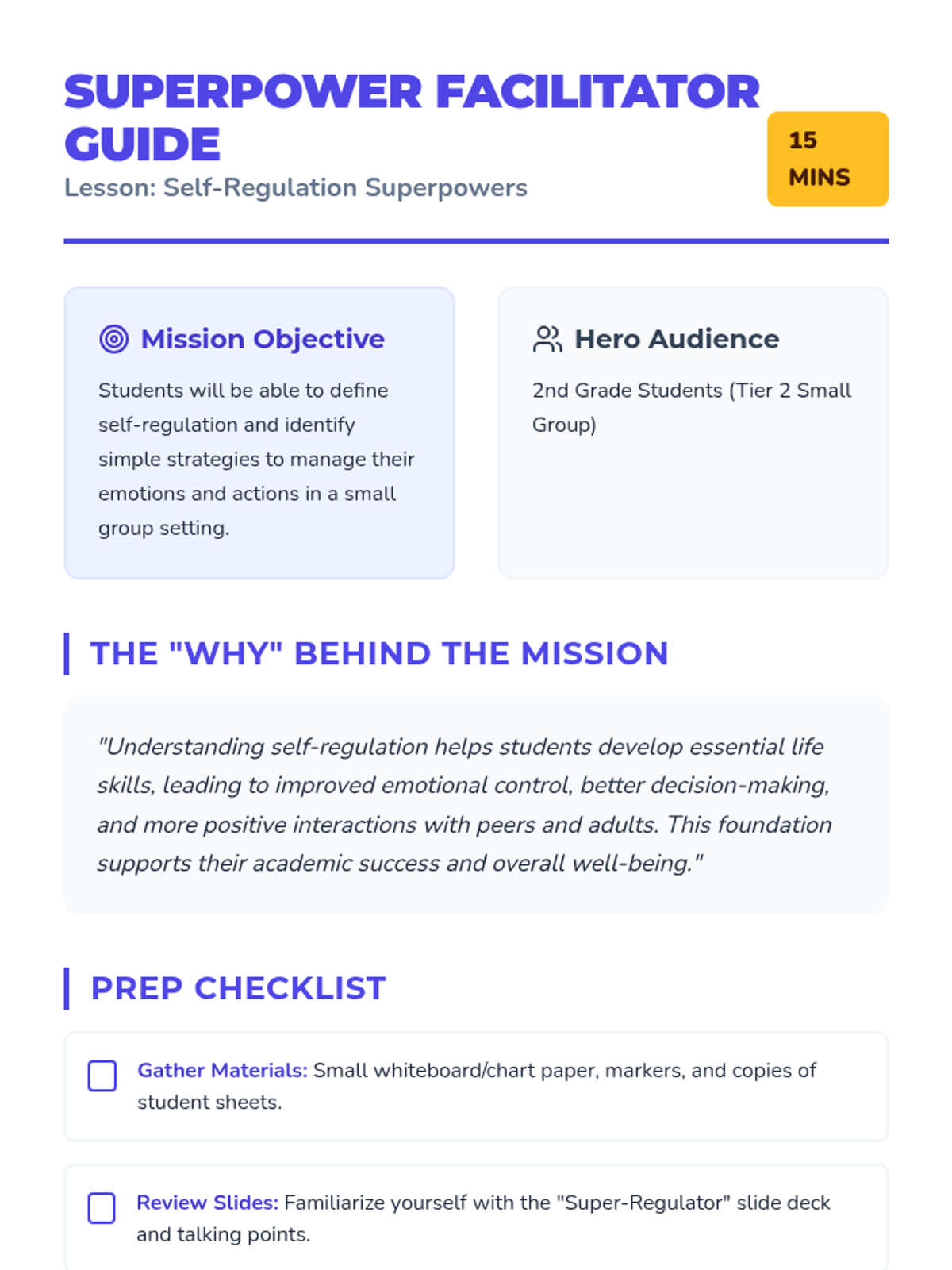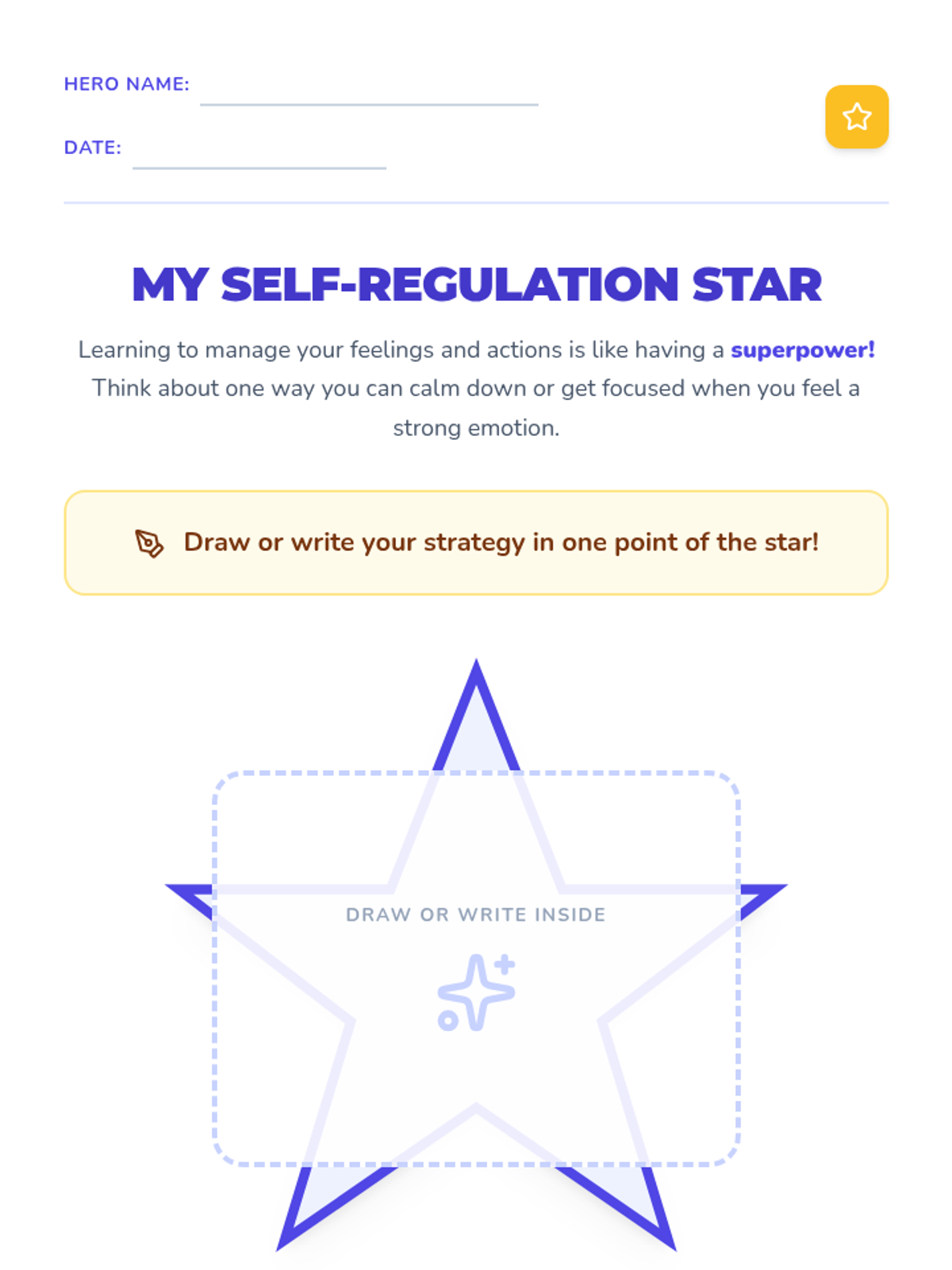 A 15-minute small group lesson for 2nd graders that introduces self-regulation as a 'superpower' for managing thoughts, feelings, and actions. Students will identify personal strategies for emotional control through interactive discussion and a creative star activity.