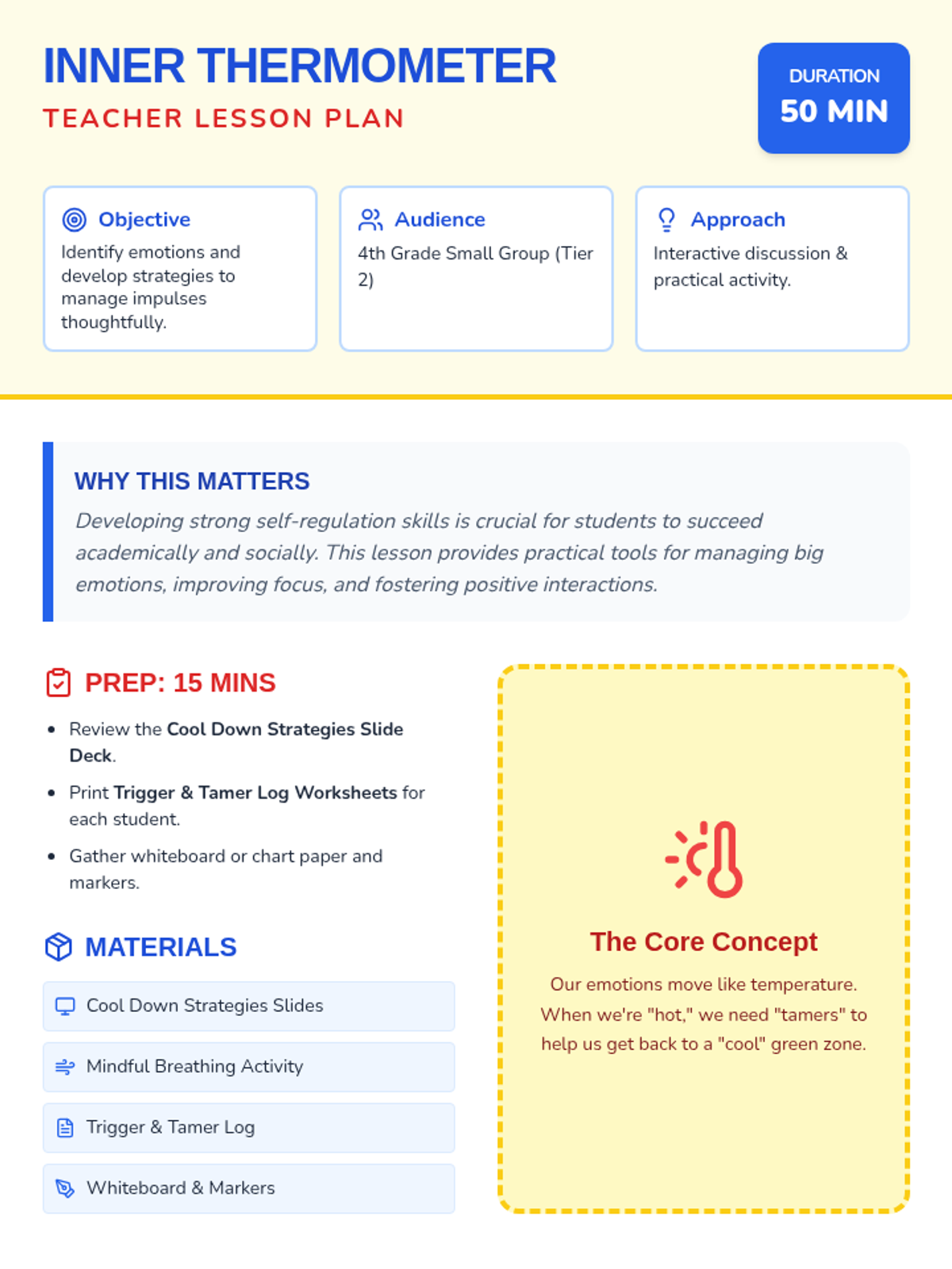 A small-group lesson for 4th graders focused on developing self-regulation skills using the 'Inner Thermometer' concept to manage impulses and emotions.