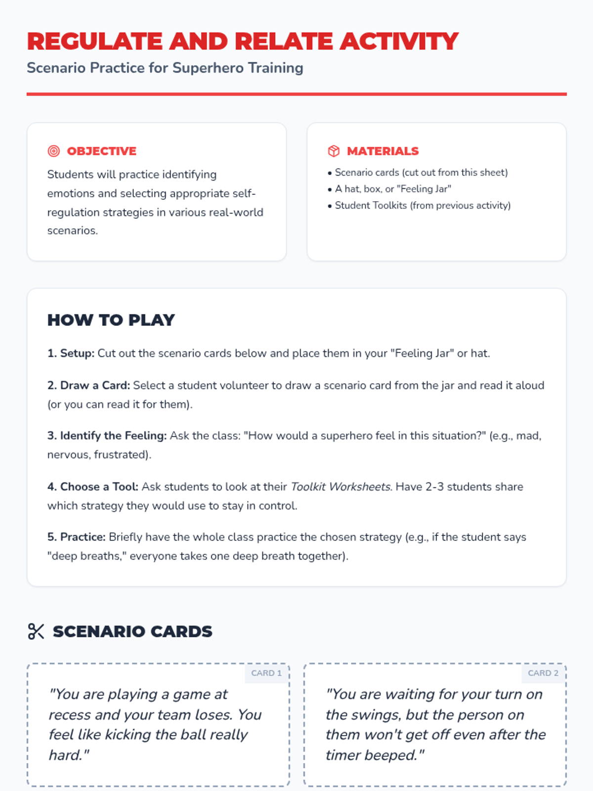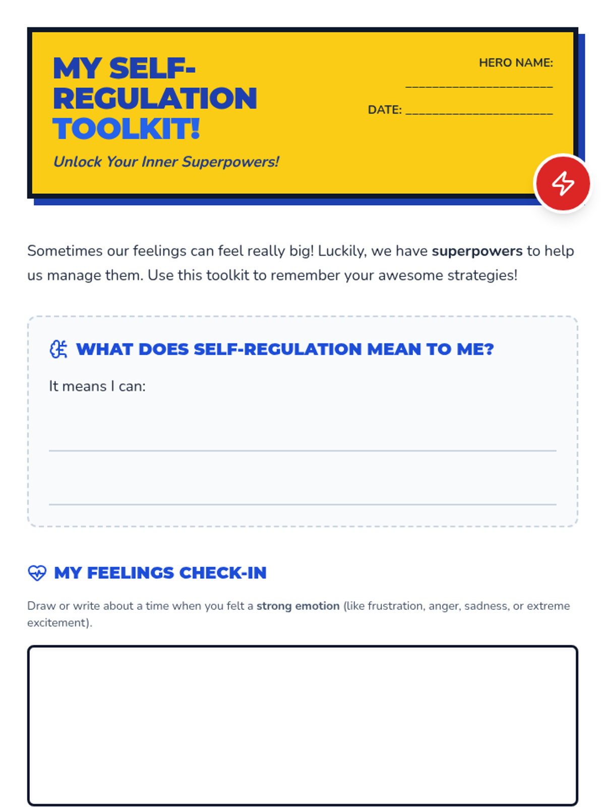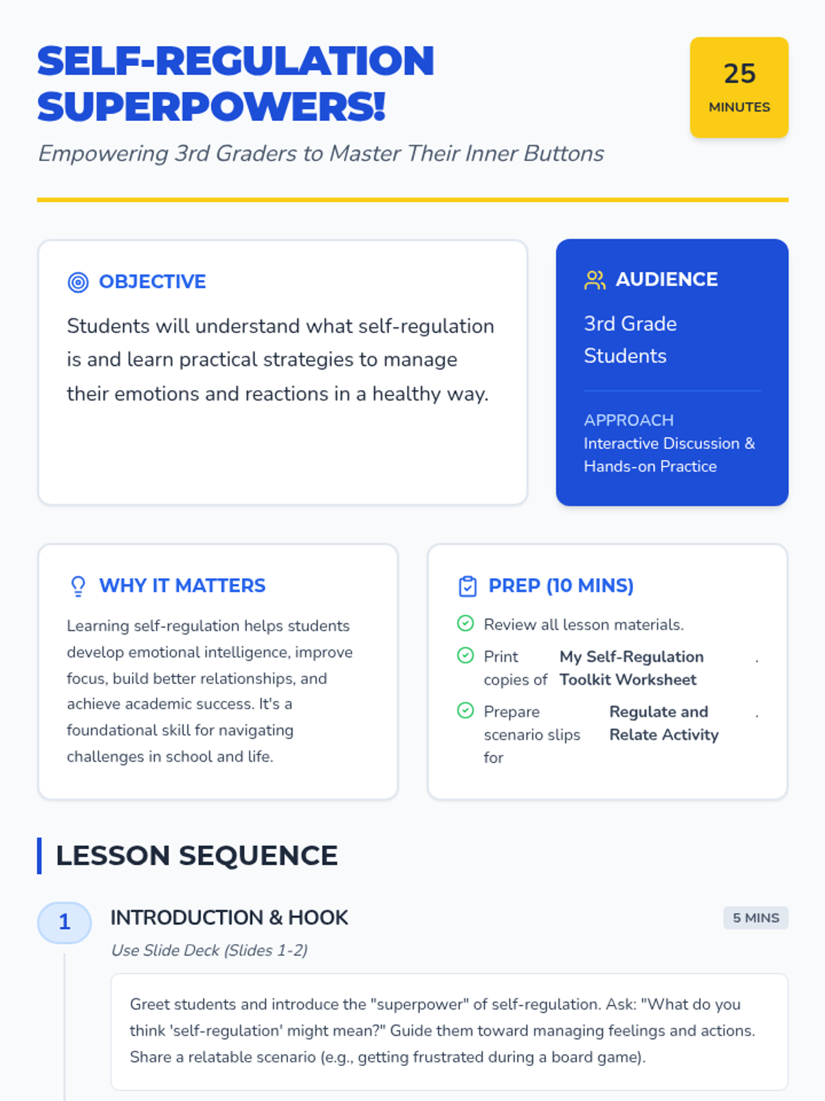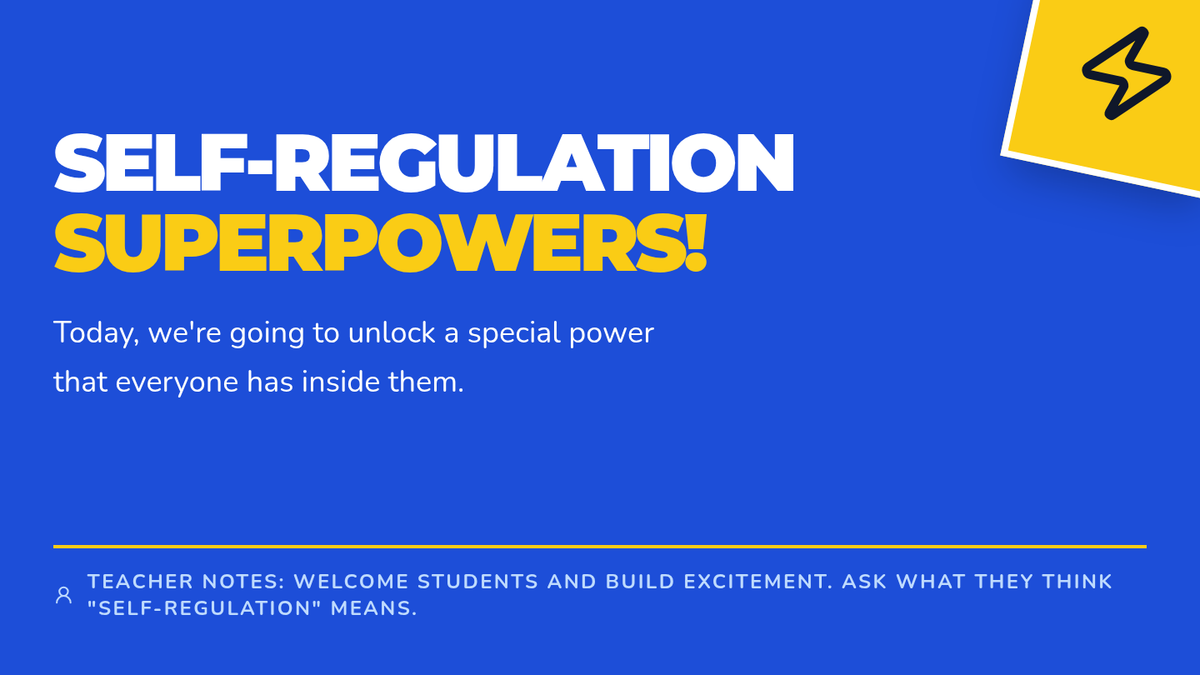 A 25-minute lesson for 3rd graders introducing self-regulation through a 'superpower' lens, featuring a slide deck, toolkit worksheet, and scenario-based activity.