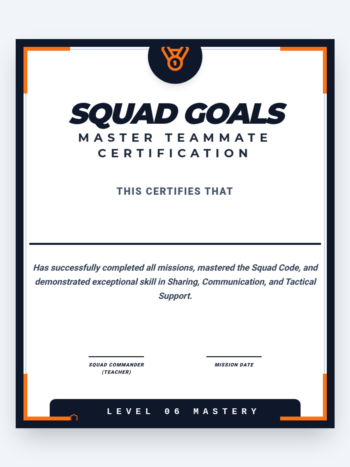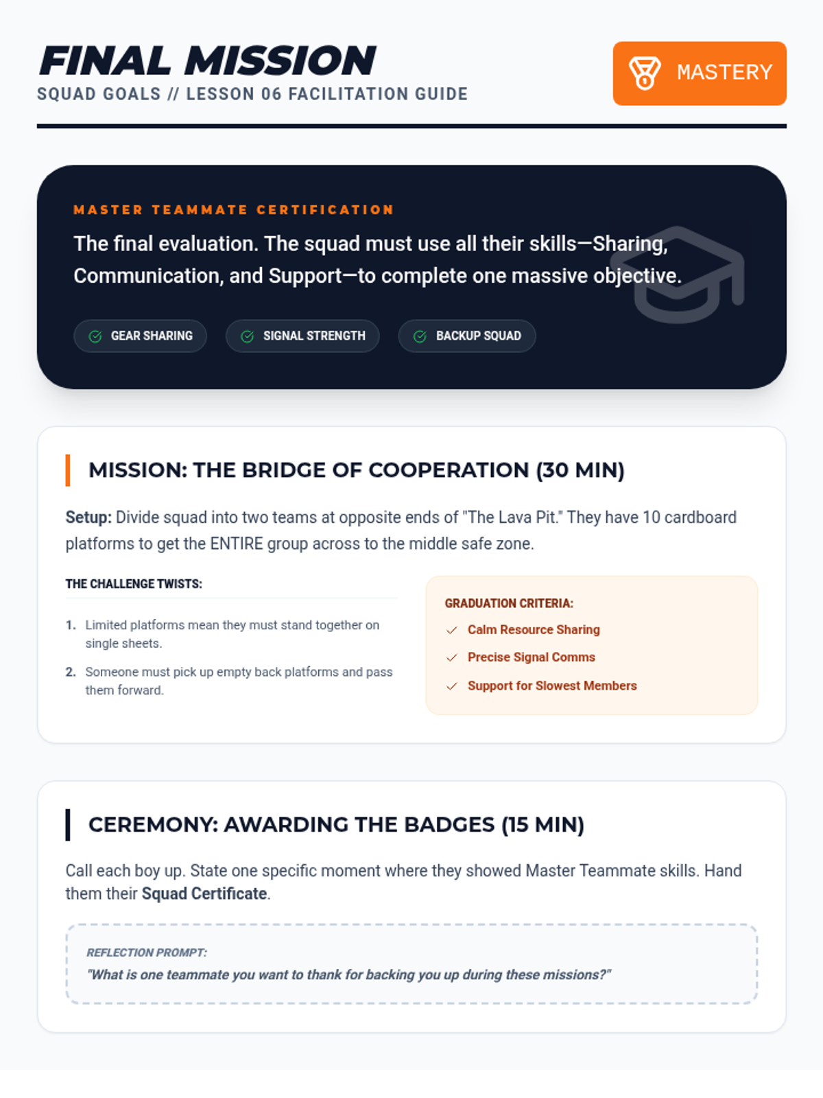 A final collaborative challenge where students apply all learned skills to earn their 'Master Teammate' status.