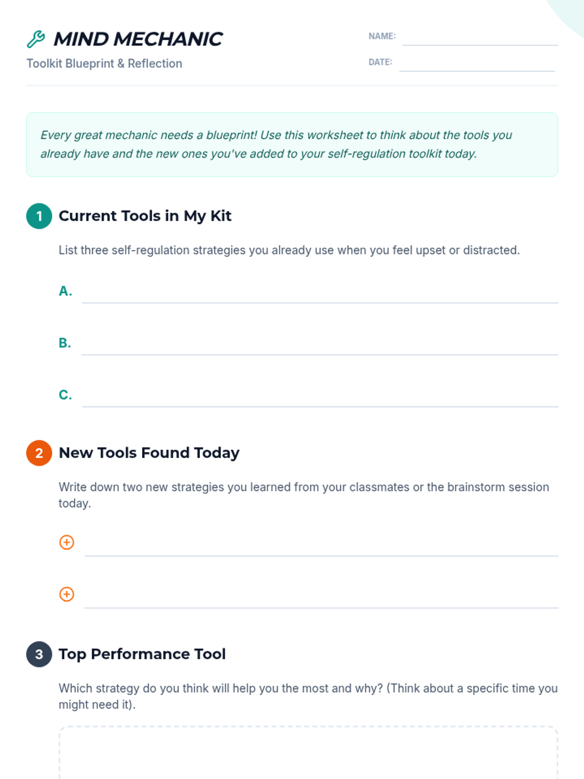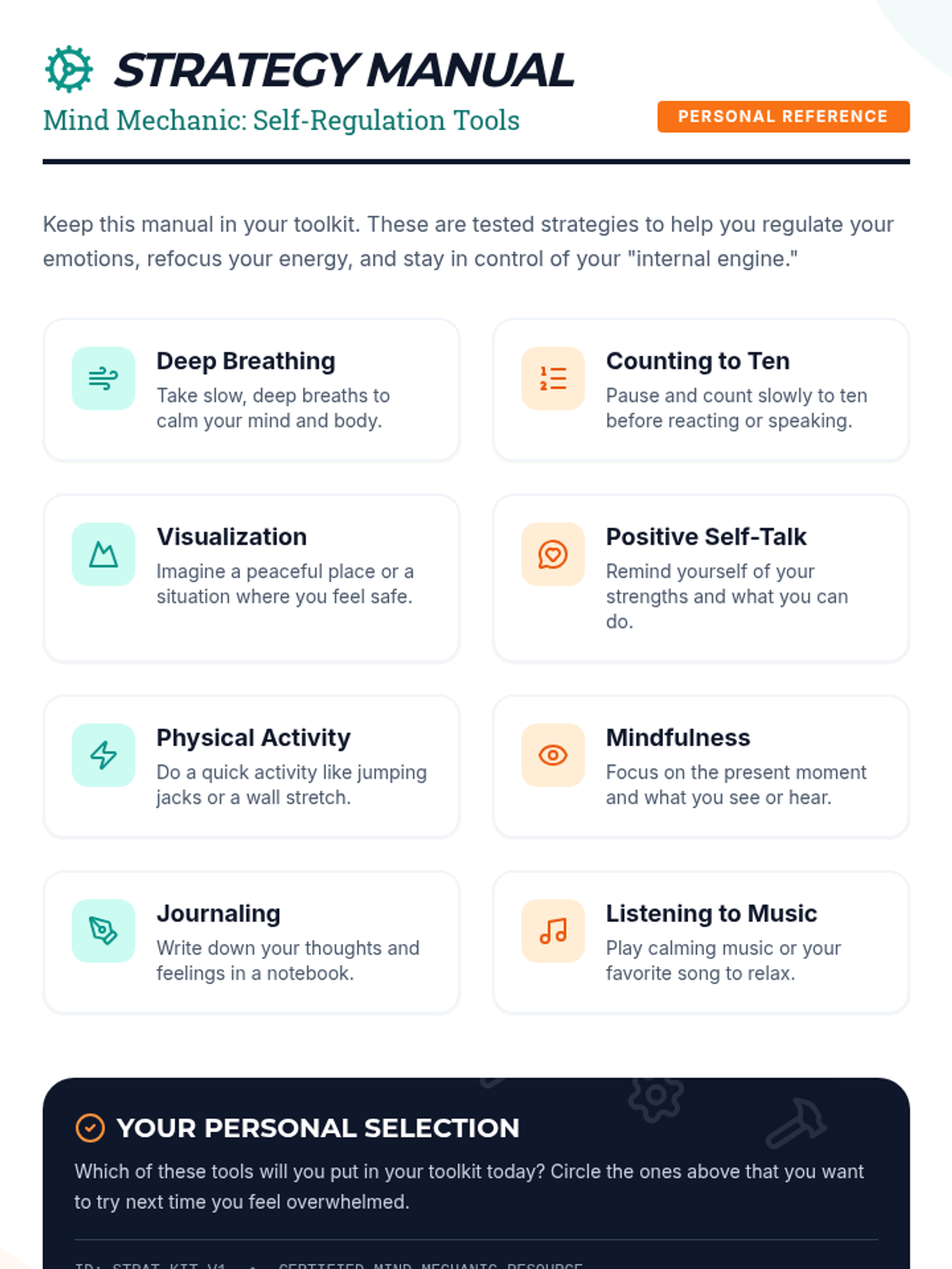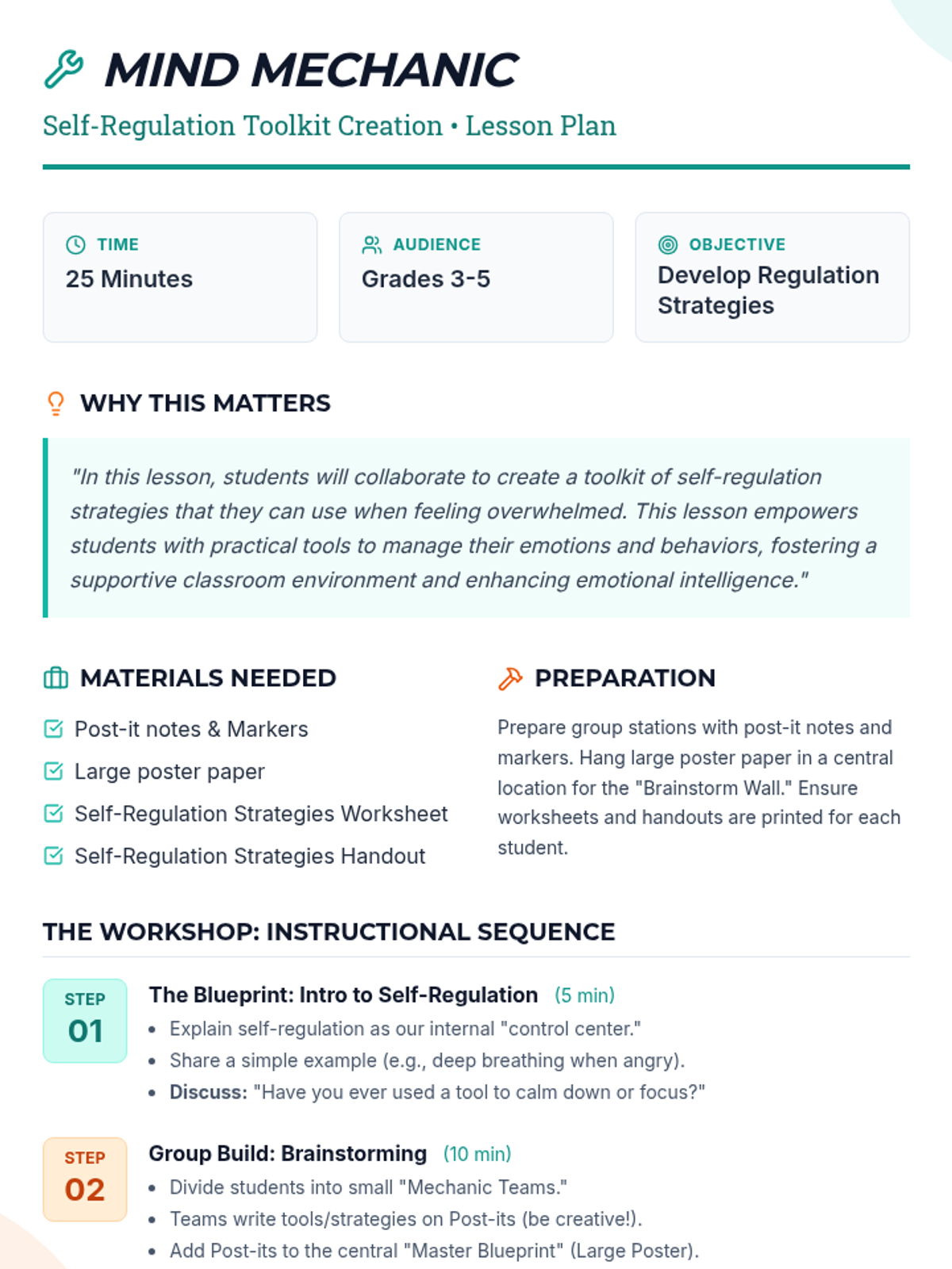 A collaborative lesson where students brainstorm and create a personal toolkit of self-regulation strategies to manage their emotions and behaviors.