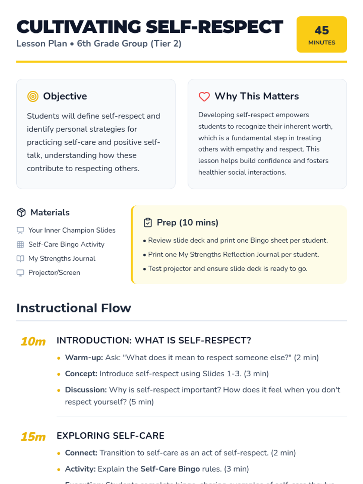 A 45-minute Tier 2 small group lesson for 6th graders focused on building self-respect through self-care and positive self-talk as a foundation for respecting others.
