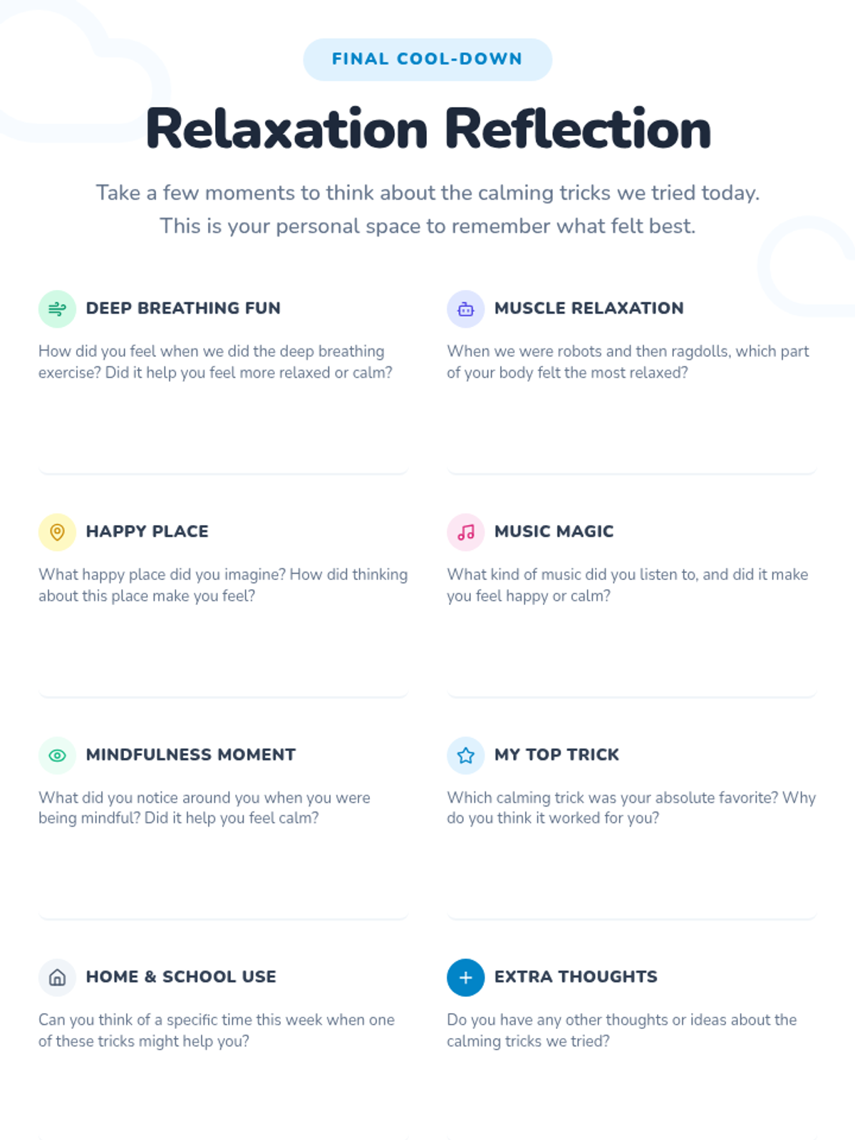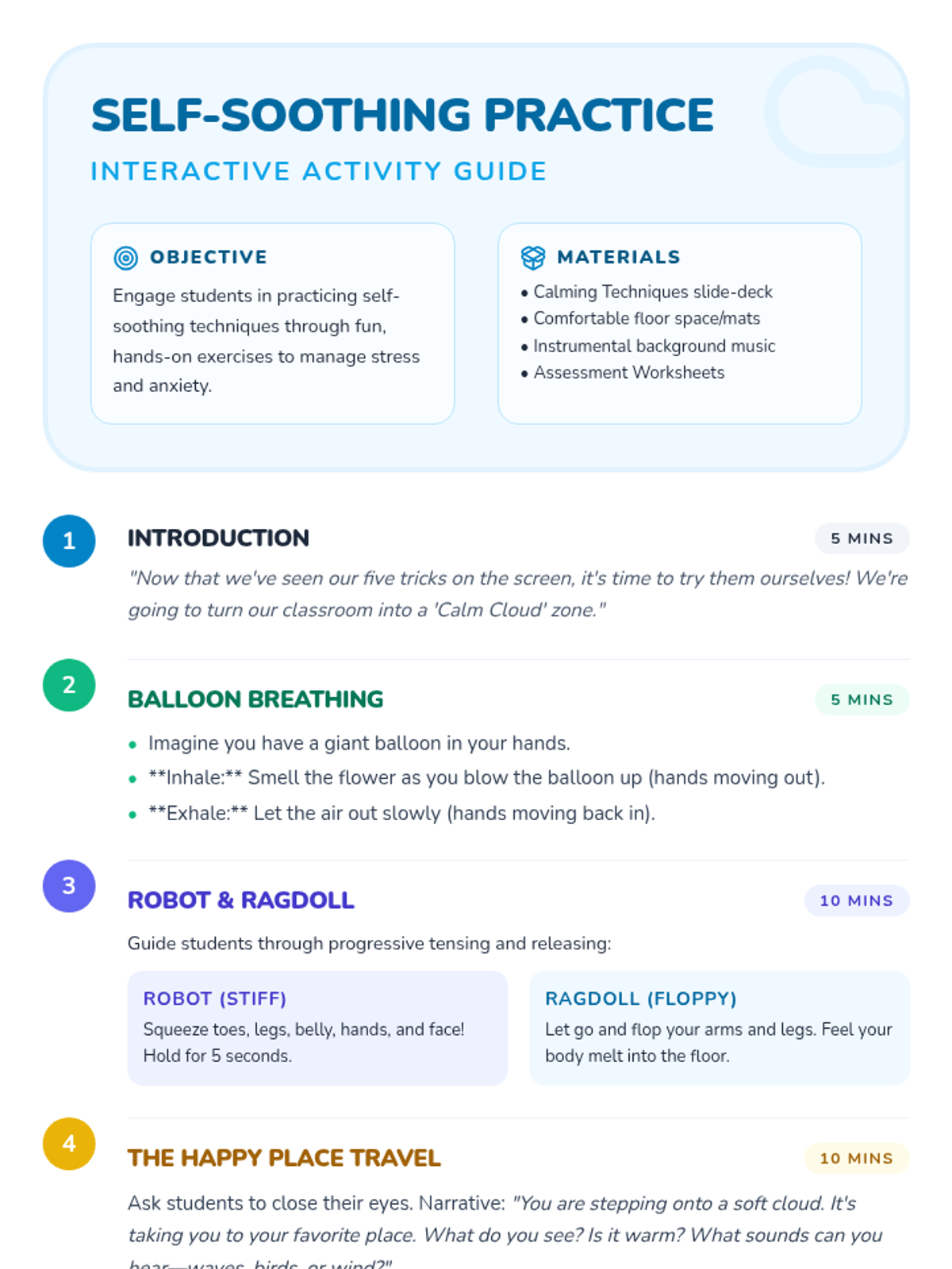 A comprehensive lesson for 4th graders to learn and practice self-soothing techniques such as deep breathing, muscle relaxation, and mindfulness to manage stress and anxiety.