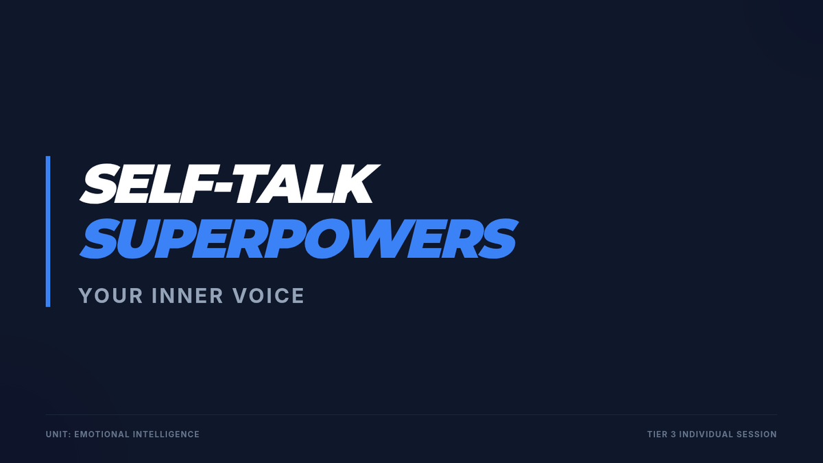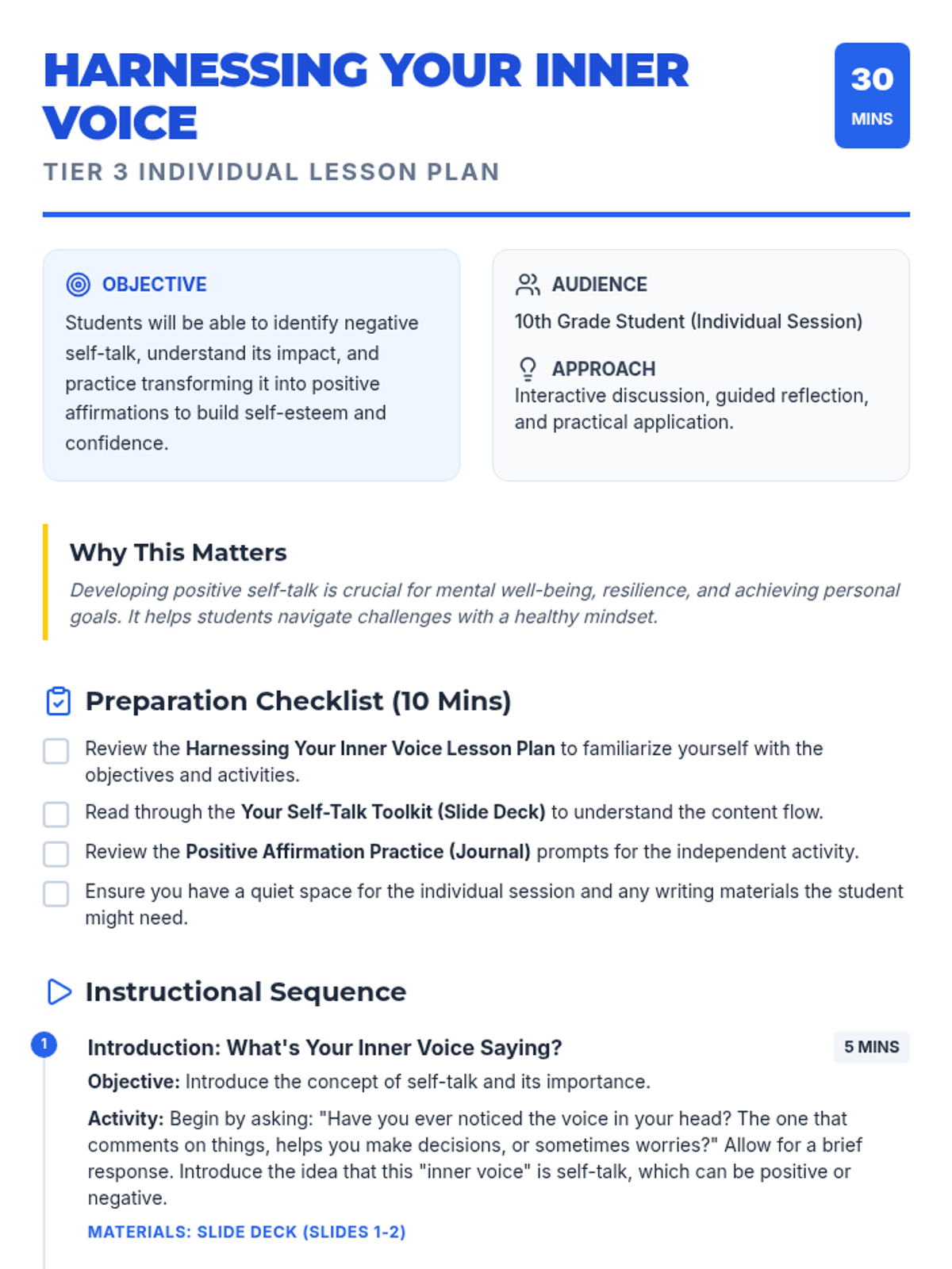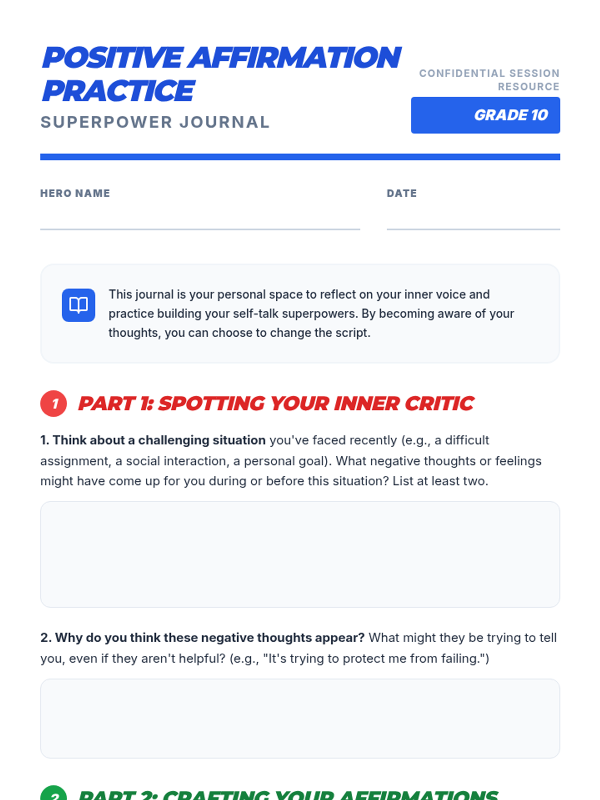 A 30-minute Tier 3 individual session for 10th-grade students to identify negative self-talk and transform it into empowering positive affirmations using a comic-book-inspired "superpower" theme.