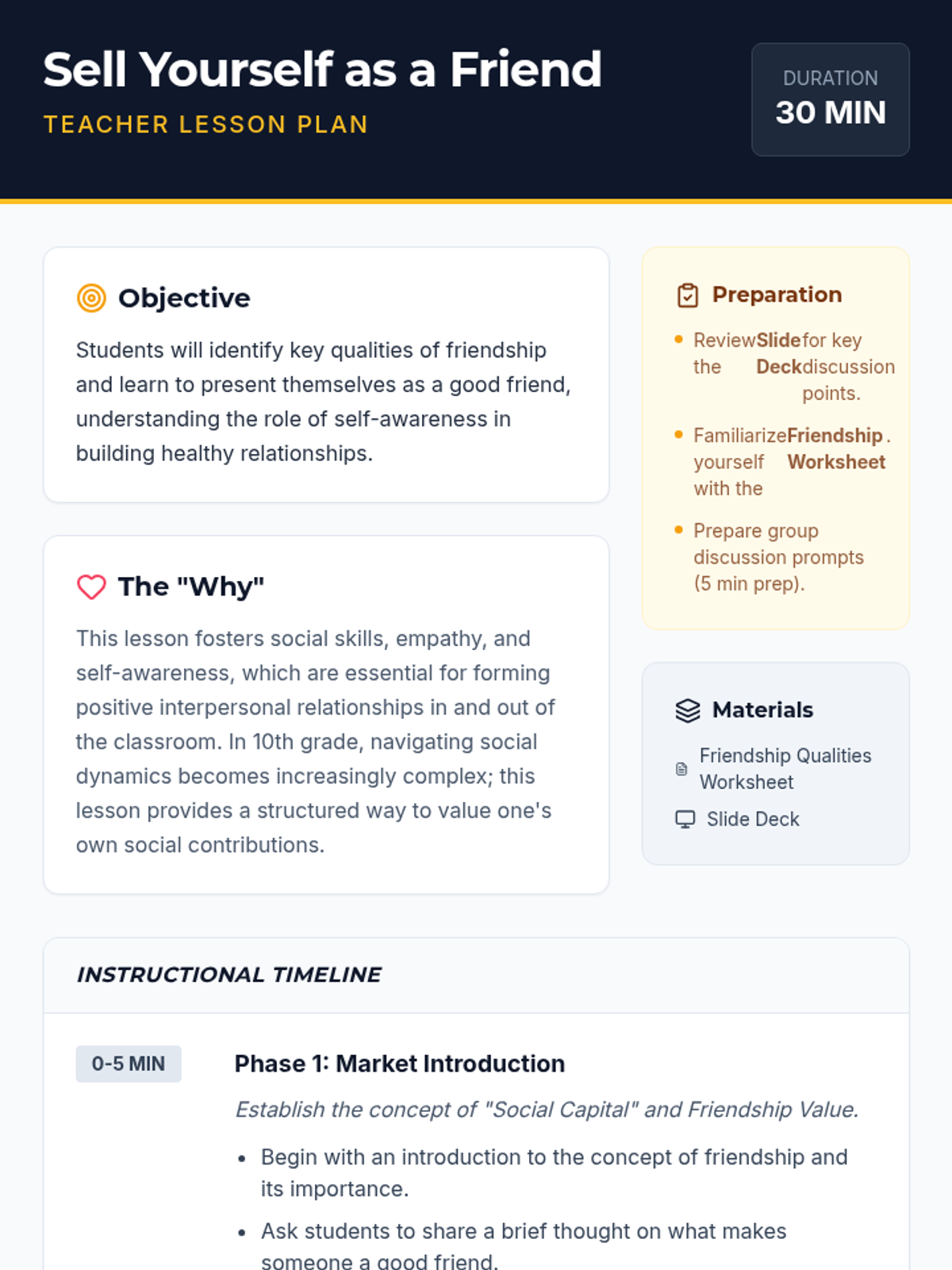 This lesson helps 10th-grade students develop social-emotional intelligence by identifying their personal strengths as friends. Through reflection and discussion, students learn to appreciate their unique contributions to relationships.