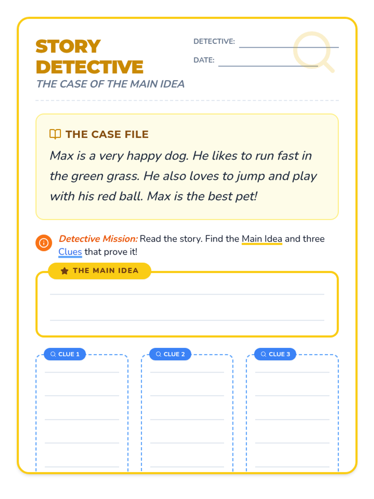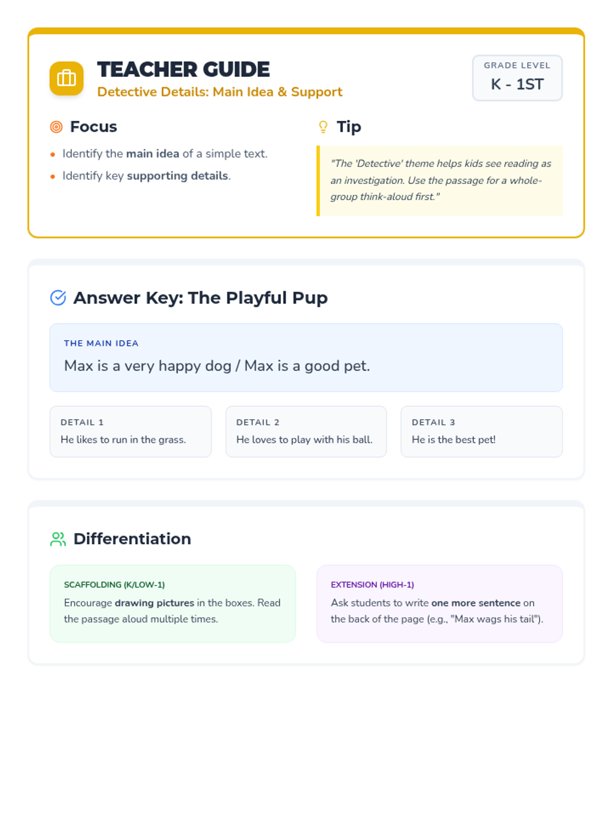 A foundational literacy lesson for K-1 students focused on identifying the main idea and supporting details using a 'Story Detective' theme.