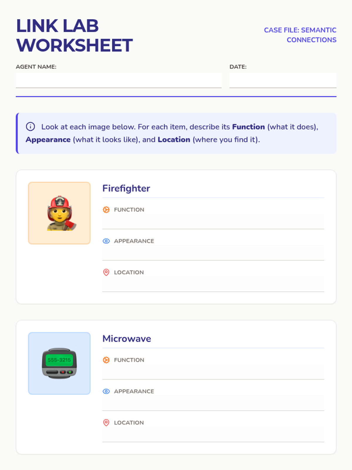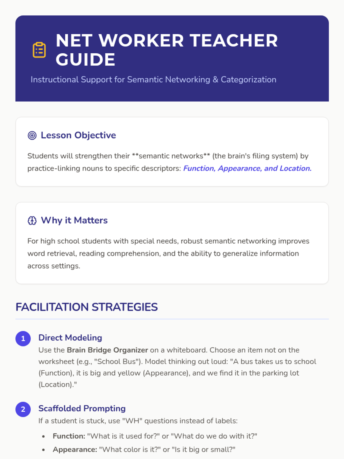 A lesson designed to improve semantic networking for high school students with special needs by identifying and describing items based on their function, appearance, and location.