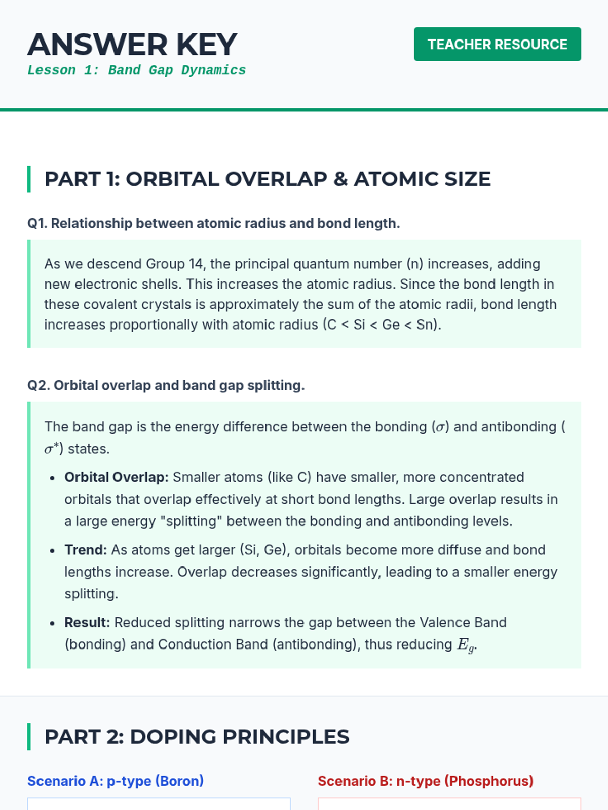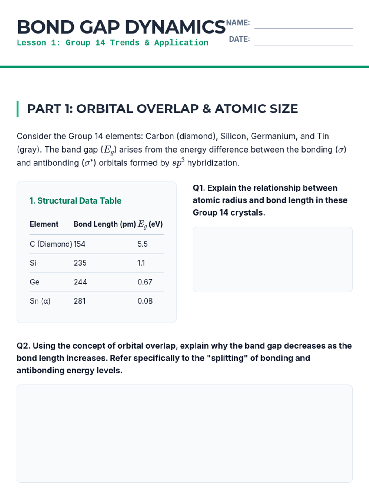 Students analyze the electronic structure of Group 14 elements, relating atomic size and orbital overlap to band gap energies and semiconductor performance.
