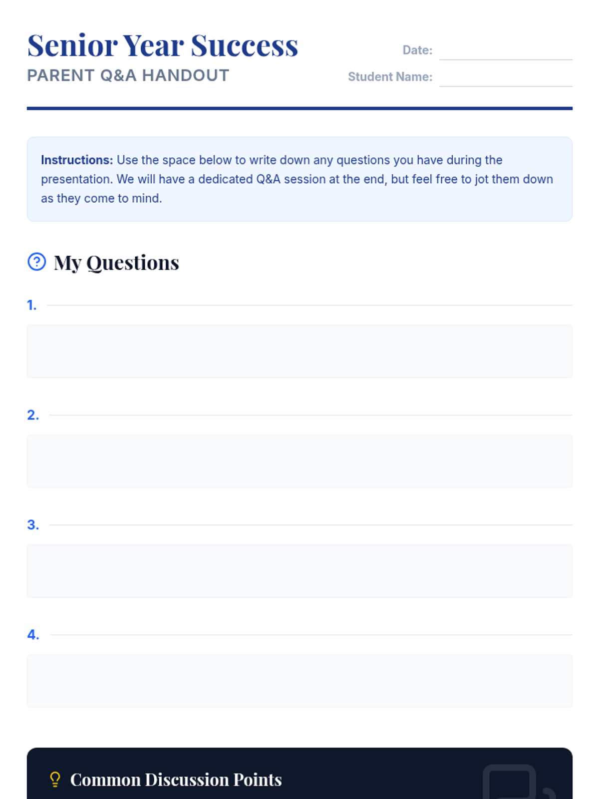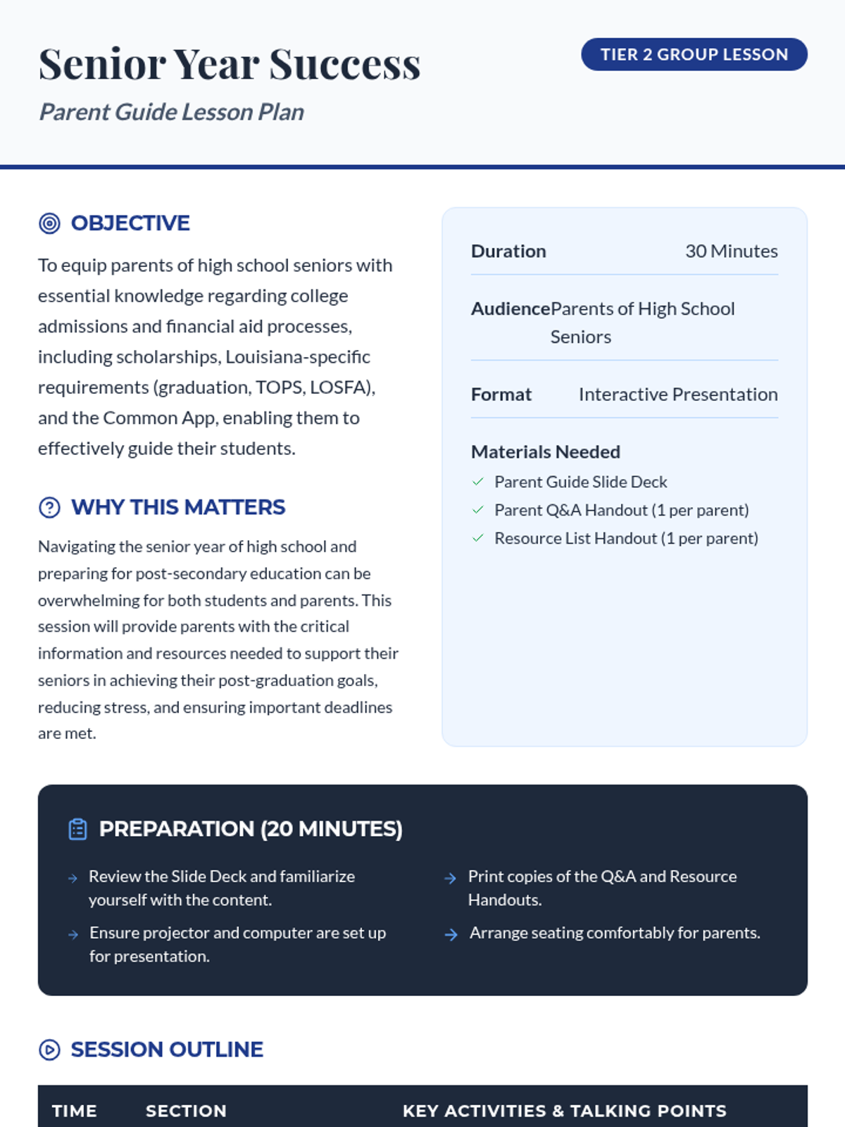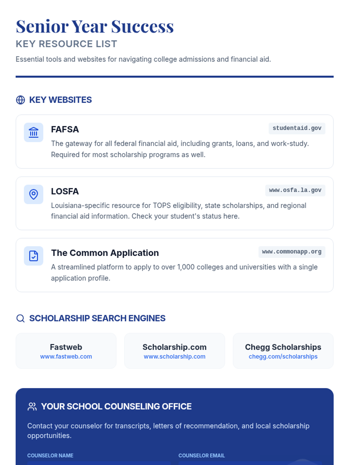 A comprehensive 30-minute guide for parents of high school seniors, covering Louisiana graduation requirements, financial aid (FAFSA, TOPS, LOSFA), scholarships, and the Common App.