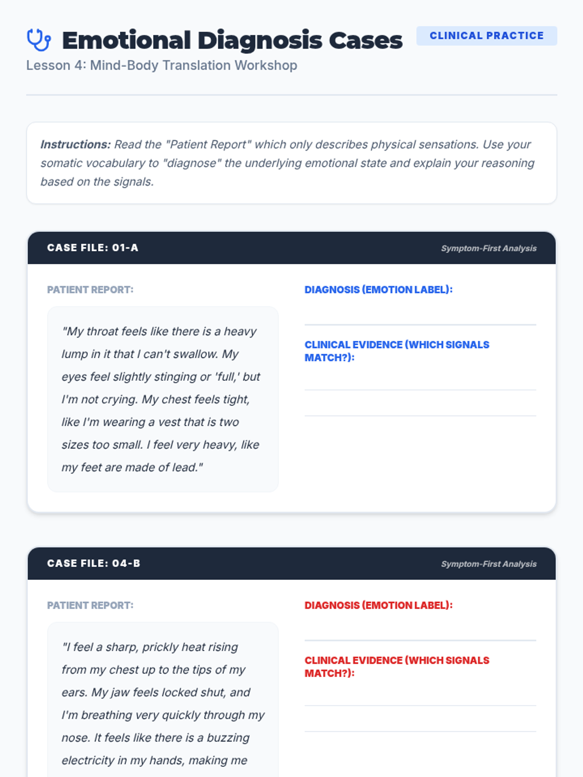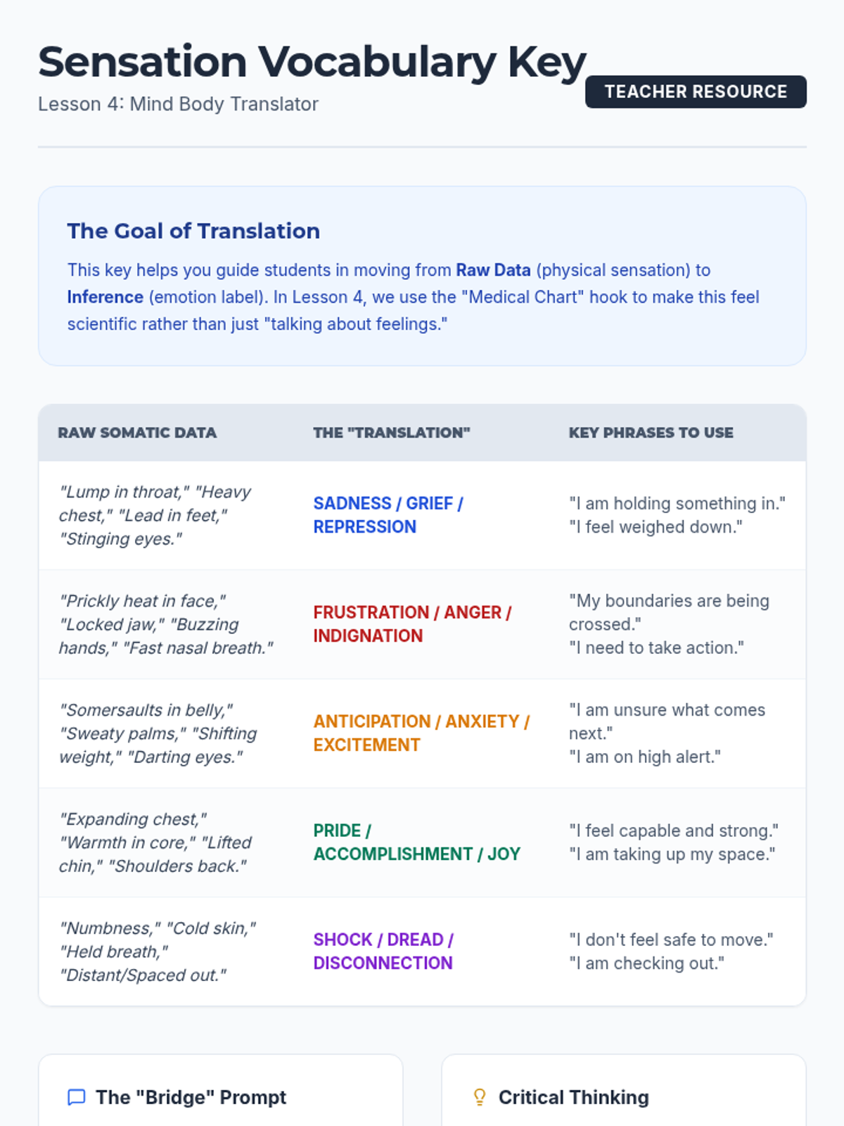 Students bridge the gap between somatic sensations and emotional vocabulary by 'diagnosing' emotional root causes from physical symptoms.