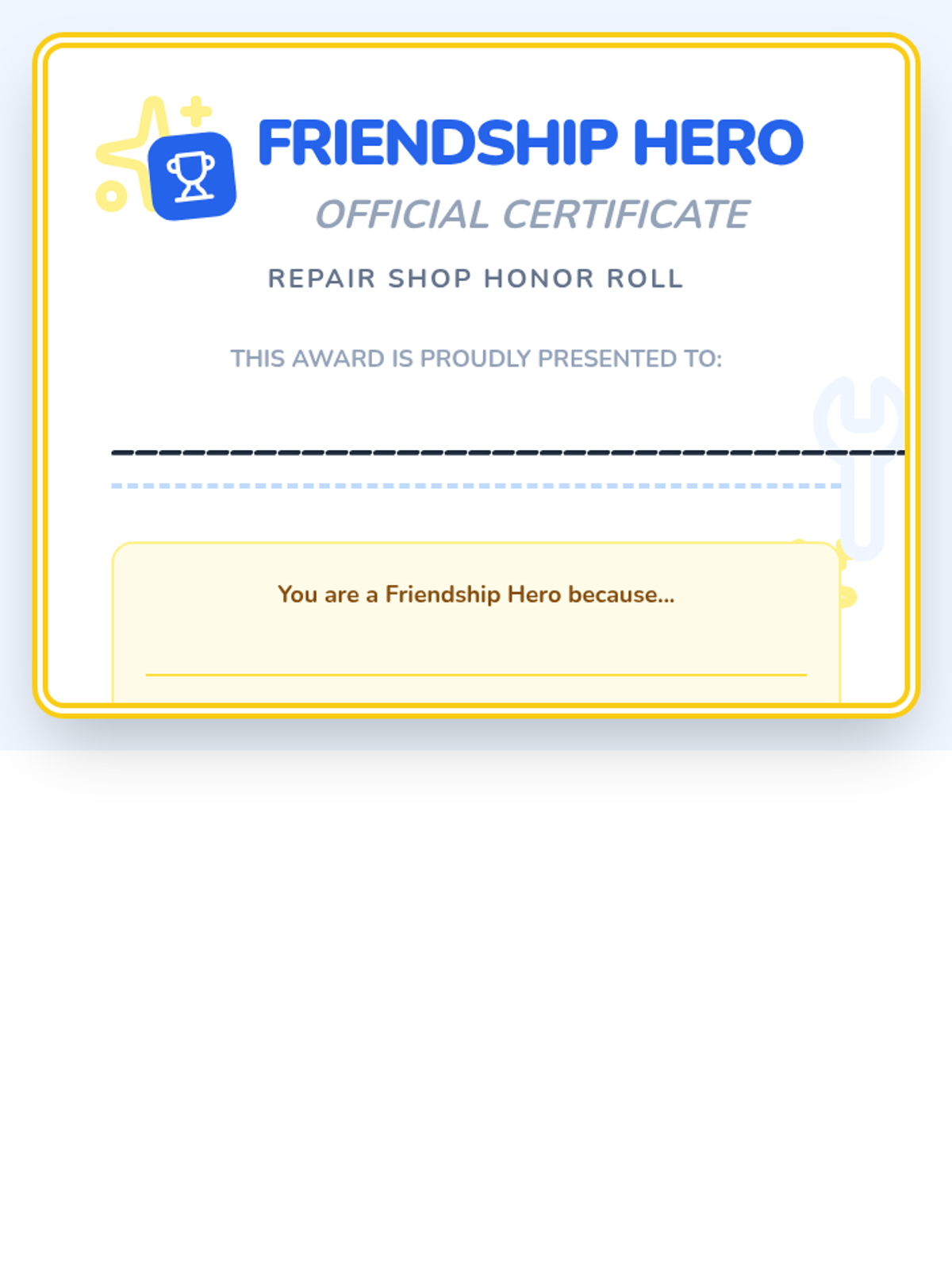 A 30-minute lesson for 3rd graders focused on conflict resolution, apologies, and celebrating healthy friendships through a 'Friendship Repair Shop' theme. Students practice solving common friendship hurdles and honor their peers with certificates.