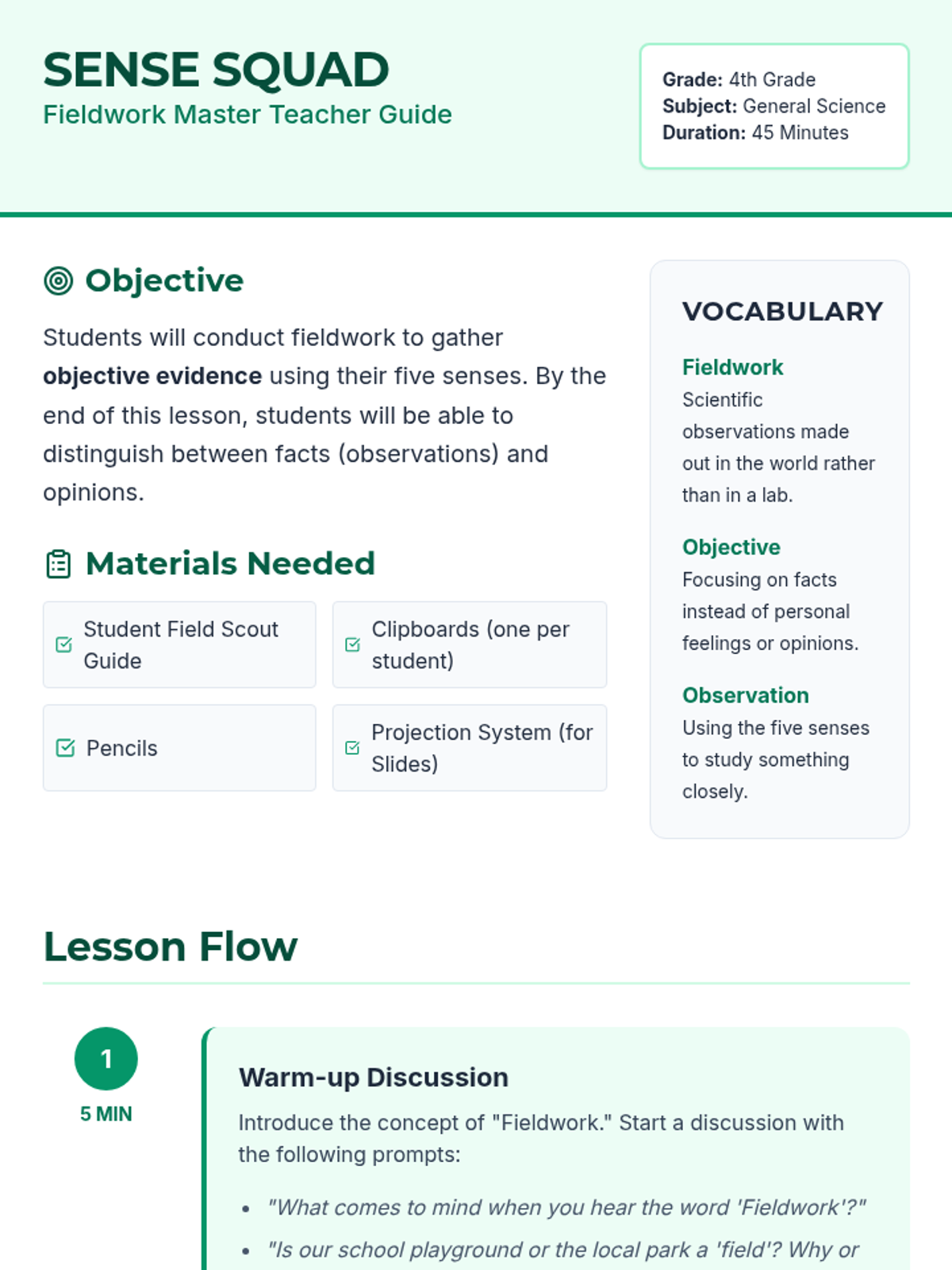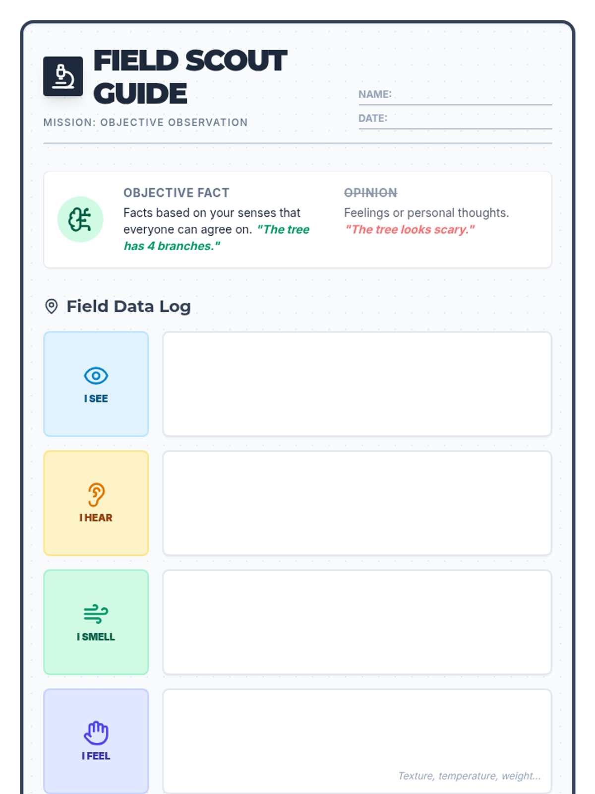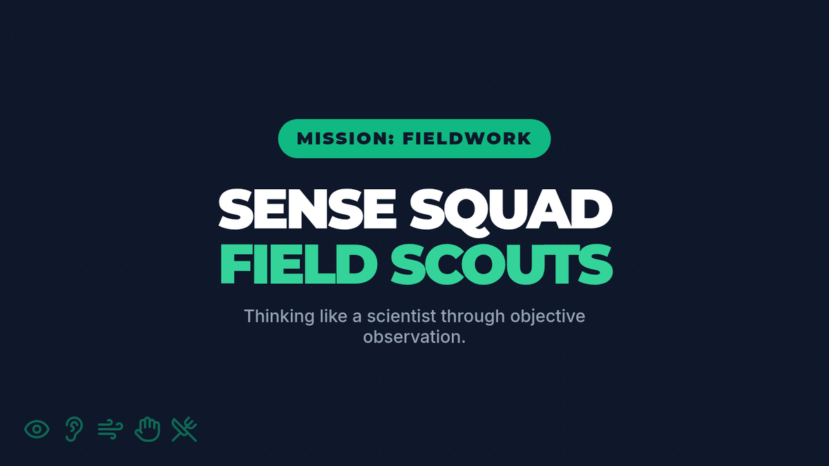 Students learn to think like scientists by conducting outdoor fieldwork, focusing on making objective, fact-based observations using their five senses while avoiding opinions.
