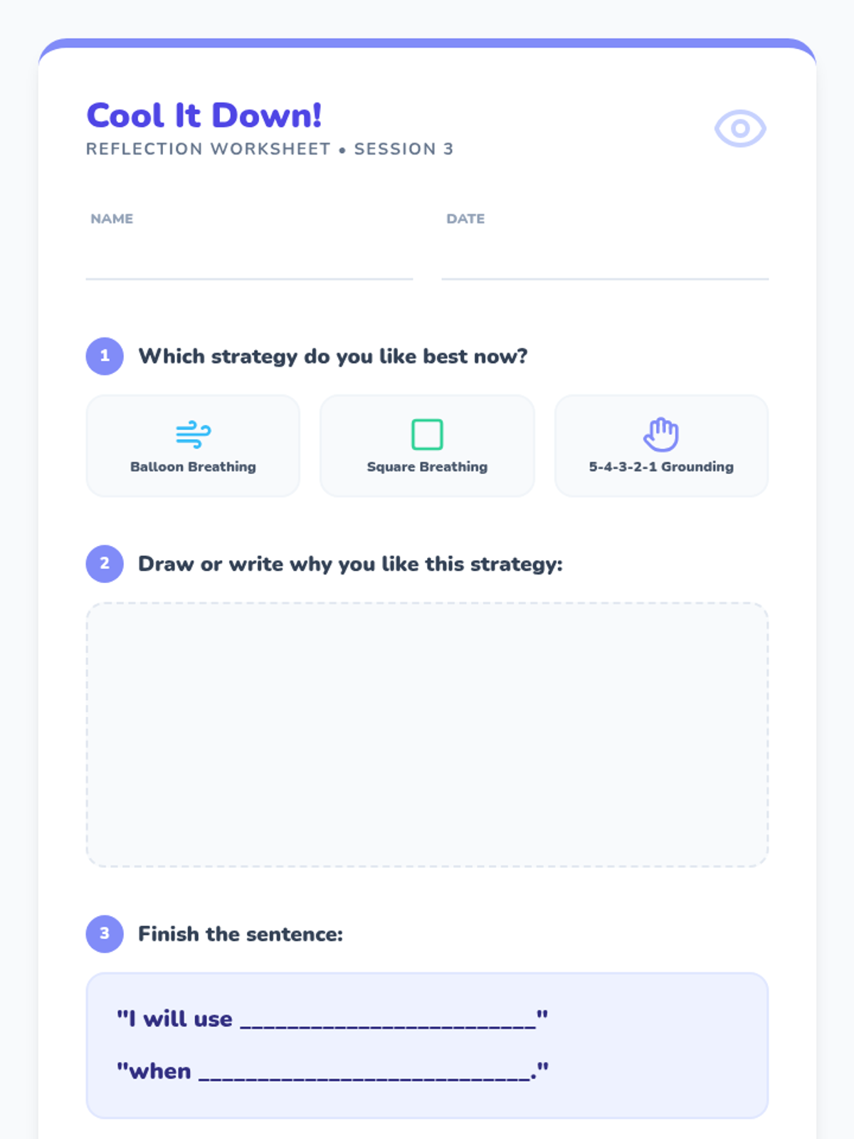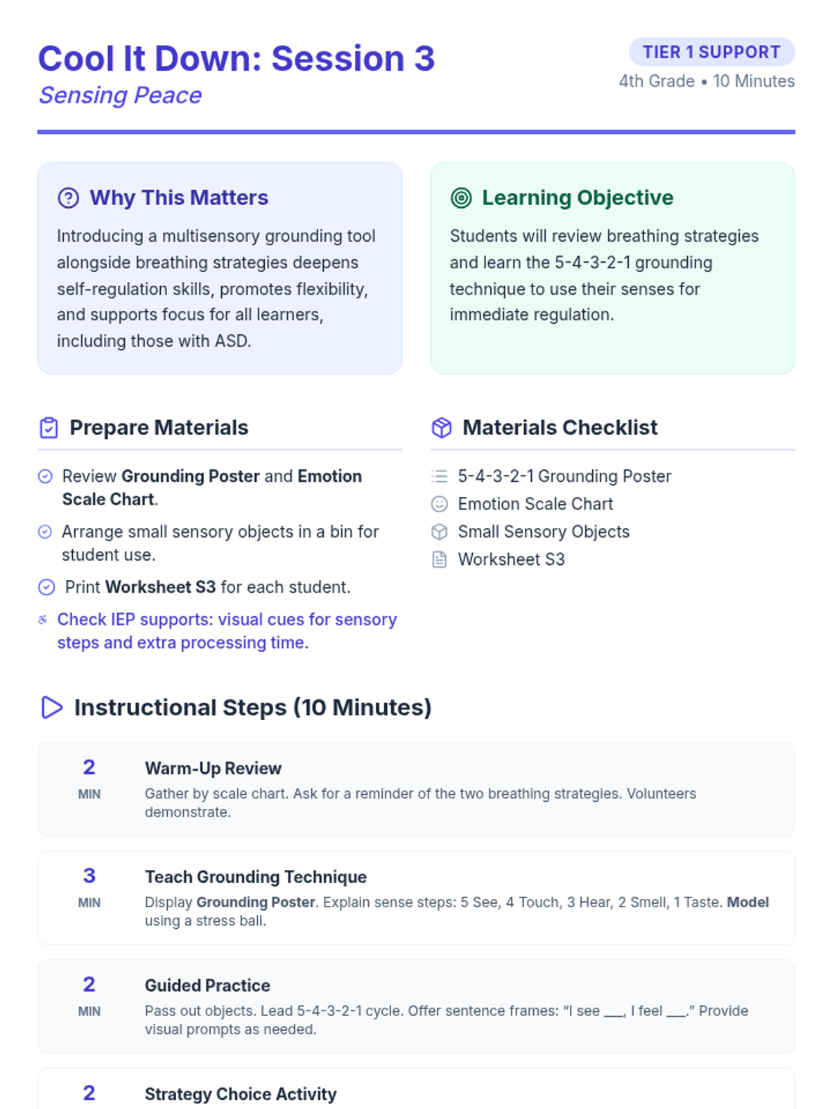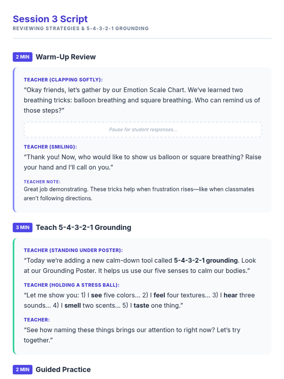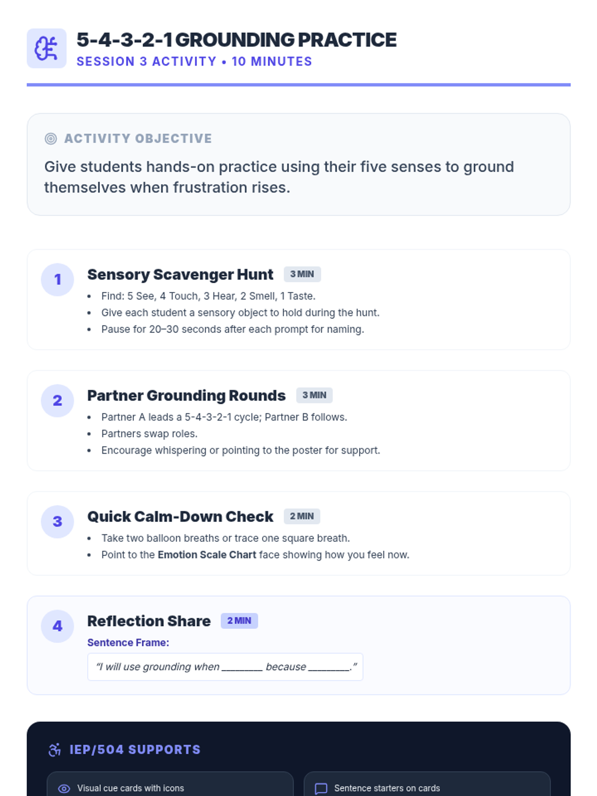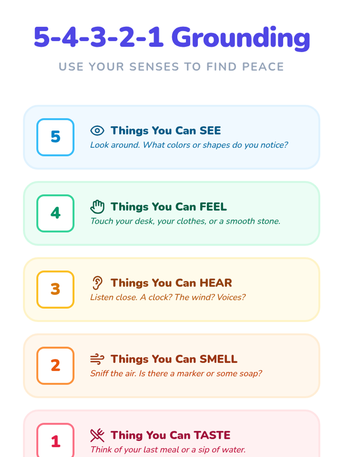Students learn the 5-4-3-2-1 grounding technique to use their senses for immediate regulation.