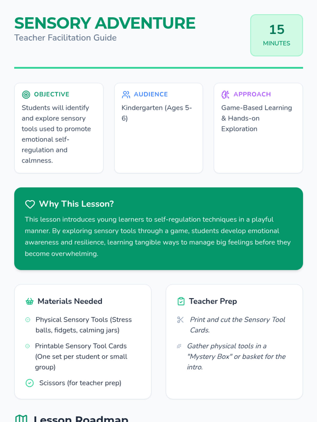 A fun, 15-minute introductory lesson for kindergarteners to explore sensory tools like stress balls and calming jars. Students learn to identify and use these tools for emotional self-regulation through exploration and a matching game.