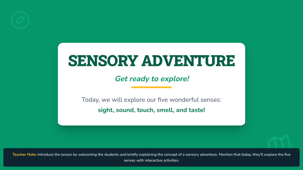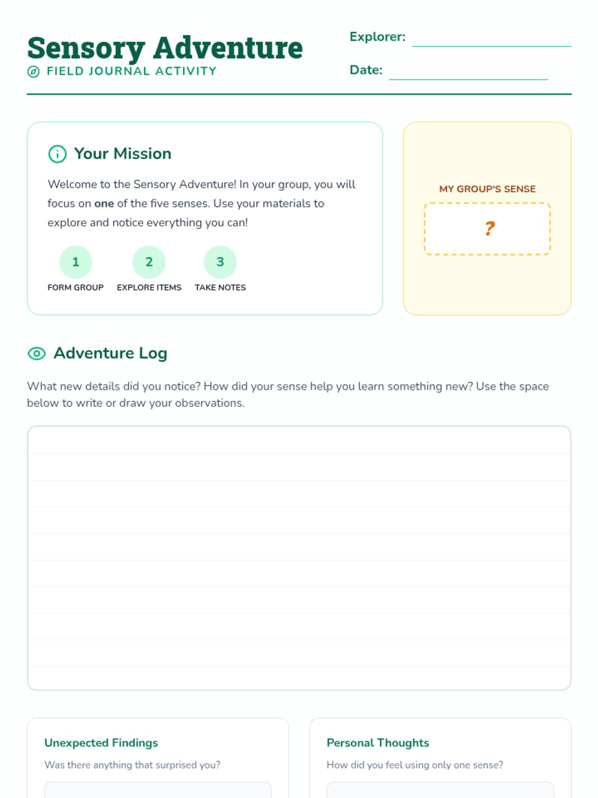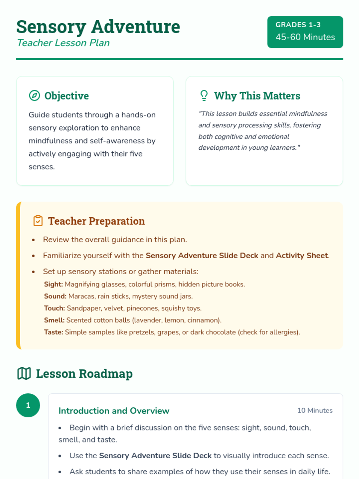 A guided sensory exploration for grades 1-3, focusing on mindfulness and self-awareness through hands-on activities with the five senses.