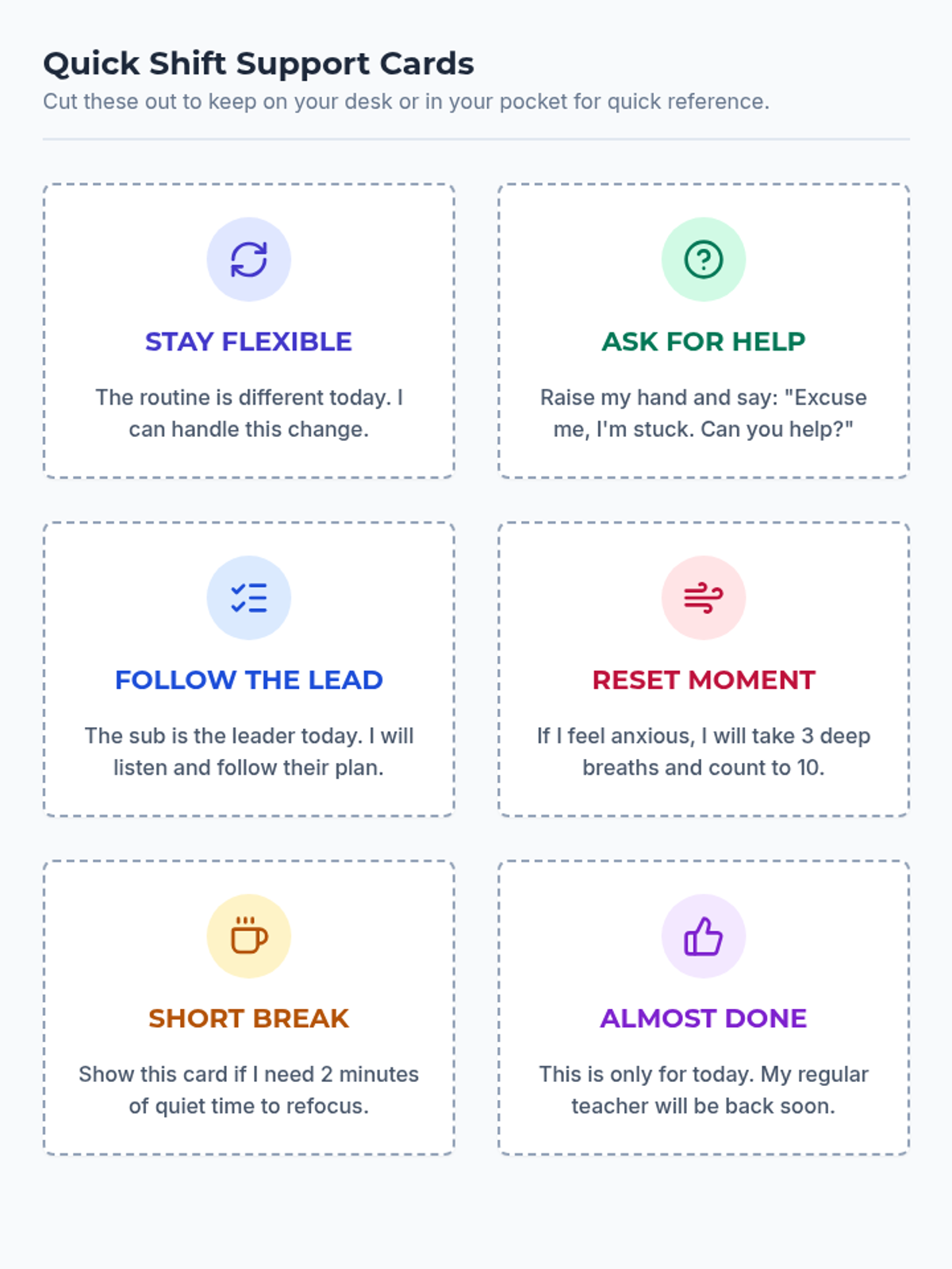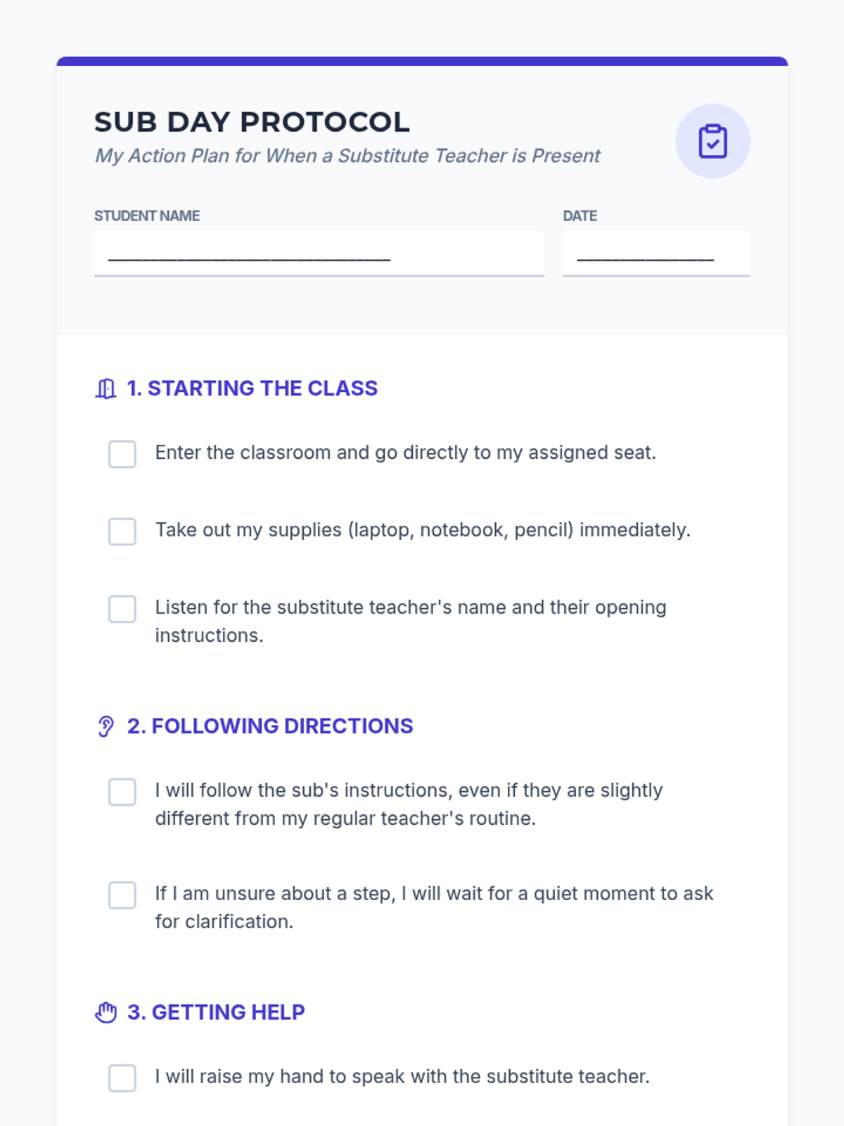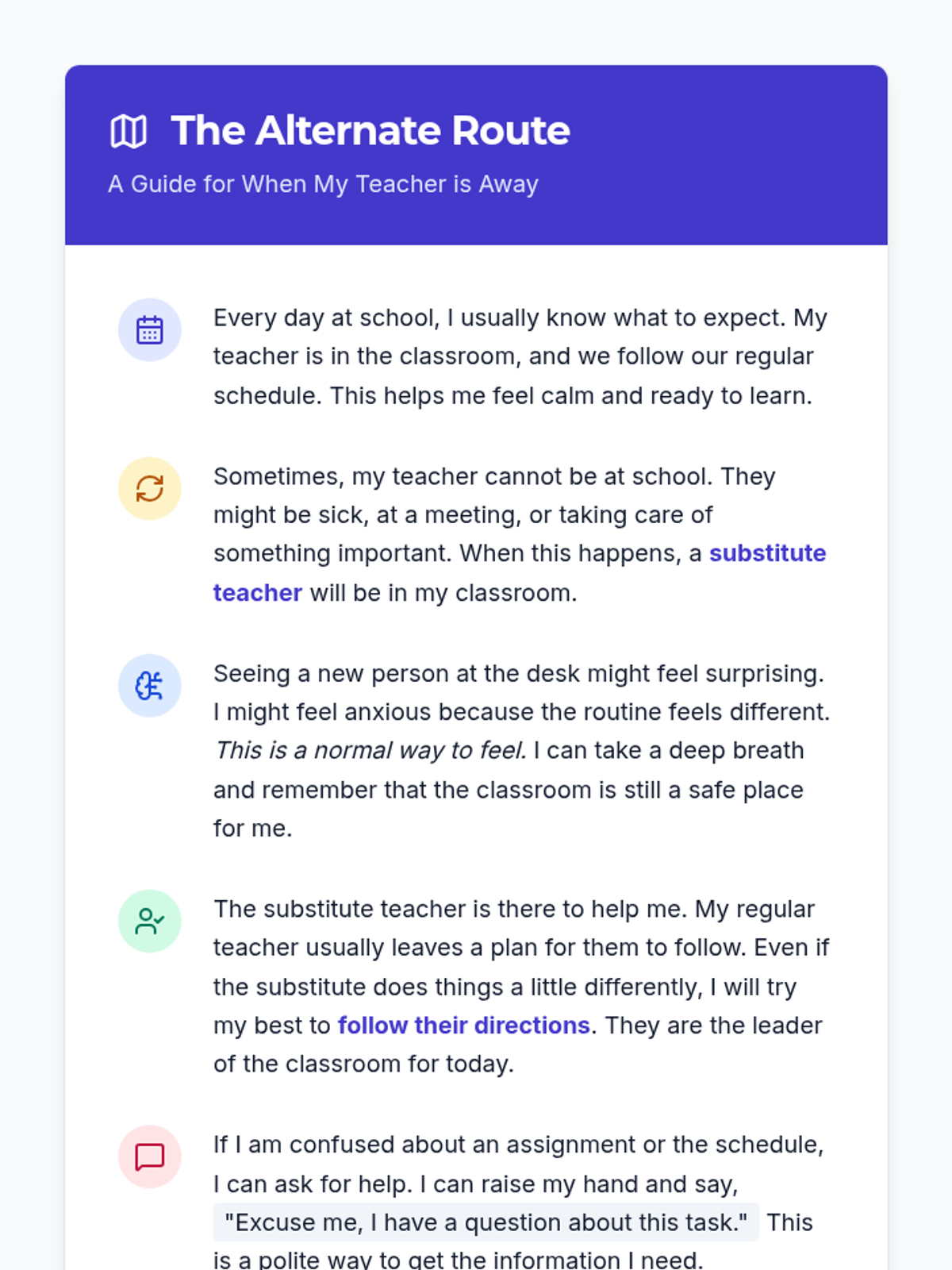 A comprehensive social story and support kit designed for 8th-grade students with Autism to navigate the transition and expectations of having a substitute teacher. This lesson includes a narrative guide, a procedural checklist, portable reminder cards, and a reflection activity to build flexibility and self-advocacy skills.