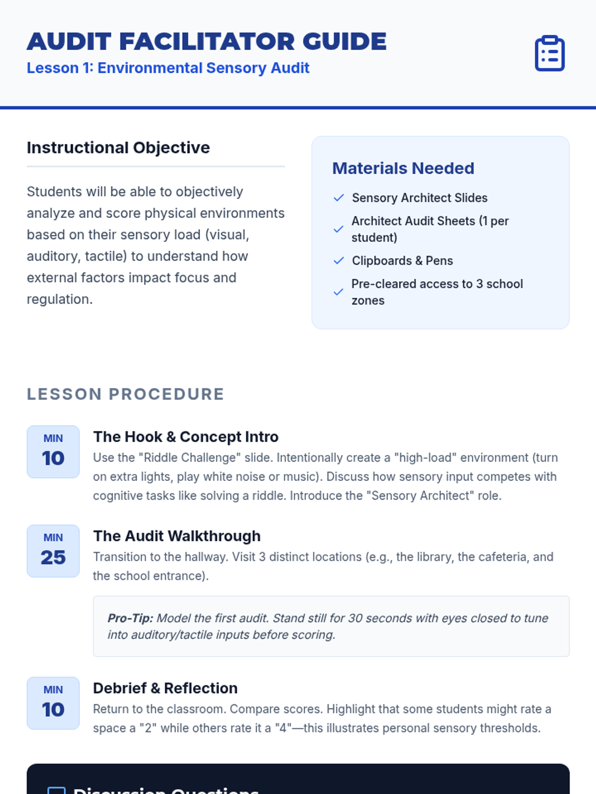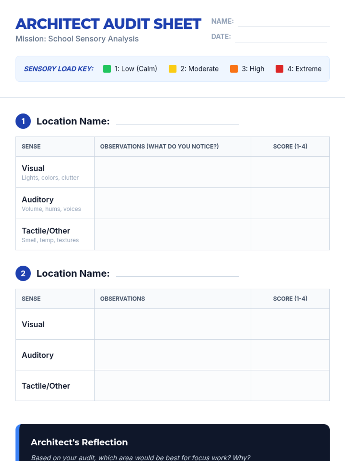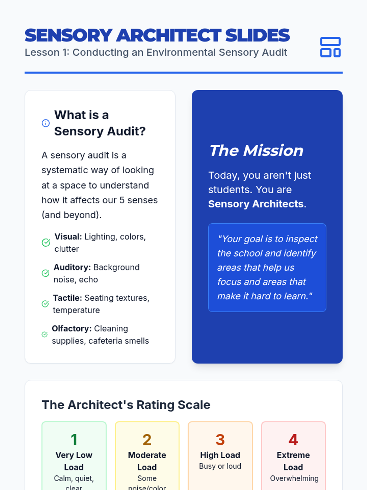 Students act as 'Sensory Architects' to audit school environments for sensory load using a professional rubric. They analyze lighting, acoustics, and visual clutter to determine environmental friendliness.