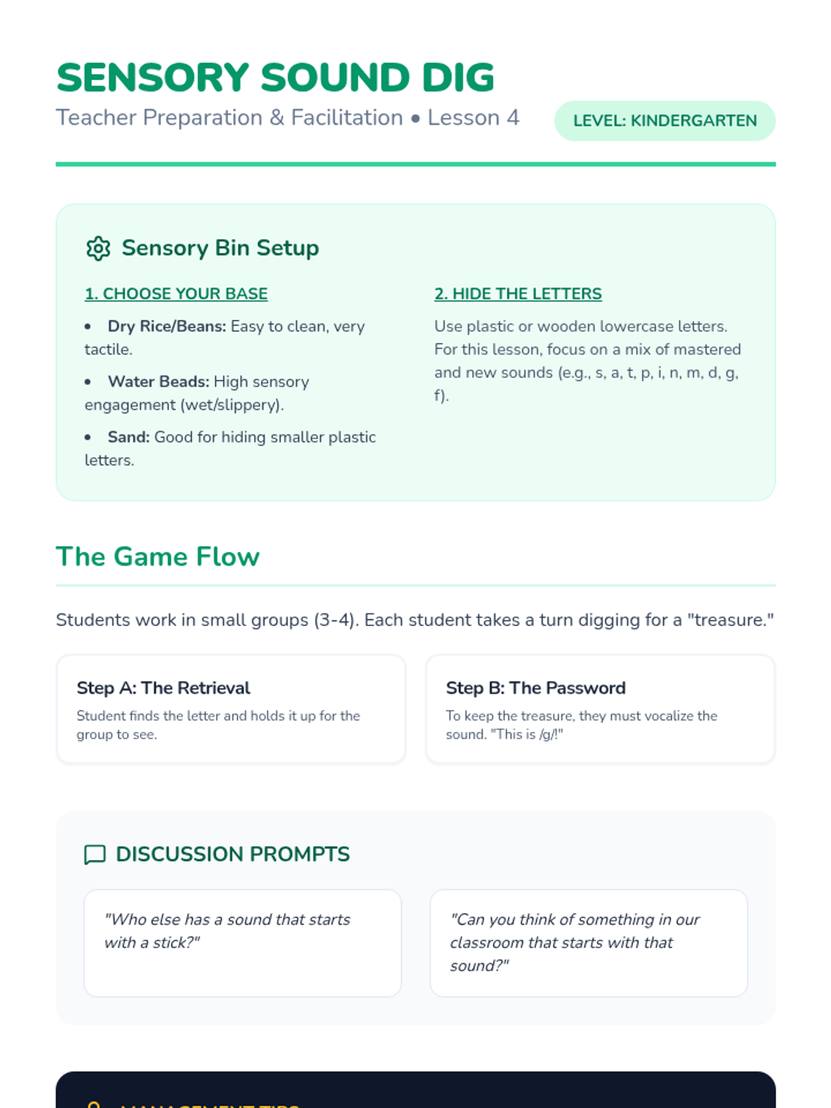 Students dig through sensory bins to find lowercase letters, articulate their sounds, and match them to picture cards.