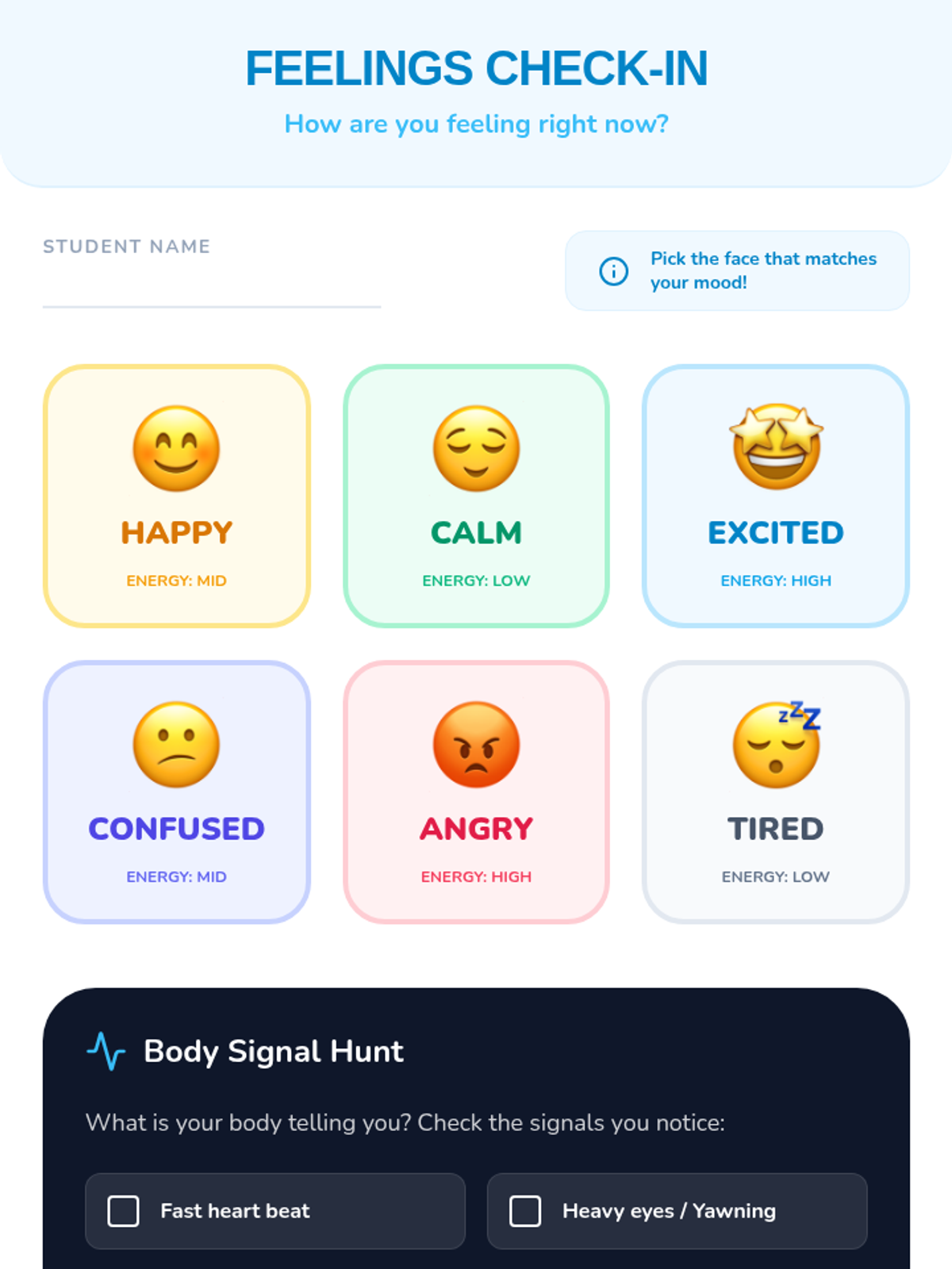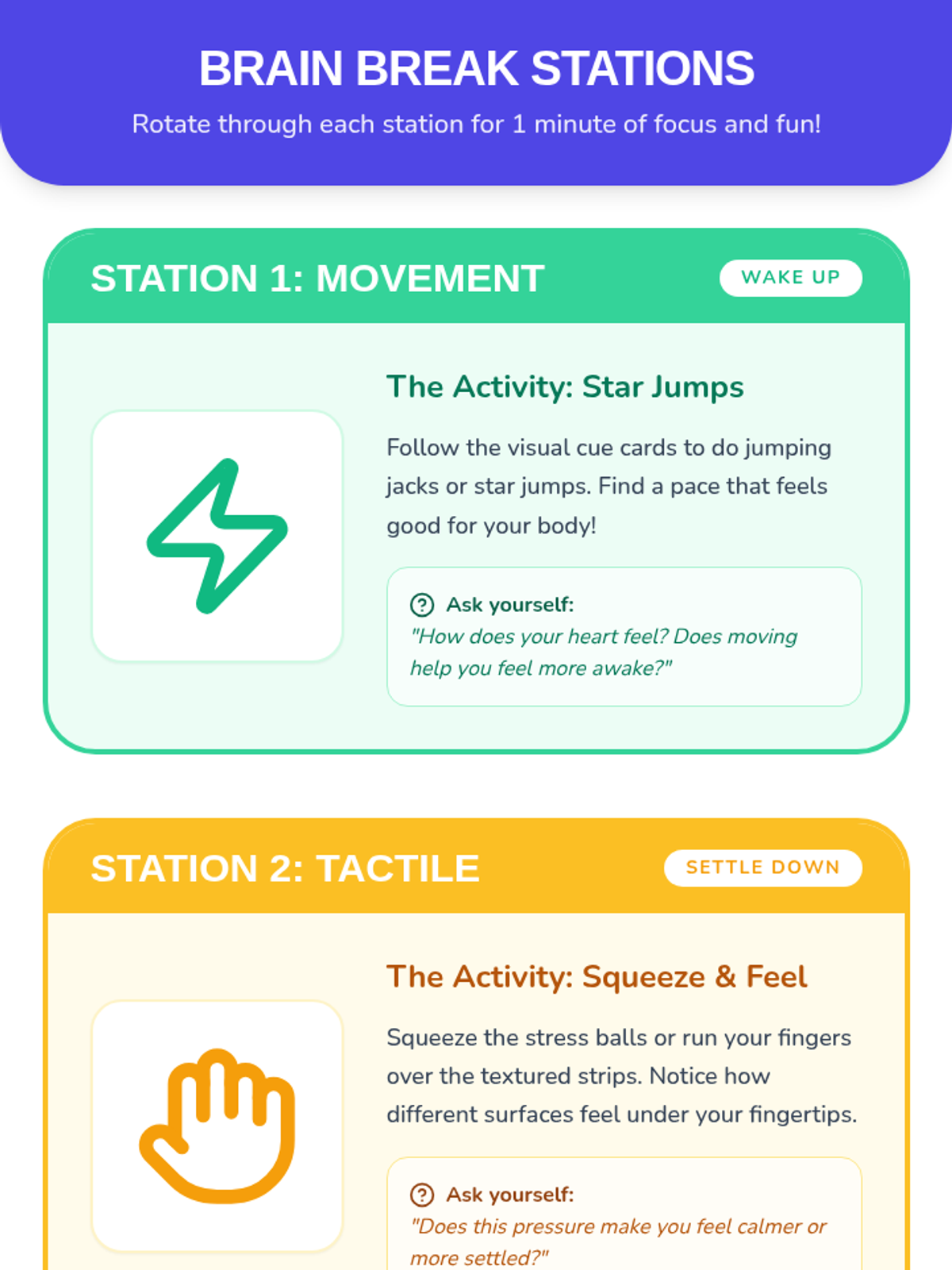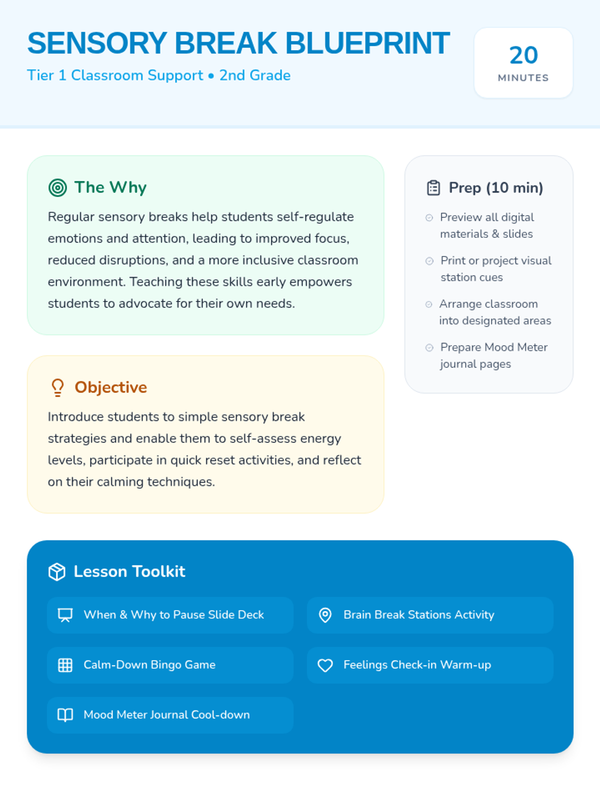 A 20-minute Tier 1 lesson for 2nd graders introducing quick sensory reset strategies to promote self-regulation and focus. Students learn to recognize body signals and practice calming techniques through interactive stations and games.