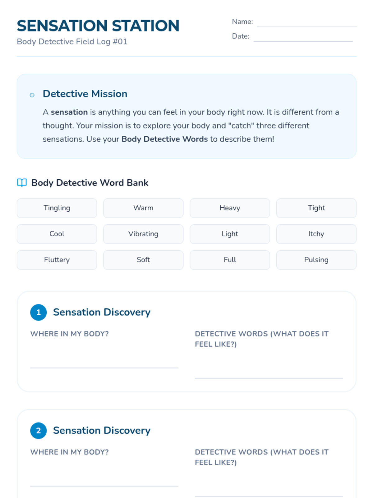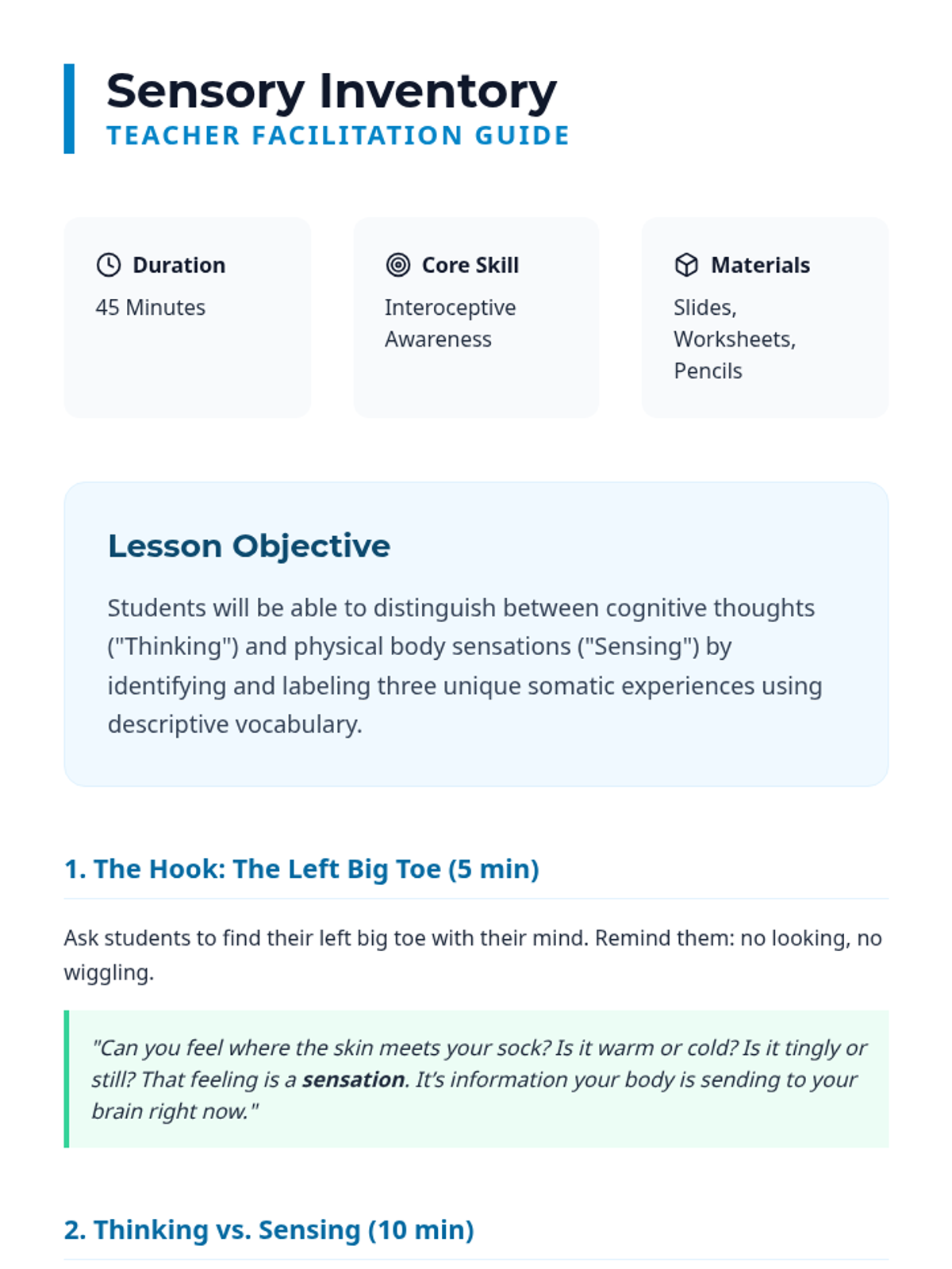 Students distinguish between 'thinking' and 'sensing' by conducting a sensory inventory. They build a somatic vocabulary to label sensations like tingling, warmth, and heaviness without judgment.