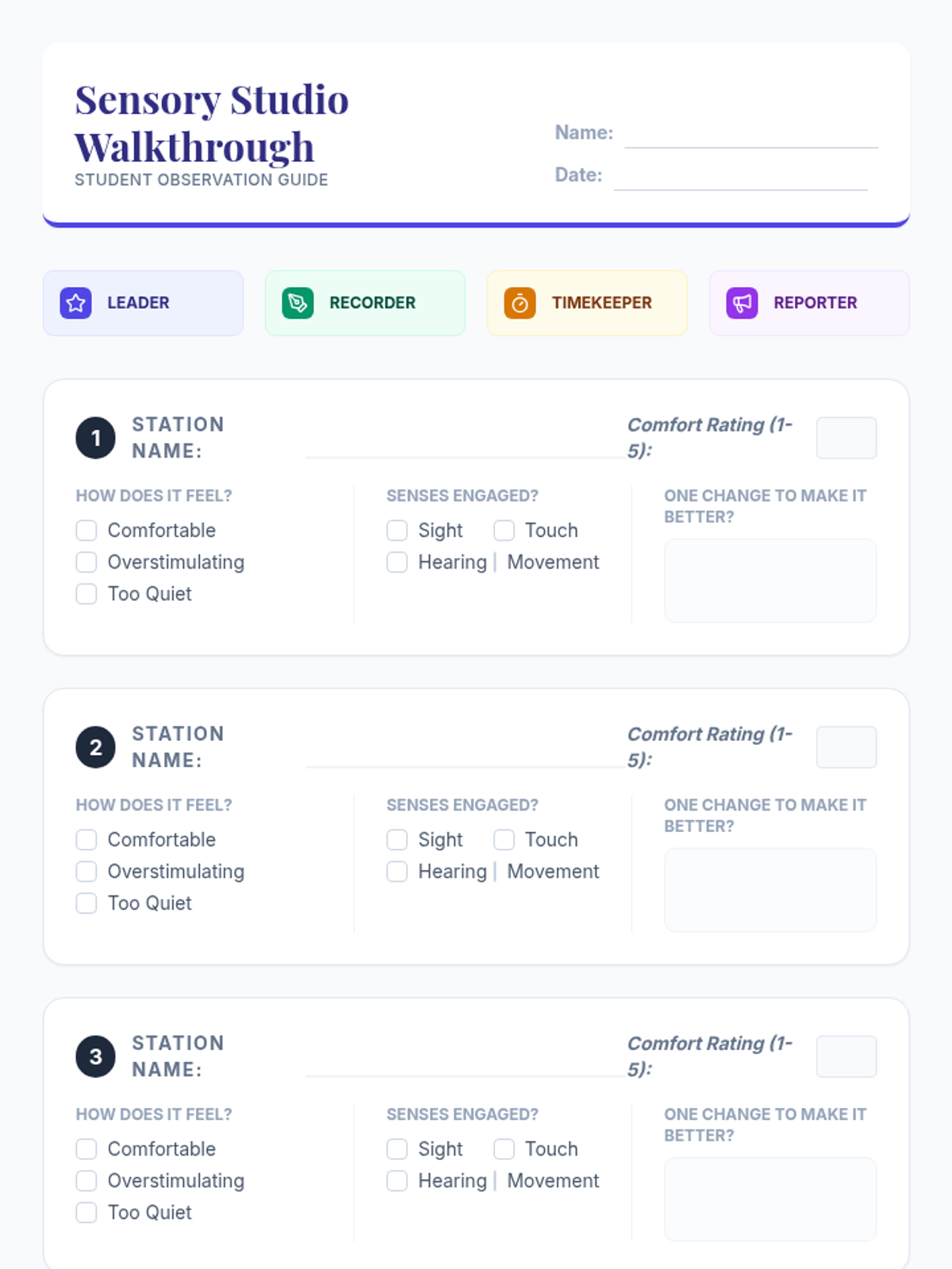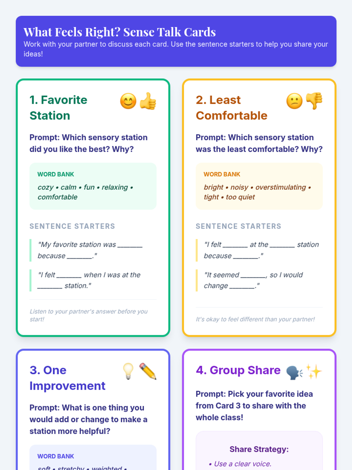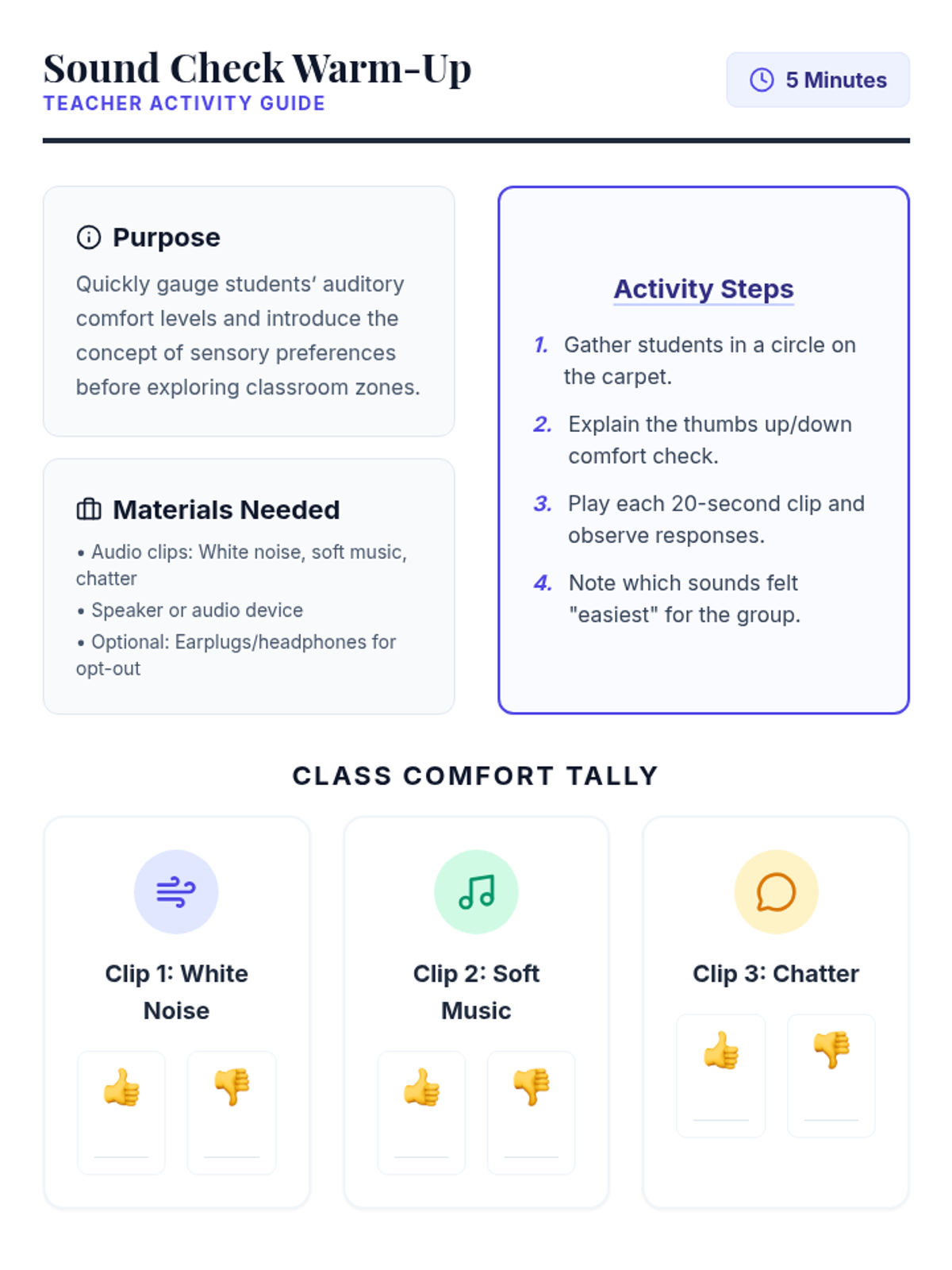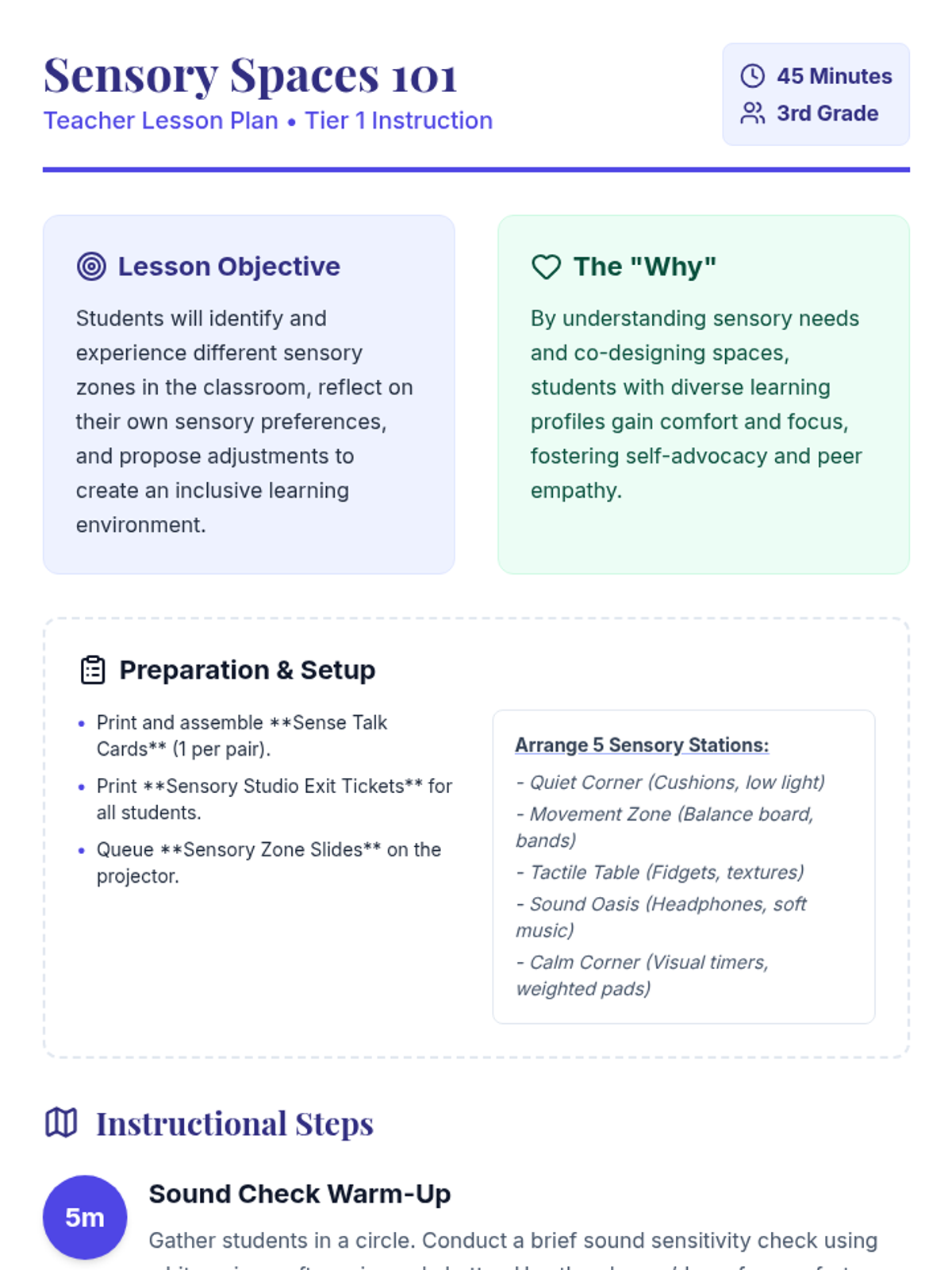 A 45-minute Tier 1 lesson guiding 3rd grade students through the exploration and co-creation of sensory-friendly classroom zones to support diverse learning needs and self-advocacy.