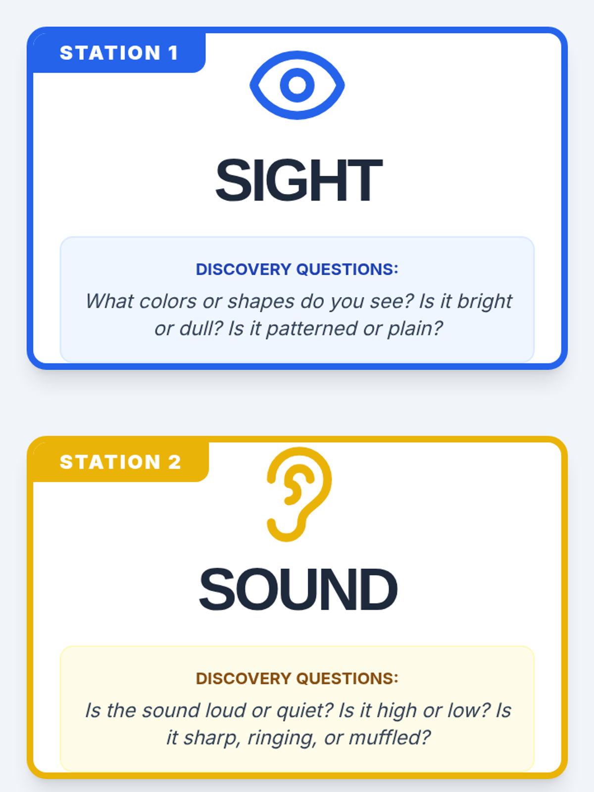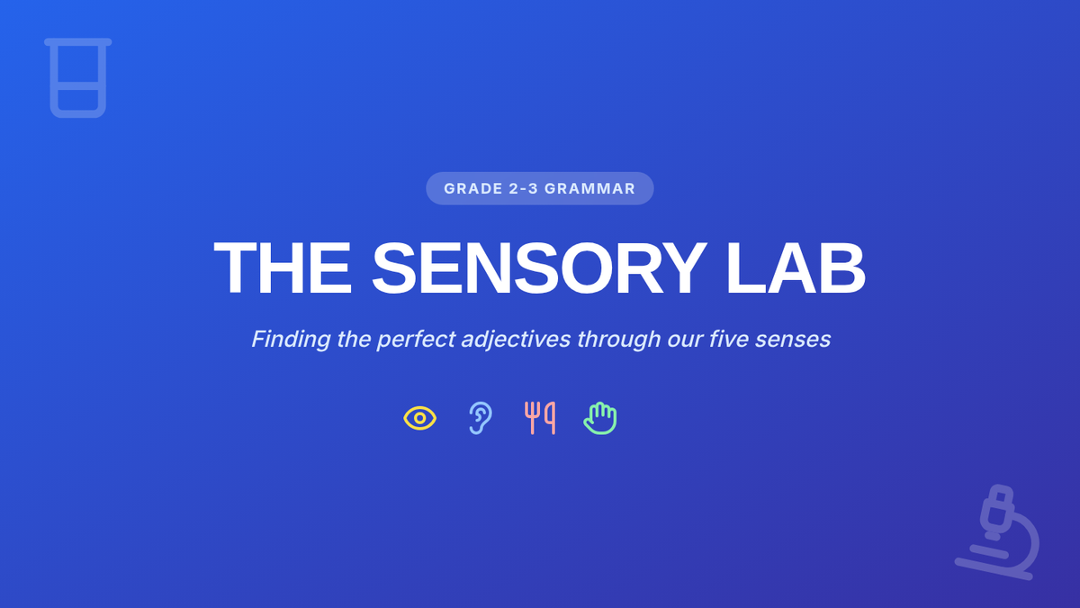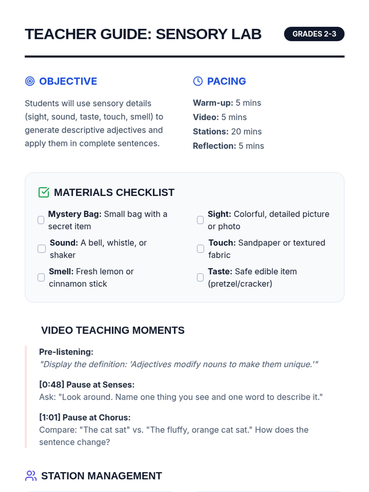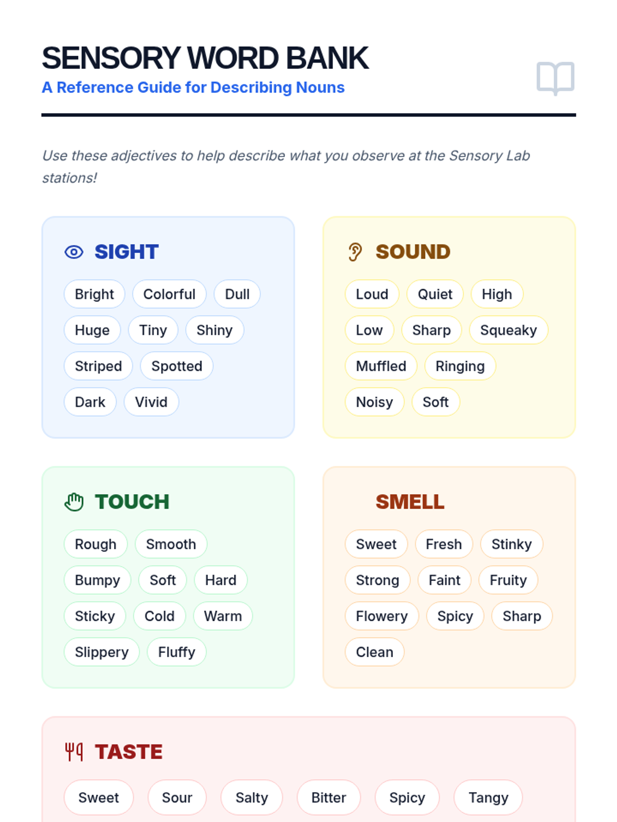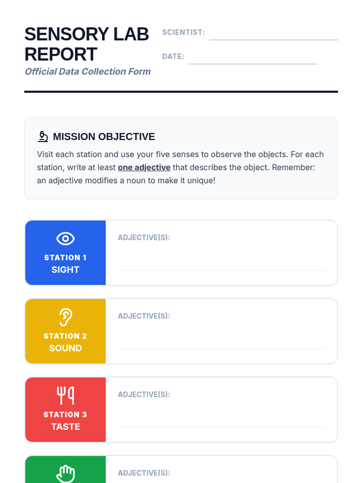 A hands-on exploration of adjectives where students use their five senses to describe various objects at investigation stations. This lesson incorporates music, mystery, and physical stimulus to help students understand how adjectives modify nouns.