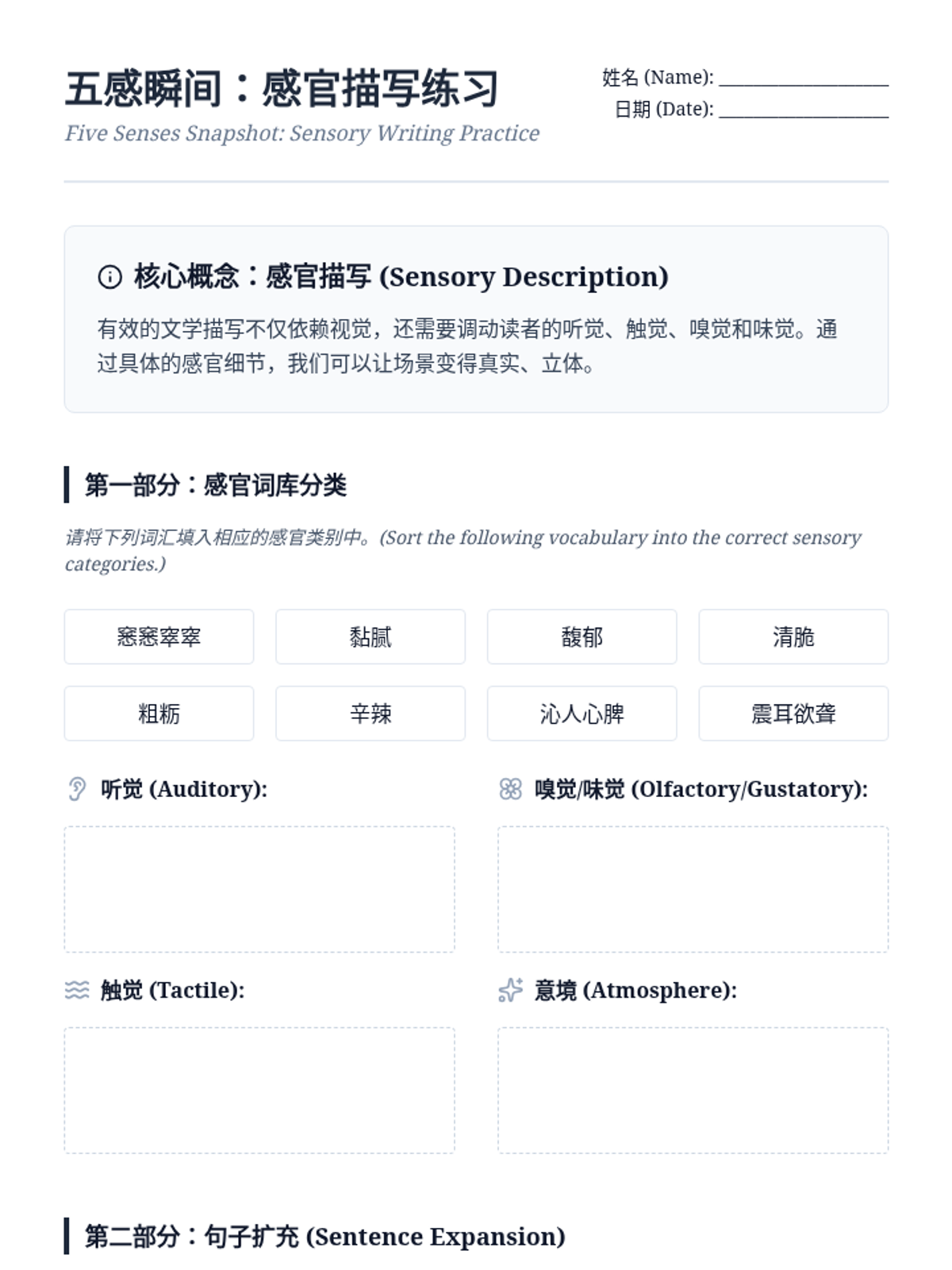 Students expand their descriptive vocabulary beyond visual adjectives to include sound, smell, and tactile words in Chinese. They practice writing 'snapshots' of scenes focusing on a single sense to create immersive environments.