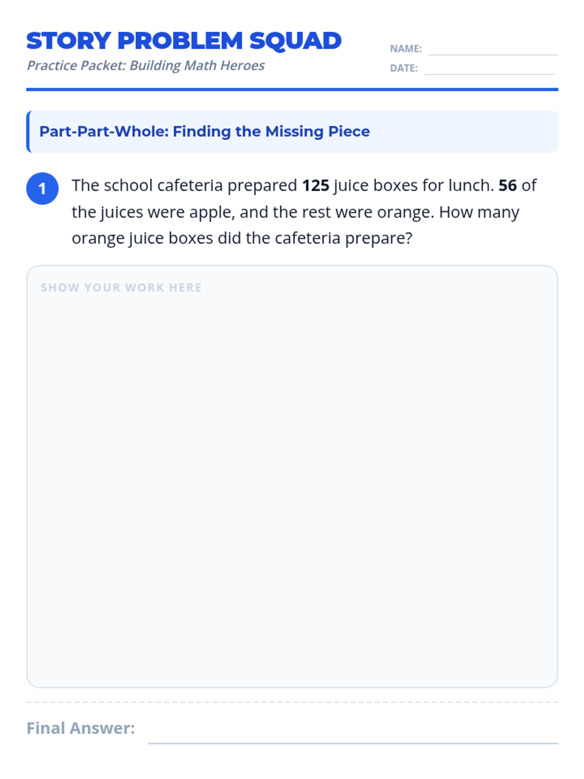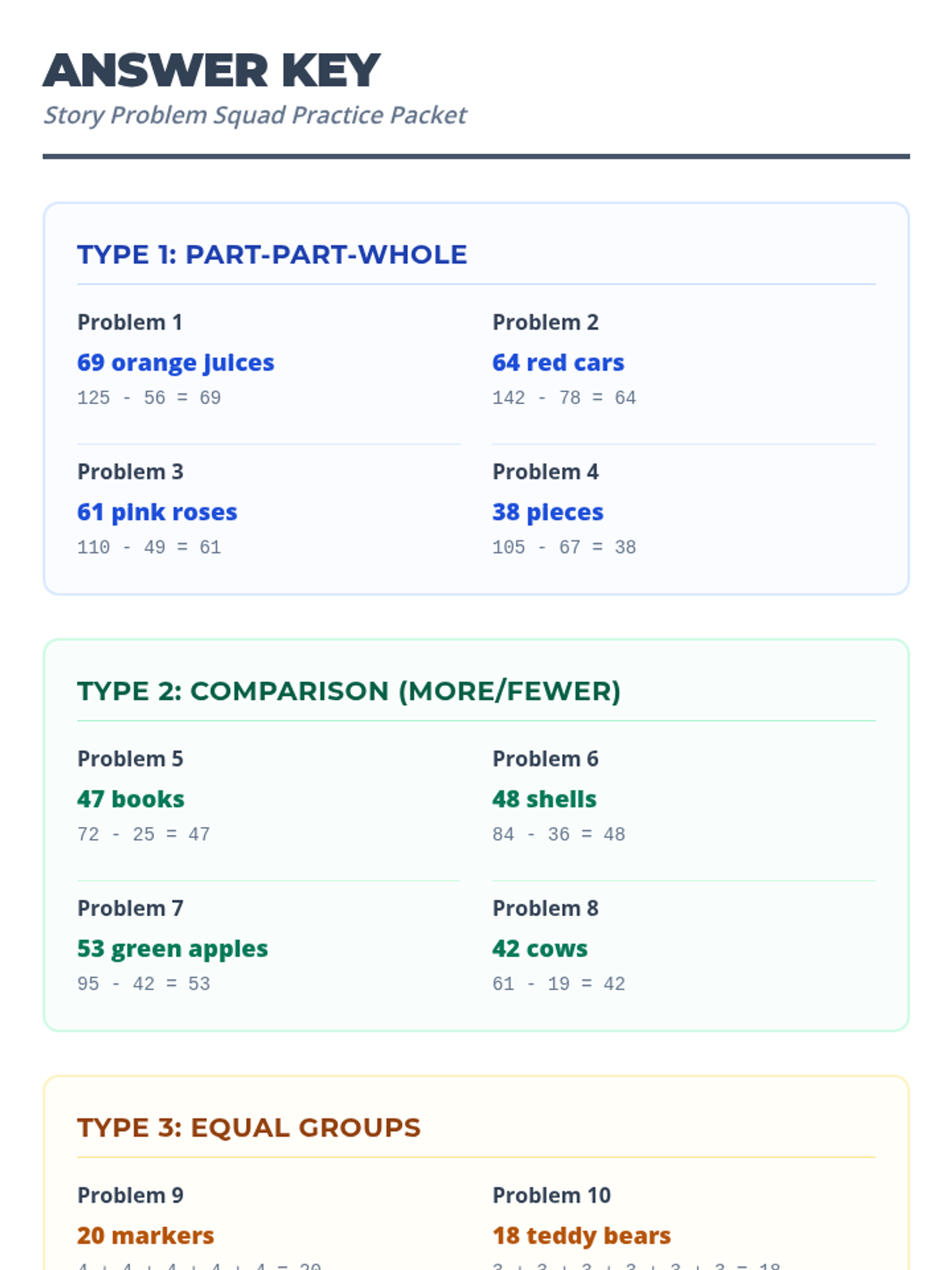 A comprehensive practice set focusing on the core word problem types encountered in 2nd grade math assessments, including part-part-whole, comparison, equal groups, and separate-start-unknown scenarios.