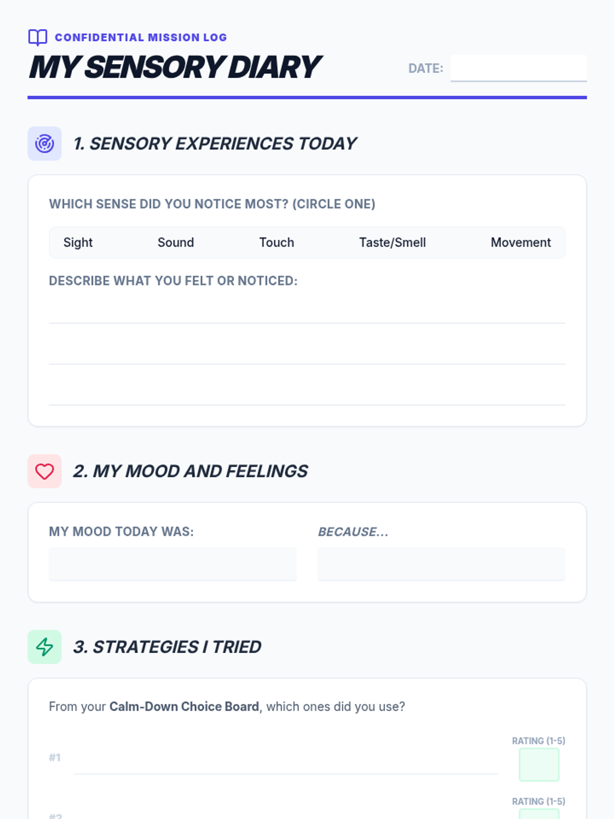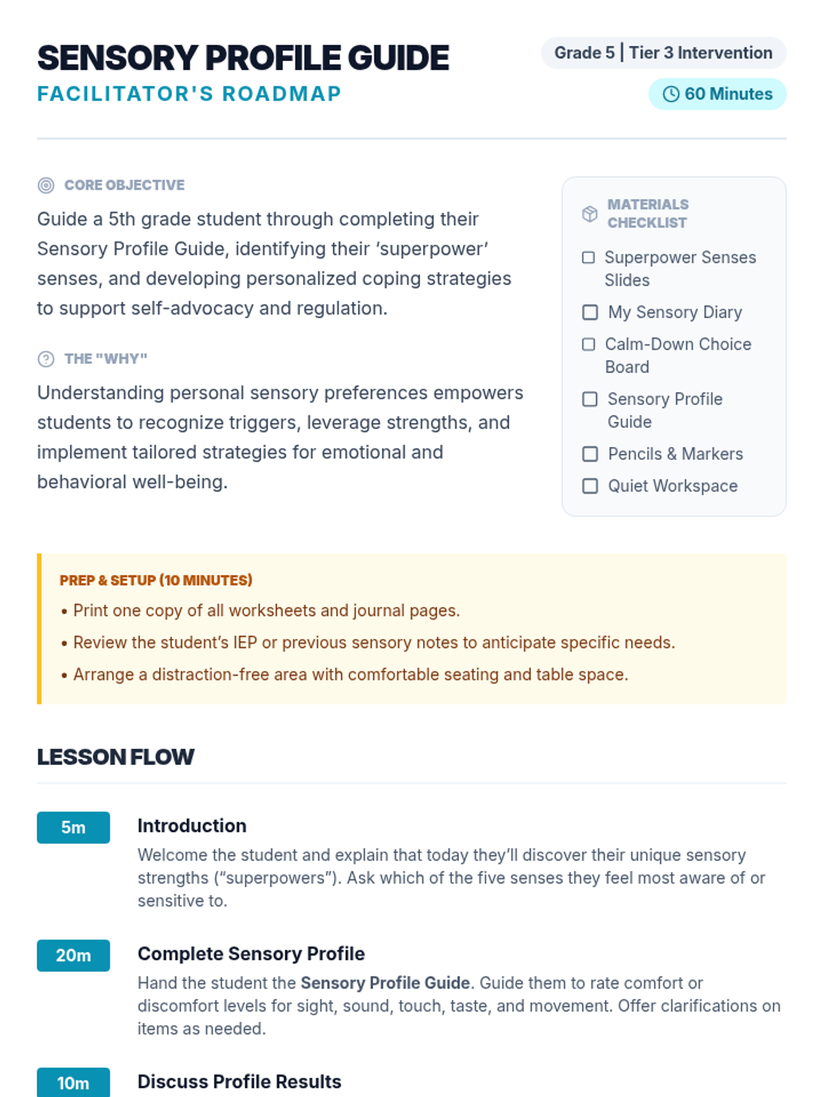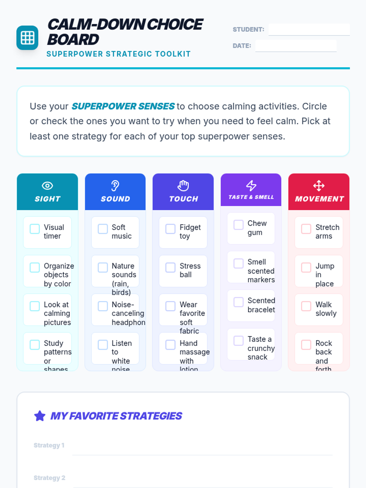 Individualized sessions for a 5th grade student to explore their unique sensory preferences and coping strategies, empowering them to self-advocate and self-regulate effectively.