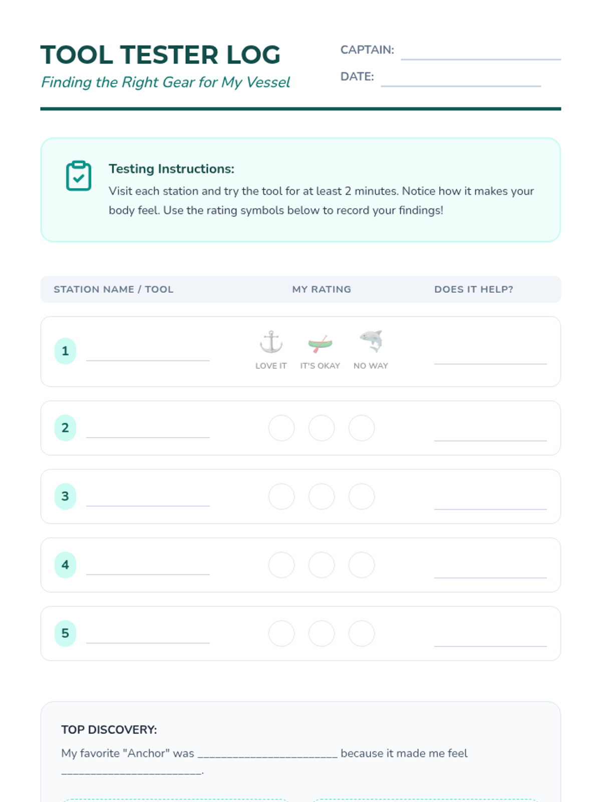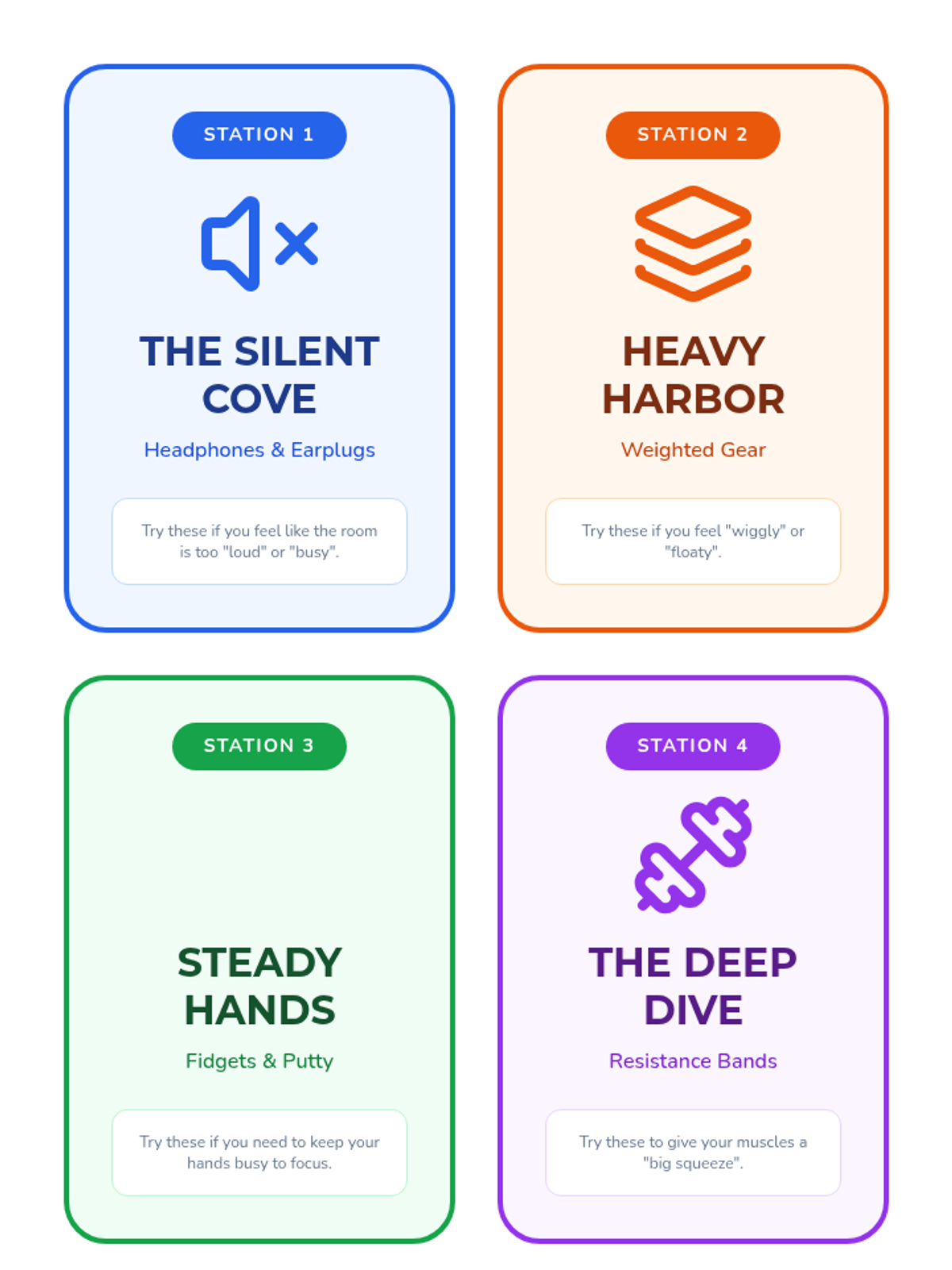 Students participate in a 'tasting menu' of sensory interventions, testing tools like weighted pads, noise-canceling headphones, and resistance bands. They rate the effectiveness of each tool in helping them feel grounded.