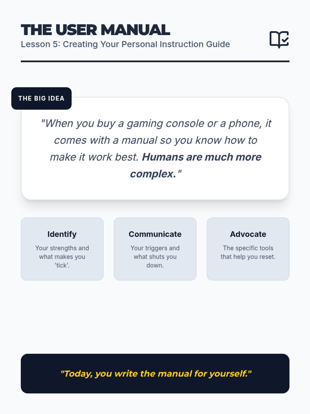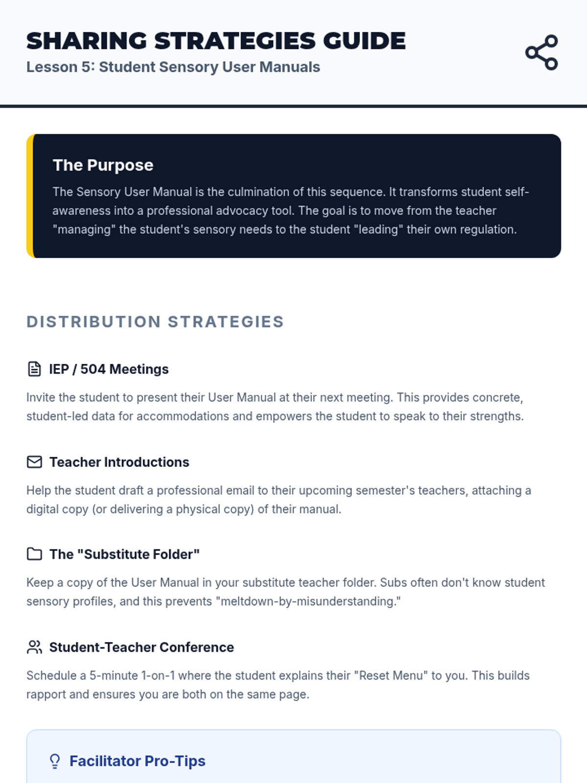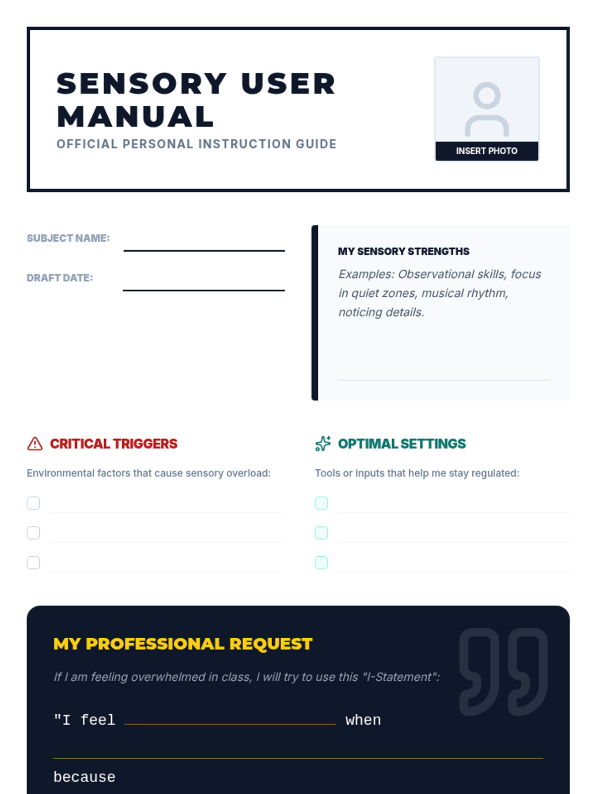 The sequence culminates in students creating a professional 'User Manual' for themselves. This document synthesizes their sensory profile for future teachers and staff.