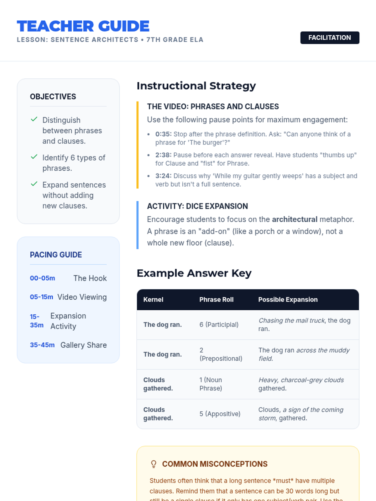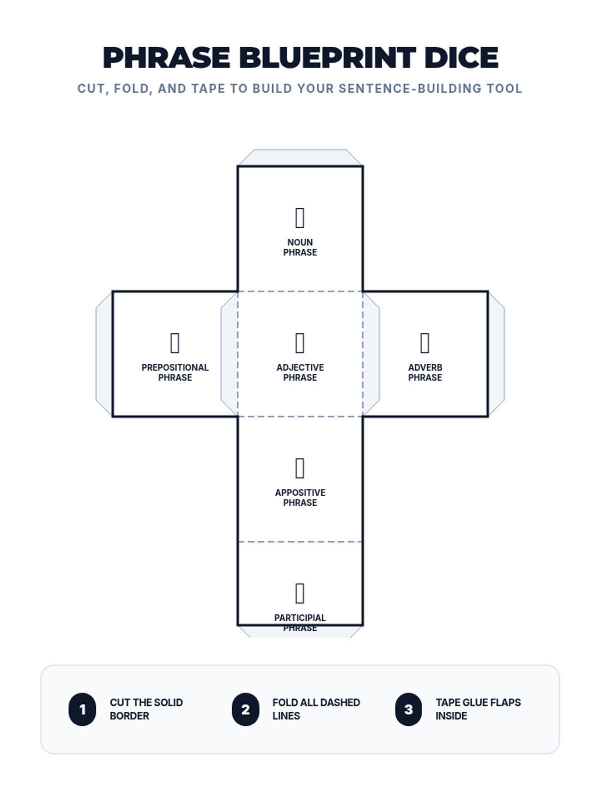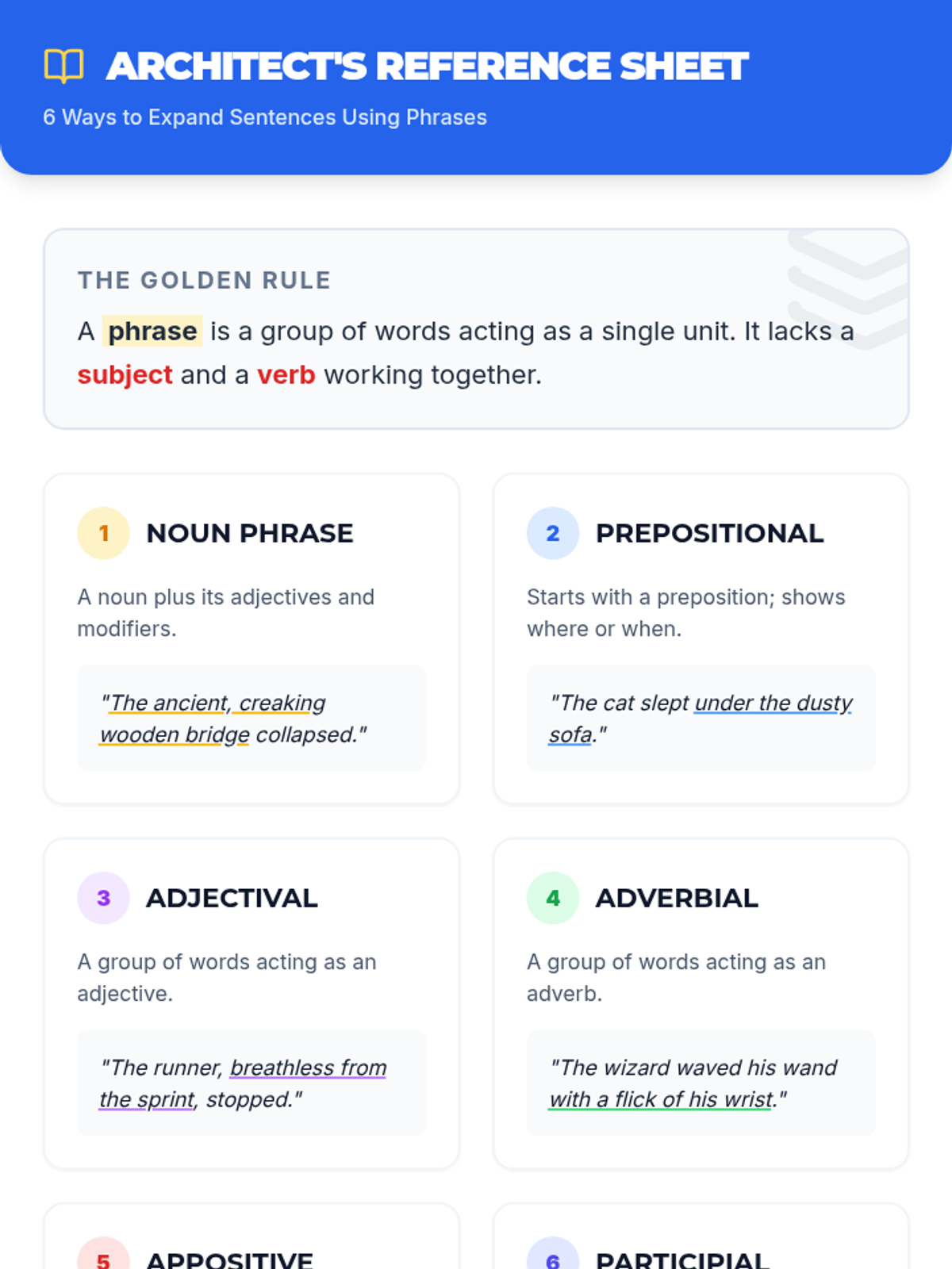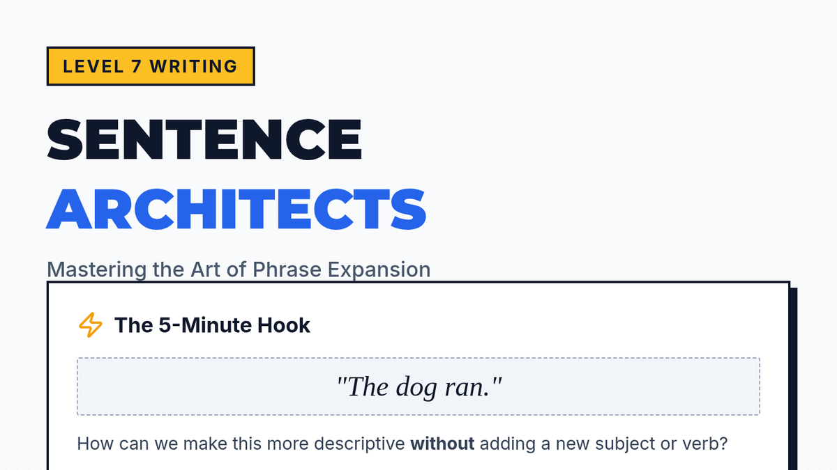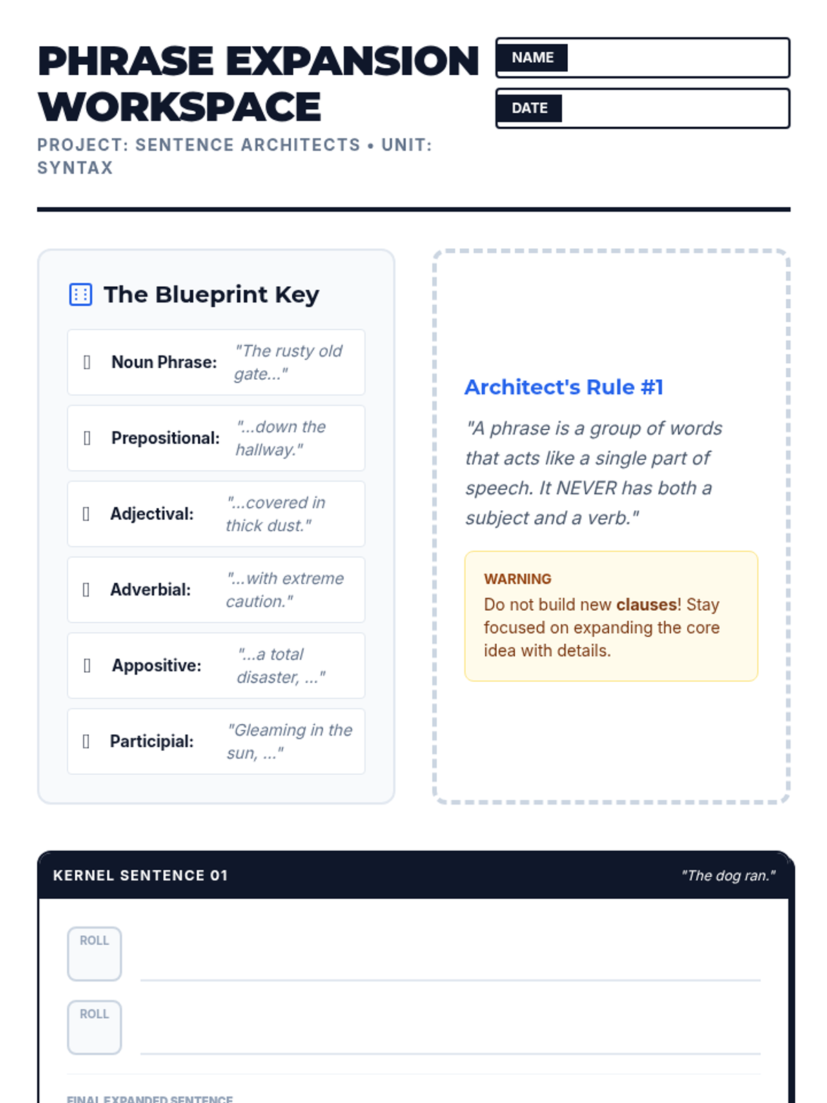 A 7th-grade writing lesson focused on using various phrase types (noun, adjective, adverb, prepositional, appositive, and participial) to expand simple kernel sentences into rich, descriptive prose without adding new clauses.