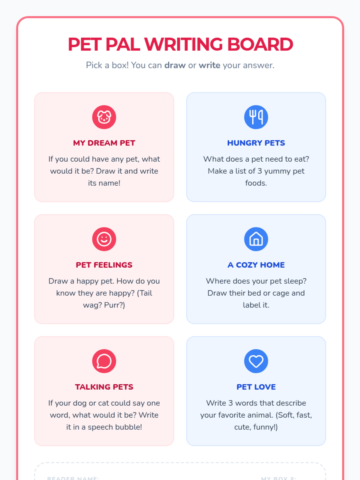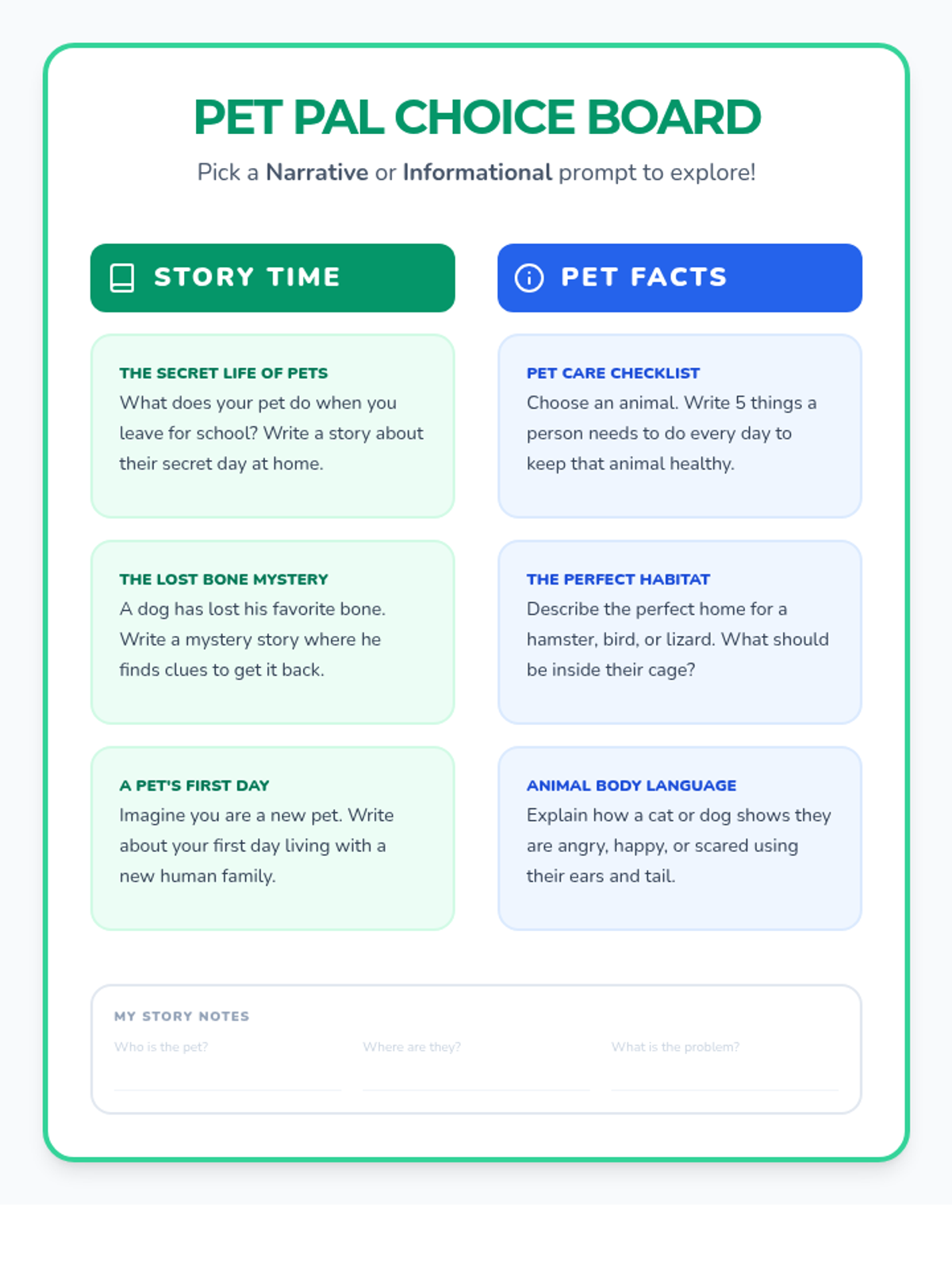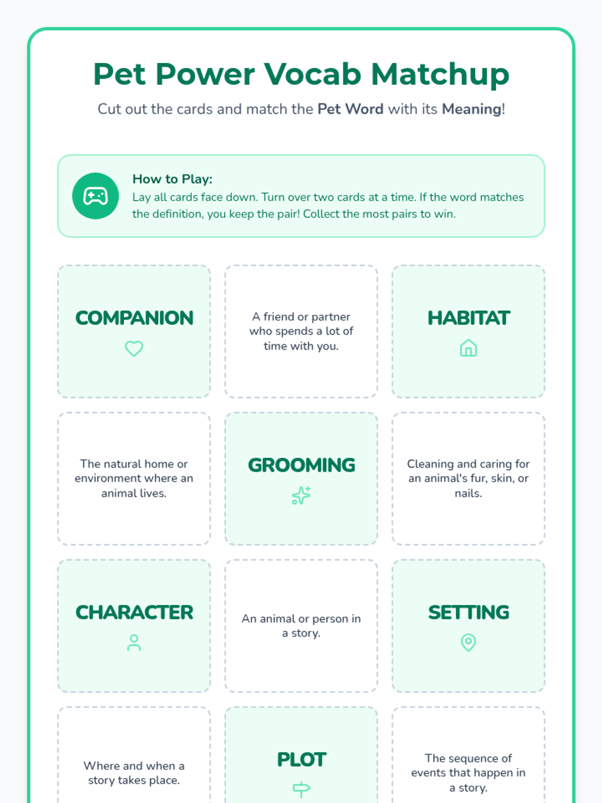 A collection of pet-themed literacy resources for a family literacy night, focusing on reading engagement, vocabulary building, and creative storytelling about animal companions.