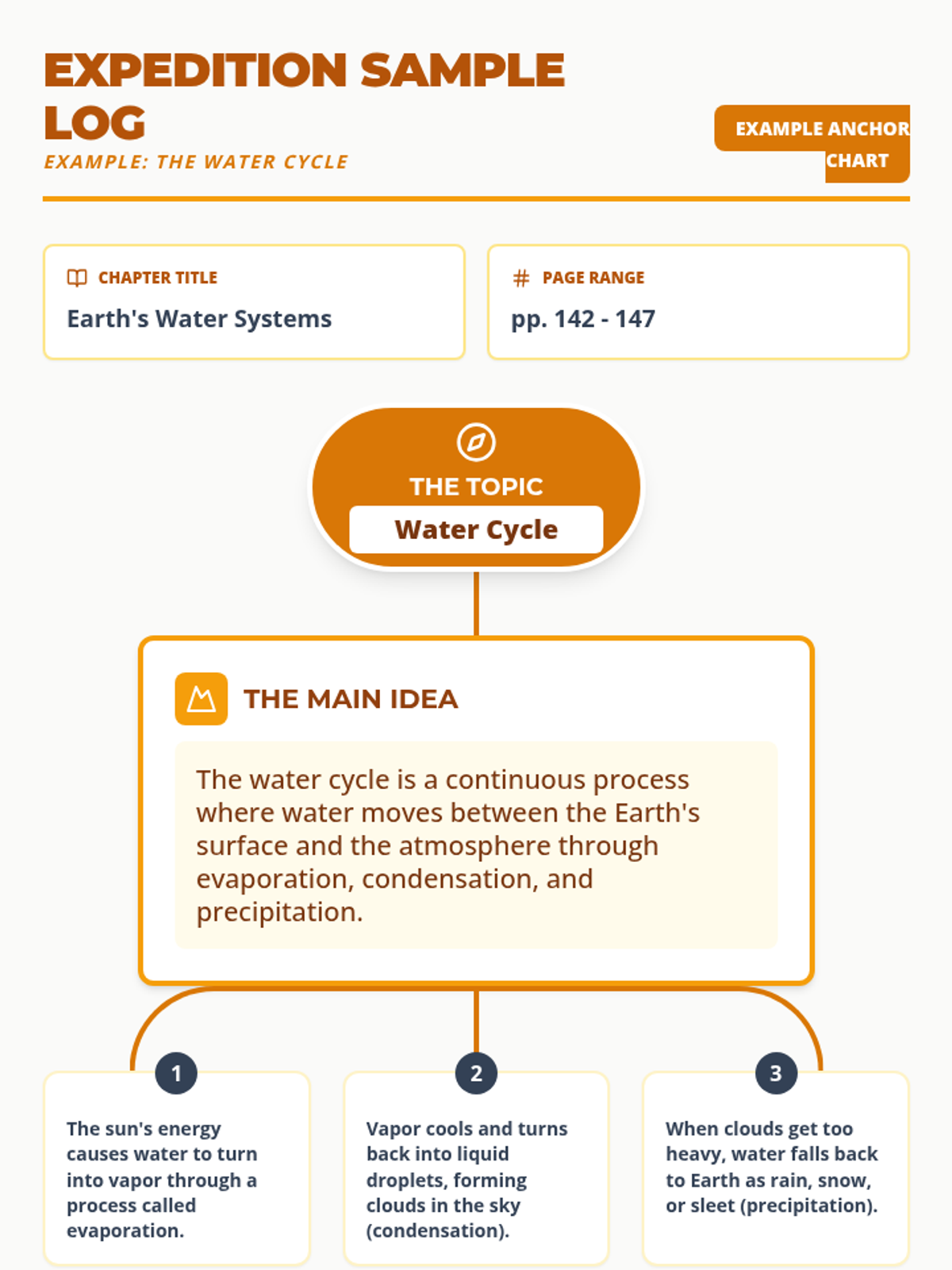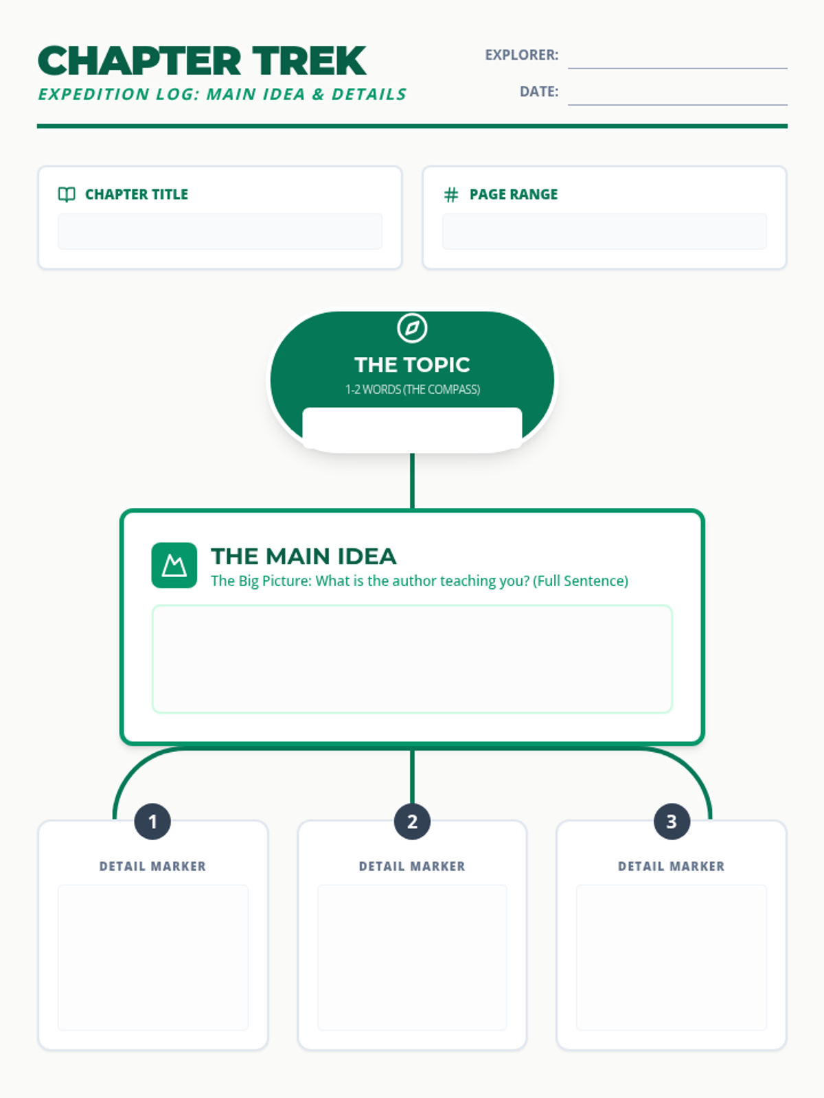 A lesson focused on identifying the topic, main idea, and supporting details in non-fiction textbook chapters using a 'Textbook Trek' expedition theme.