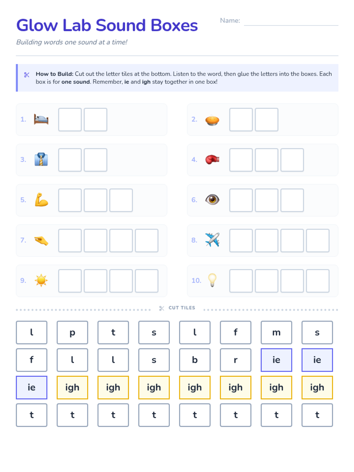 A lesson focused on identifying, building, and reading words with the 'ie' and 'igh' vowel patterns. Students will practice phonemic awareness and spelling through hands-on word construction.