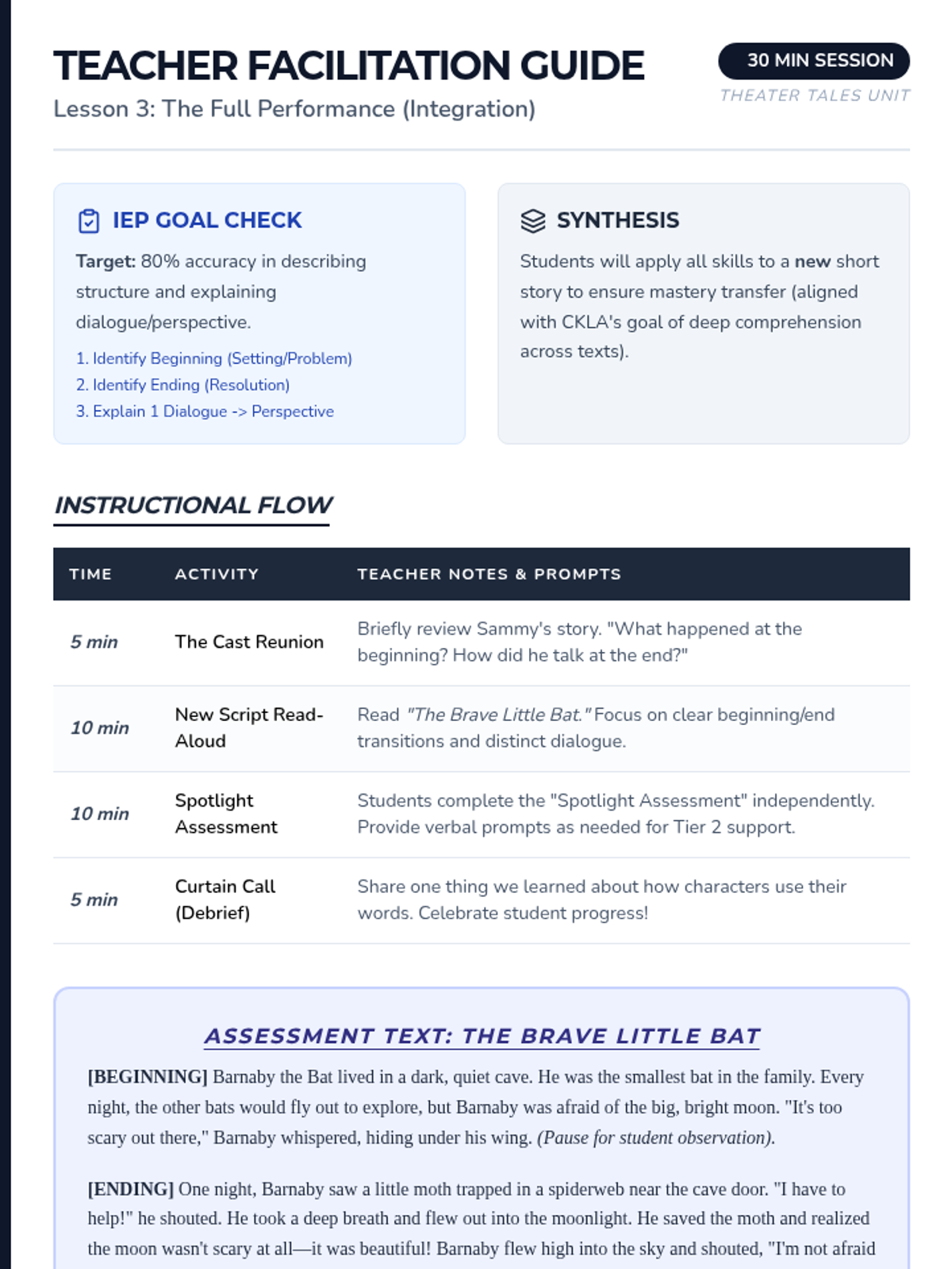 Integrates structure and dialogue analysis through a final performance review and assessment to measure IEP goal progress.