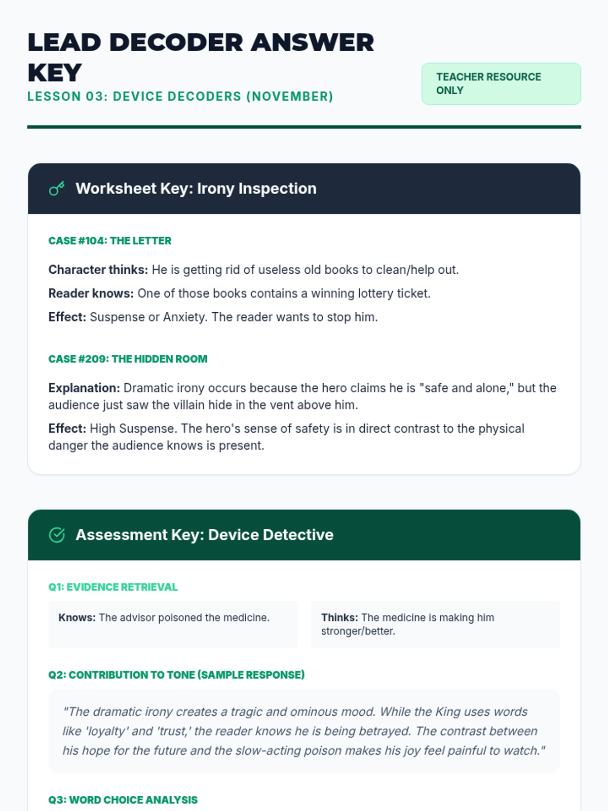 Focuses on identifying and explaining the contribution of literary devices, specifically dramatic irony and its effect on the reader.