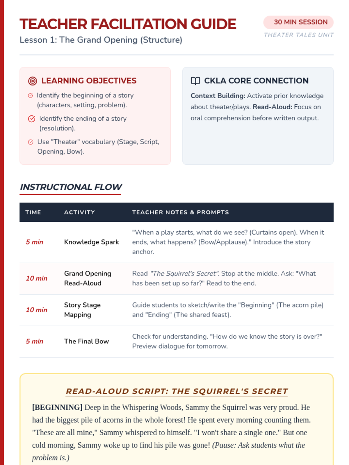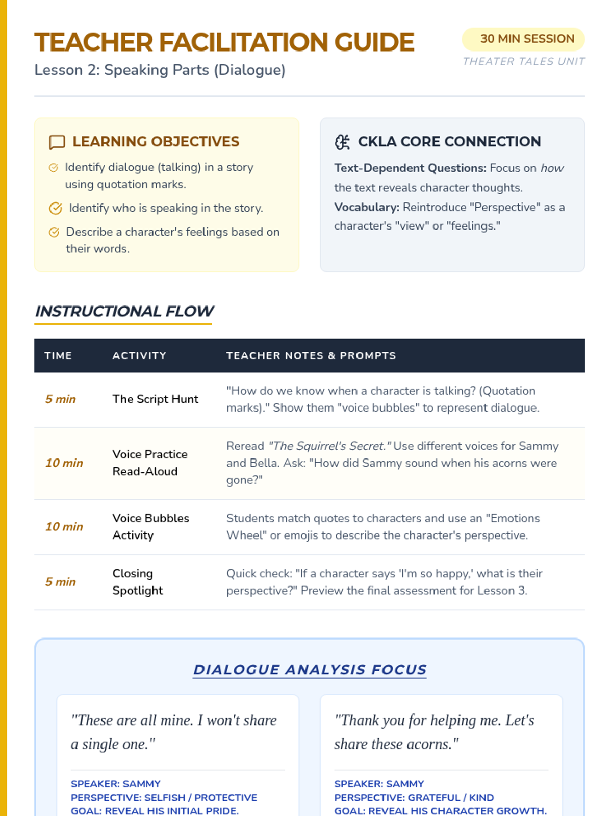 Students learn to identify the beginning and ending of a story and are introduced to dialogue as a way to understand character feelings. Uses 'The Lion and the Mouse' as the anchor text.