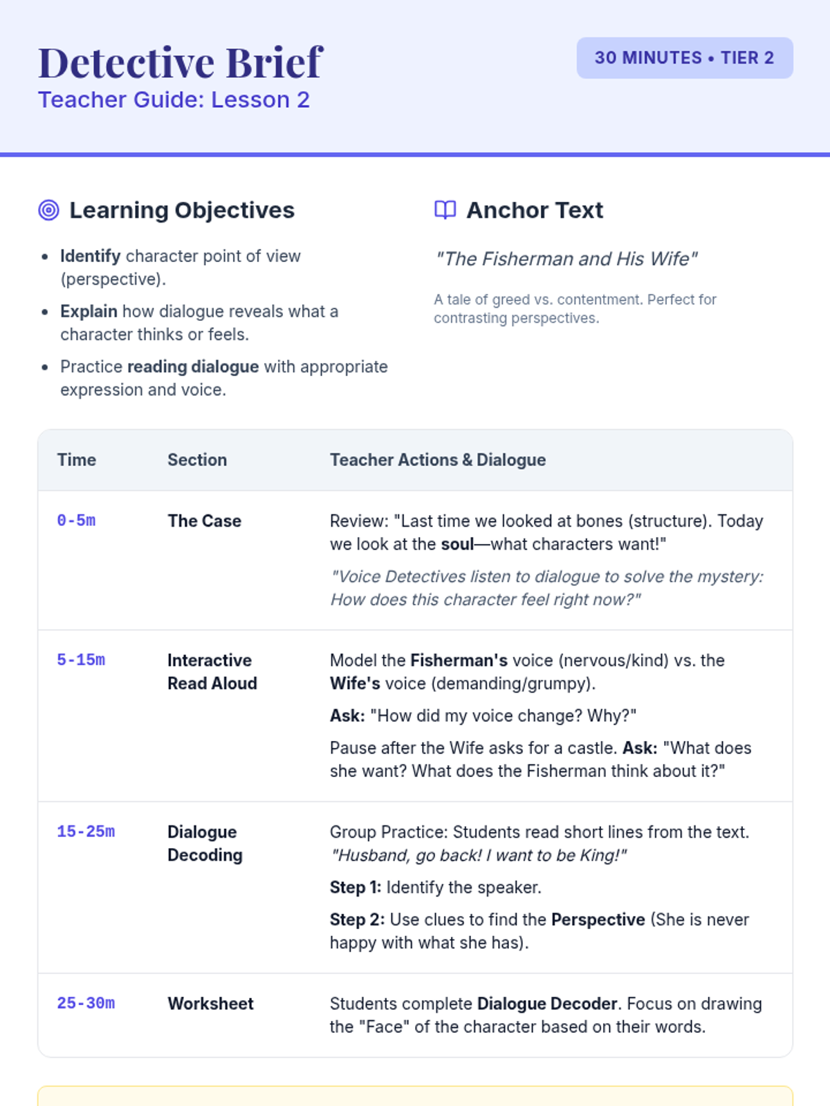Students focus on how dialogue reveals character perspective and practice reading with expression to match point of view. Uses 'The Fisherman and His Wife' as the anchor text.