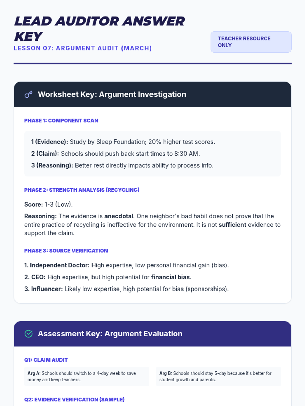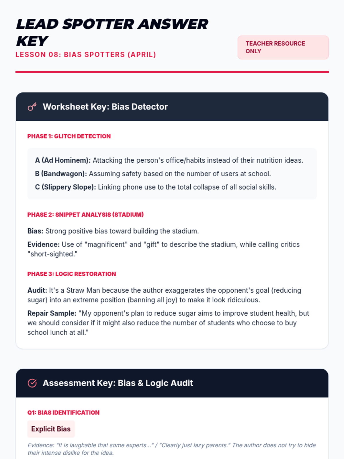Identifies author biases and logical fallacies in complex informational texts to determine their impact on an argument.